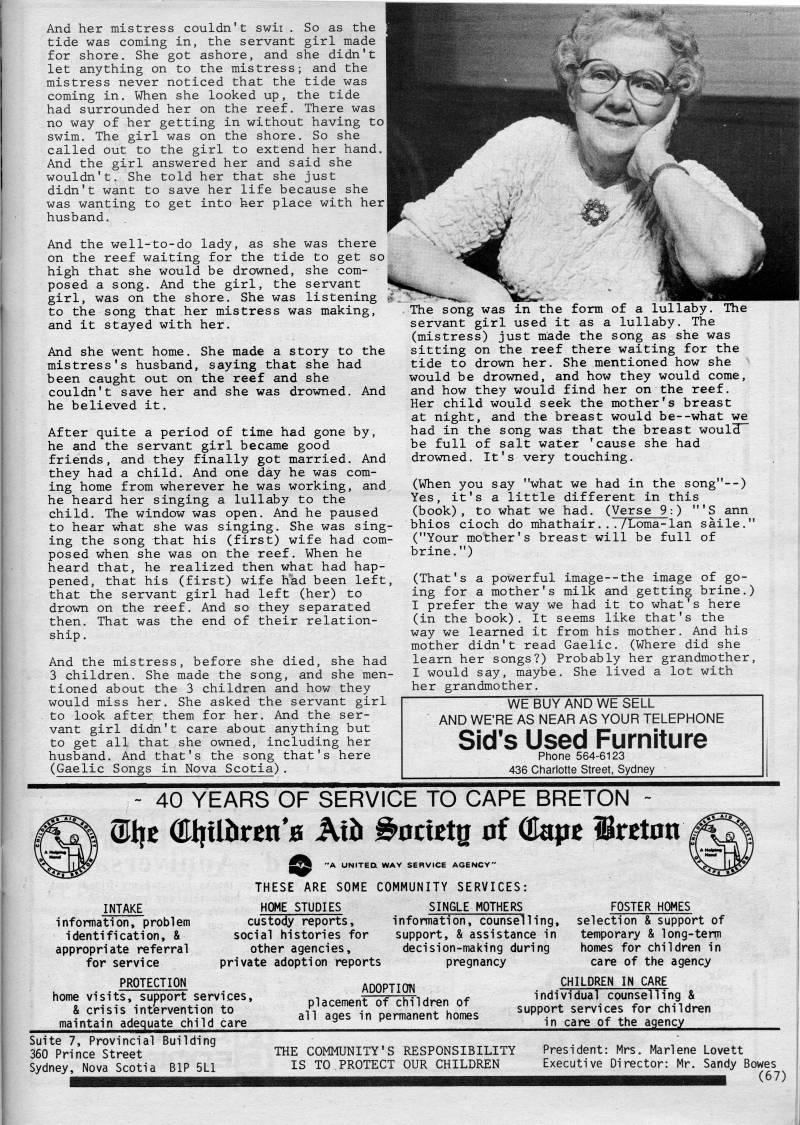 Published by Ronald Caplan on 1987/8/1 (157 reads)And her mistress couldn't swii . So as the tide was coming in, the servant girl made for shore. She got ashore, and she didn't let anything on to the mistress; and the mistress never noticed that the tide was coming in. When she looked up, the tide had surrounded her on the reef. There was no way of her getting in without having to swim. The girl was on the shore. So she called out to the girl to extend her hand. And the girl answered her and said she wouldn't. She told her that she just didn't want to save her life because she was wanting to get into her place with her husband. And the well-to-do lady, as she was there on the reef waiting for the tide to get so high that she would be drowned, she com? posed a song. And the girl, the servant girl, was on the shore. She was listening to the song that her mistress was making, and it stayed with her. And she went home. She made a story to the mistress's husband, saying that she had been caught out on the reef and she couldn't save her and she was drowned. And he believed it. After quite a period of time had gone by, he and the servant girl became good friends, and they finally got married. And they had a child. And one day he was com? ing home from wherever he was working, and he heard her singing a lullaby to the child. The window was open. And he paused to hear what she was singing. She was sing? ing the song that his (first) wife had com? posed when she was on the reef. When he heard that, he realized then what had hap? pened, that his (first) wife h'ad been left, that the servant girl had left (her) to drown on the reef. And so they separated then. That was the end of their relation? ship. And the mistress, before she died, she had 3 children. She made the song, and she men? tioned about the 3 children and how they would miss her. She asked the servant girl to look after them for her. And the ser? vant girl didn't care about anything but to get all that she owned, including her husband. And that's the song that's here (Gaelic Songs in Nova Scotia). The song was in the form of a lullaby. The servant girl used it as a lullaby. The (mistress) just made the song as she was sitting on the reef there waiting for the tide to drown her. She mentioned how she would be drowned, and how they would come, and how they would find her on the reef. Her child would seek the mother's breast at night, and the breast would be--what we had in the song was that the breast woulH~ be full of salt water 'cause she had drowned. It's very touching, (When you say "what we had in the song"--) Yes, it's a little different in this (book), to what we had. (Verse 9:) "'S ann bhios cioch do mhathair.../Loma-lan saile." ("Your mother's breast will be full of brine.") (That's a powerful image--the image of go? ing for a mother's milk and getting brine.) I prefer the way we had it to what's here (in the book). It seems like that's the way we learned it from his mother. And his mother didn't read Gaelic. (Where did she learn her songs?) Probably her grandmother, I would say, maybe. She lived a lot with her grandmother. WE BUY AND WE SELL AND WE'RE AS NEAR AS YOUR TELEPHONE Sid's Used Furniture Phone 564-6123 436 Charlotte Street, Sydney - 40 YEARS OF SERVICE TO CAPE BRETON - ?I|E