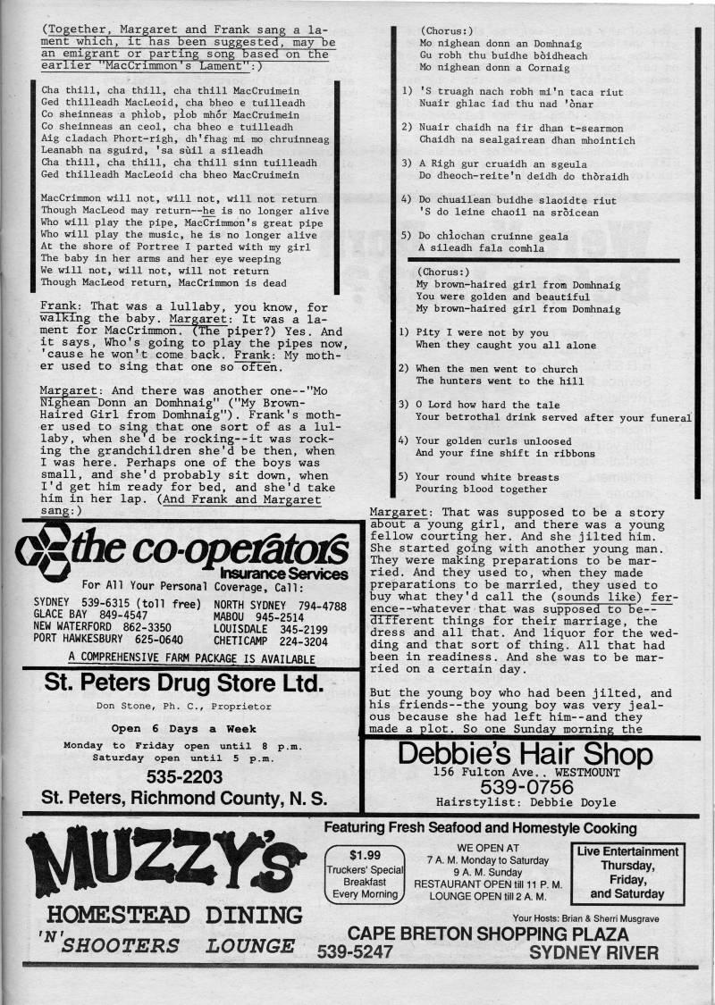 Published by Ronald Caplan on 1987/8/1 (233 reads)(Together, Margaret and Frank sang a la? ment which, it has been suggested" may be an einigrant or parting song based on the " earlier "MacCrimmon's Lament":) Cha thill, cha thill, cha thill MacCruimein Ged thilleadh MacLeoid, cha bheo e tuilleadh Co sheinneas a phiob, piob mhor MacCruimein Co sheinneas an ceol, cha bheo e tuilleadh Aig cladach Phort-righ, dh'fhag ml mo chruinneag Leanabh na sguird, 'sa suil a sileadh Cha thill, cha thill, cha thill sinn tuilleadh Ged thilleadh MacLeoid cha bheo MacCruimein MacCrimmon will not, will not, will not return Though MacLeod may return • 'he is no longer alive Who will play the pipe, MacCrimmon's great pipe Who will play the music, he is no longer alive At the shore of Portree I parted with my girl The baby in her arms and her eye weeping We will not, will not, will not return Though MacLeod return, MacCrimmon is dead Frank: That was walking the baby. lullaby, you know, for Margaret: It was a la- And ment for MacCrimmon. (The piper?) Yes. it says, Who's going to play the pipes now, 'cause he won't come back. Frank: My moth? er used to sing that one so often. Margaret: And there was another one--"Mo Nighean Donn an Domhnaig" ("My Brown- Haired Girl from Domhnaig"). Frank's moth? er used to sing that one sort of as a lul? laby, when she'd be rocking--it was rock? ing the grandchildren she'd be then, when I was here. Perhaps one of the boys was small, and she'd probably sit down, when I'd get him ready for bed, and she'd take him in her lap. (And Frank and Margaret sang:) iRtiie cocpaMo' ''' Insurance Services For All Your Personal Coverage, Call: SYDNEY 539-6315 (toll free) NORTH SYDNEY 794-4788 GLACE BAY 849-4547 MABOU 945-2514 NEW WATERFORD 862-3350 LOUISDALE 345-2199 PORT HAWKESBURY 625-0640 CHETICAMP 224-3204 A COMPREHENSIVE FARM PACKAGE IS AVAILABLE St. Peters Drug Store Ltd. Don Stone, Ph. C, Proprietor Open 6 Days a Week Monday to Frid&y; open until 8 p.m. Saturday open until 5 p.m. 535-2203 St. Peters, Richmond County, N. S. (Chorus:) Mo nighean donn an Domhnaig Gu robh thu buidhe boidheach Mo nighean donn a Cornaig 1) 'S truagh nach robh mi'n taca riut Nuair ghlac iad thu nad 'onar 2) Nuair chaidh na fir dhan t-searmon Chaidh na sealgairean dhan mhointich 3) A Righ gur cruaidh an sgeula Do dheoch-relte'n deidh do thoraidh 4) Do chuailean buidhe slaoidte riut 'S do leine chaoil na sroicean 5) Do chiochan cruinne geala A sileadh fala comhla (Chorus:) My brown-haired girl from Domhnaig You were golden and beautiful My brown-haired girl from Domhnaig 1) Pity I were not by you When they caught you all alone 2) When the men went to church The hunters went to the hill 3) 0 Lord how hard the tale Your betrothal drink served after your funeral 4) Your golden curls unloosed And your fine shift in ribbons 5) Your round white breasts Pouring blood together Margaret: That was supposed to be a story about a young girl, and there was a young fellow courting her. And she jilted him. She started going with another young man. They were making preparations to be mar? ried. And they used to, when they made preparations to be married, they used to buy what they'd call the (sounds like) fer- ence--whatever that was supposed to be-- different things for their marriage, the dress and all that. And liquor for the wed? ding and that sort of thing. All that had been in readiness. And she was to be mar? ried on a certain day. But the young boy who had been jilted, and his friends--the young boy was very jeal? ous because she had left him--and they made a plot. So one Sunday rooming the ' SL Debbie's Hair Shop 156 Fulton Ave. . WESTMOUNT 539-0756 Hairstylist: Debbie Doyle HOMESTEAD DINING Featuring Fresh Seafood and Homestyie Cooiiing f $1.99 Truckers' Special Breakfast I Every Morning WE OPEN AT 7 A. M. IVIonday to Saturday 9 A. M. Sunday RESTAURANT OPEN till 11 P. M. LOUNGE OPEN till 2 A.M. Live Entertainment Thursday, Friday, and Saturday 'N SHOOTERS LOUNGE Your Hosts: Brian & Sherri Musgrave CAPE BRETON SHOPPING PLAZA 539-5247 SYDNEY RIVER