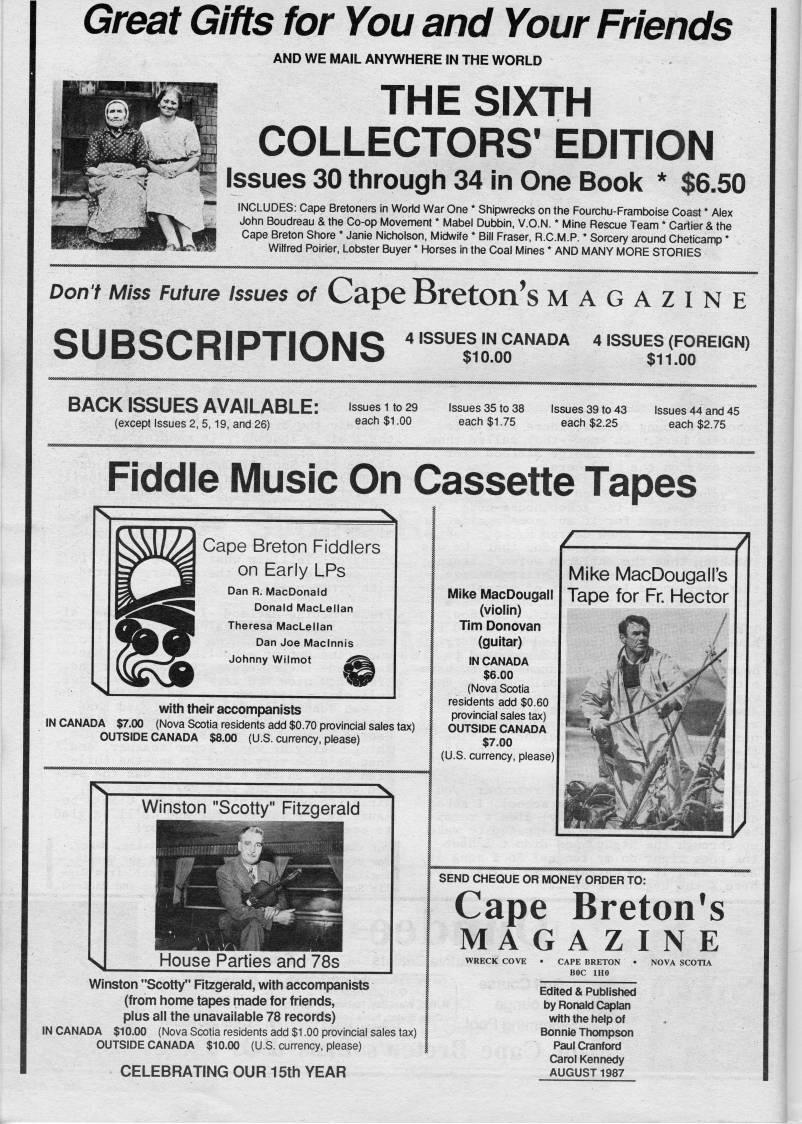 Published by Ronald Caplan on 1987/8/1 (141 reads)Great Gifts for You and Your Friends AND WE MAIL ANYWHERE IN THE WORLD THE SIXTH COLLECTORS' EDITION Issues 30 through 34 In One Book * $6.50 INCLUDES: Cape Bretoners in World War One * Shipwrecks on the Fourchu-Framboise Coast * Alex John Boudreau & the Co-op Movement * Mabel Dubbin, V.O.N. * Mine Rescue Team * Cartier & the Cape Breton Shore * Janie Nicholson, Midwife * Bill Fraser, R.C.M.P. * Sorcery around Cheticamp * Wilfred Poirier, Lobster Buyer * Horses in the Coal Mines * AND MANY MORE STORIES Dont iVIIss Future Issues of CapeBretOn's MAGAZINE SUBSCRIPTIONS '''''t'Ho''''' '"'"''f''Sr'''''' BACK ISSUES AVAILABLE: (except Issues 2, 5,19, and 26) Issues 1 to 29 each $1.00 Issues 35 to 38 each $1.75 Issues 39 to 43 each $2.25 Issues 44 and 45 each $2.75 Fiddle Music On Cassette Tapes Cape Breton Fi(j(dlers on Early LPs Dan R. MacDonald Donald MacLellan Theresa MacLellan Dan Joe Maclnnis Johnny Wilmot with their accompanists IN CANADA $7.00 (Nova Scotia residents add $0.70 provincial sales tax) OUTSIDE CANADA $8.00 (U.S. cun-ency, please) Winston "Scotty" Fitzgerald House Parties and 78s Winston "Scotty" Fitzgerald, with accompanists (from home tapes made for friends, plus all the unavailable 78 records) IN CANADA $10.00 (Nova Scotia residents add $1.00 provincial sales tax) OUTSIDE CANADA $10.00 (U.S. currency, please) CELEBRATING OUR 15th YEAR Mike MacDougall (violin) Tim Donovan (guitar) IN CANADA $6.00 (Nova Scotia residents add $0.60 provincial sales tax) OUTSIDE CANADA $7.00 (U.S. currency, please) Mike MacDougairs Tape for Fr. Hector SEND CHEQUE OR MONEY ORDER TO: Cape Breton's MA G A Z IN E WRECK COVE NOVA SCOTIA Edited & Published by Ronald Caplan with the help of Bonnie Thompson Paul Cranford Carol Kennedy AUGUST 1987