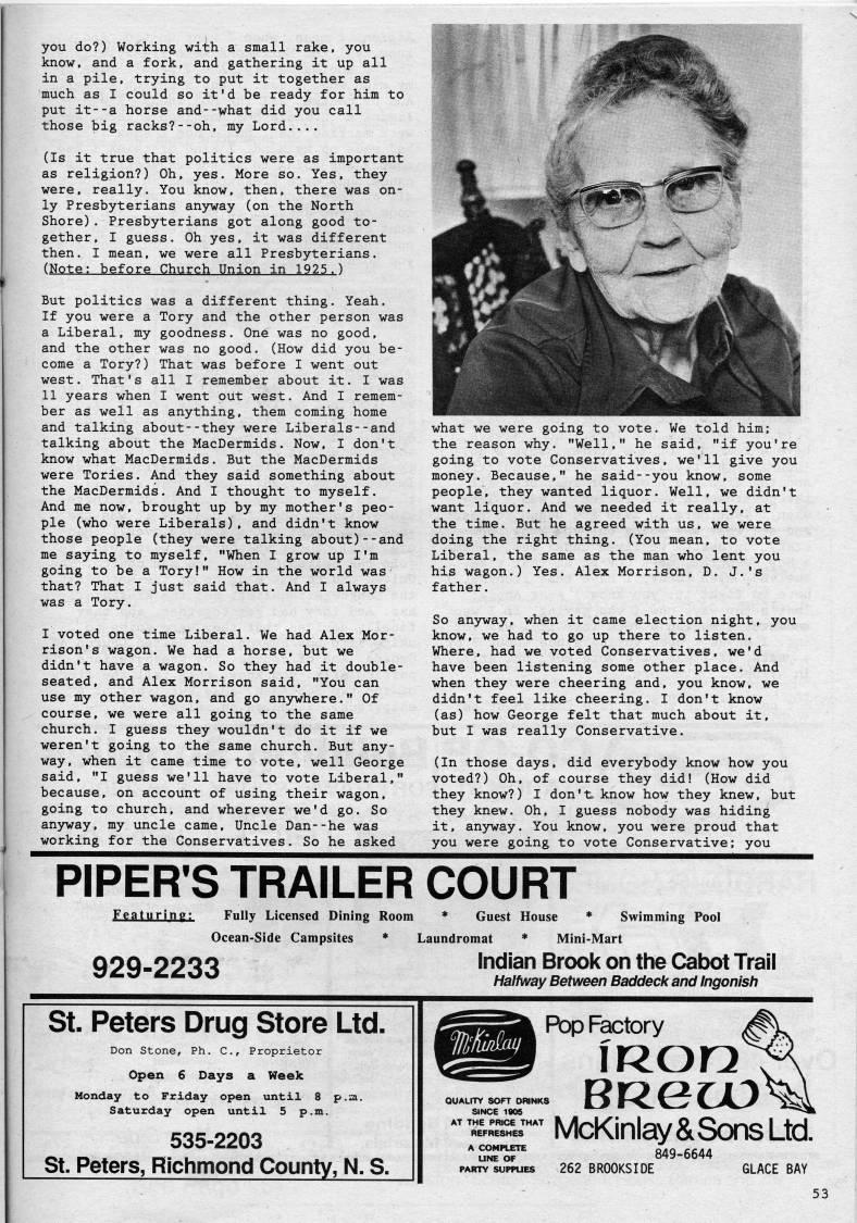 Published by Ronald Caplan on 1988/6/1 (143 reads)you do?) Working with a small rake, you know, and a fork, and gathering it up all in a pile, trying to put it together as much as I could so it'd be ready for him to put it--a horse and--'Khat did you call those big racks?--oh, my Lord.... (Is it true that politics were as important as religion?) Oh, yes. More so. Yes, they were, really. You know, then, there was on? ly Presbyterians anyway (on the North Shore). Presbyterians got along good to? gether, I guess. Oh yes, it was different then. I mean, we were all Presbyterians. (Note: before Church Union in 1925.) But politics was a different thing. Yeah. If you were a Tory and the other person was a Liberal, my goodness. One was no good, and the other was no good. (How did you be? come a Tory?) That was before I went out west. That's all I remember about it. I was 11 years when I went put west. And I remem? ber as well as anything, them coming home and talking about--they were Liberals--and talking about the MacDermids. Now, I don't know what MacDermids. But the MacDermids were Tories. And they said something about the MacDermids. And I thought to myself. And me now, brought up by my mother's peo? ple (who were Liberals), and didn't know those people (they were talking about)--and me saying to myself, "When I grow up I'm going to be a Tory!" How in the world was that? That I just said that. And I always was a Tory. I voted one time Liberal. We had Alex Mor? rison's wagon. We had a horse, but we didn't have a wagon. So they had it double- seated, and Alex Morrison said, "You can use my other wagon, and go an3rwhere." Of course, we were all going to the same church. I guess they wouldn't do it if we weren't going to the same church. But any? way, when it came time to vote, well George said, "I guess we'll have to vote Liberal," because, on account of using their wagon, going to church, and wherever we'd go. So anyvay, my uncle came. Uncle Dan--he was working for the Conservatives. So he asked what we were going to vote. We told him; the reason why. "Well," he said, "if you're going to vote Conservatives, we'll give you money. Because," he said--you know, some people, they wanted liquor. Well, we didn't want liquor. And we needed it really, at the time. But he agreed with us, we were doing the right thing. (You mean, to vote Liberal, the same as the man who lent you his wagon.) Yes. Alex Morrison, D. J.'s father. So anyway, when it came election night, you know, we had to go up there to listen. Where, had we voted Conservatives, we'd have been listening some other place. And when they were cheering and, you know, we didn't feel like cheering. I don't know (as) how George felt that much about it, but I was really Conservative. (In those days, did everybody know how you voted?) Oh, of course they did! (How did they know?) I don't, know how they knew, but they knew. Oh, I guess nobody was hiding it, anyway. You know, you were proud that you were going to vote Conservative; you PIPER'S TRAILER COURT Featuring: Fully Licensed Dining Room * Guest House * Swimming Pool Ocean-Side Campsites * Laundromat * Mini-Mart 929-2233 Indian Brook on the Cabot Trail Halfway Between Baddeck and Ingonish St. Peters Drug Store Ltd. Don Stone, Ph. C, Proprietor Open • Days a Week Monday to Friday open until 8 p.si. Saturday open until 5 p.m. 535-2203 St. Peters, Richmond County, N. S. QUALITY SOFT DRINKS SINCE 1905 AT THE PRICE THAT REFRESHES Pbp Factory iRon Br'eci3' McKinlay &Sons; Ltd. A COMPLETE UNE OF PARTY suppuEs 262 BROOKSIDE 849-6644 GLACE BAY