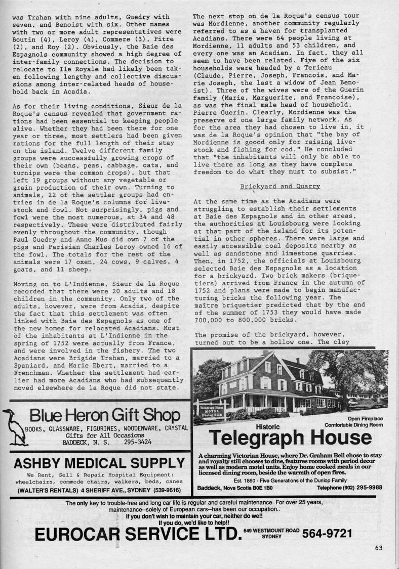 was Trahan with nine adults, Guedry with seven, and Benoist with six. Other names with two or more adult representatives were Boutin (4), Leroy (4), Commere (3), Pitre (2), and Roy (2). Obviously, the Baie des Espagnols community showed a high degree of inter-family connections. The decision to relocate to lie Royale had likely been tak? en following lengthy and collective discus? sions among inter-related heads of house? hold back in Acadia. As for their living conditions, Sieur de la Roque's census revealed that government ra? tions had been essential to keeping people alive. Whether they had been there for one year or three, most settlers had been given rations for the full length of their stay on the island. Twelve different family groups were successfully growing crops of their own (beans, peas, cabbage, oats, and turnips were the common crops), but that left 19 groups without any vegetable or grain production of their own. Turning to animals, 22 of the settler groups had en? tries in de la Roque's columns for live? stock and fowl. Not surprisingly, pigs and fowl were the most numerous, at 34 and 48 respectively. These were'distributed fairly evenly throughout the community, though Paul Guedry and Anne Mus did own 7 of the pigs and Parisian Charles Leroy owned 16 of the fowl. The'totals for the rest of the animals were 17 oxen, 24 cows, 9 calves, 4 goats, and 11 sheep. Moving on to L'Indienne, Sieur de la Roque recorded that there were 20 adults and 18 children in the community. Only two of the adults, however, were from Acadia, despite the fact that this settlement was often linked with Baie des Espagnols as one of the new homes for relocated Acadians. Most of the inhabitants at L'Indienne in the spring of 1752 were actually from France, and were involved in the fishery. The two Acadians were Brigide Trahan, married to a Spaniard, and Marie Ebert, married to a Frenchman. Whether the settlement had ear? lier had more Acadians who had subsequently moved elsewhere de la Roque did not state. 7:' Blue Heron Gift Shop Cbooks ~ "??"" The next stop on de la Roque's census tour was Mordienne, another community regularly referred to as a haven for transplanted Acadians. There were 64 people living at Mordienne, 11 adults and 53 children, and every one was an Acadian. In fact, they all seem to have been related. Fi,ve of the six households were headed by a Terieau (Claude, Pierre, Joseph, Francois, and Ma? rie Joseph, the last a widow of Jean Beno? ist) . Three of the wives were of the Guerin family (Marie, Marguerite, and Francoise), as was the final male head of household, Pierre Guerin. Clearly, Mordienne was the preserve of one large family network. As for the area they had chosen to live in, it was de la Roque's opinion that "the bay of Mordienne is goood only for raising live? stock and fishing for cod." He concluded that "the inhabitants will only be able to live there as long as they have complete freedom to do what they must to subsist." Brickyard and Quarry At the same time as the Acadians were struggling to establish their settlements at Baie des Espagnols and in other areas, the authorities at Louisbourg were looking at that part of the island for its poten? tial in other spheres. There were large and easily accessible coal deposits nearby as well as sandstone and limestone quarries. Then, in 1752, the officials at Louisbourg selected Baie des Espagnols as a location for a brickyard. Two brick makers (brique- tiers) arrived from France in the autumn of 1752 and plans were made to begin manufac? turing bricks the following year. The maitre briquetier predicted that by the end of the summer of 1753 they would have made 700,000 to 800,000 bricks. The promise of the brickyard, however, turned out to be a hollow one. The clay GLASSWARE, FIGURINES, WOOOENWARE, CRYSTAL Gifts for All Occasions BADDECK, N. S. 295-3424 ASHBY MEDICAL SUPPLY We Rent, Sell & Repair Hospital Equipment: wheelchairs, commode chairs, walkers, beds, canes (WALTER'S RENTALS) 4 SHERIFF AVE., SYDNEY (539-9616) Historic Open Fireplace Comfortable Dining Room Telegraph House A chanmng Victorian House, where Dr. Graham Bell chose to stay and royally still chooses to dine, features rooms with period decor as well as modem motel units. Ei'y home cooked meals in our licensed dining room, beside ilie warmth of open fires. Est. 1860 - Five Generations of the Dunlop Family Baddeck, Nova Scotia BOE 1 BO Telephone (902) 295-9988 The only key to trouble-free and long car life is regular and careful maintenance. For over 25 years, maintenance--solely of European cars-has been our occupation.. If you doni wish to maintain your car, neither do we!! If you do, we'd like to help!! EUROCAR SERVICE LTD. 649 WESTMOUNT ROAD SYDNEY 564-9721 63