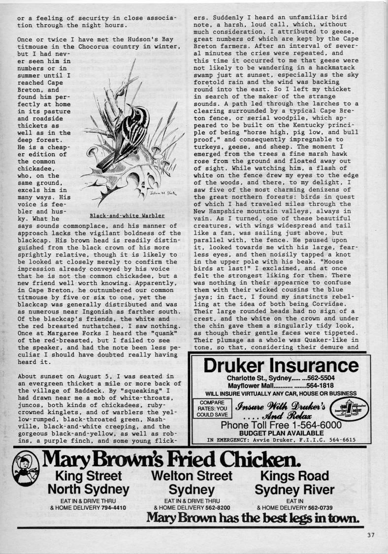 Published by Ronald Caplan on 1988/8/1 (227 reads)Black-and-white Warbler or a feeling of security in close associa? tion through the night hours. Once or twice I have met the Hudson's Bay titmouse in the Chocorua country in winter, but I had nev? er seen him in numbers or in summer until I reached Cape Breton, and found him per? fectly at home in its pasture and roadside thickets as well as in the deep forest. He is a cheap? er edition of the common chickadee, who, on the same ground, excels him in many ways. His voice is fee? bler and hus? ky. What he says sounds commonplace, and his manner of approach lacks the vigilant boldness of the blackcap. His brown head is readily distin? guished from the black crown of his more sprightly relative, though it is likely to be looked at closely merely to confirm the impression already conveyed by his voice that he is not the common chickadee, but a new friend well worth knowing. Apparently, in Cape Breton, he outnumbered our common titmouse by five or six to one, yet the blackcap was generally distributed and was as numerous near Ingonish as farther south. Of the blackcap's friends, the white and the red breasted nuthatches, I saw nothing. Once at Margaree Forks I heard the "quank" of the red-breasted, but I failed to see the speaker, and had the note been less pe? culiar I should have doubted really having heard it. About sunset on August 5,1 was seated in an evergreen thicket a mile or more back of the village of Baddeck. By "squeaking" I had drawn near me a mob of white-throats, juncos, both kinds of chickadees, ruby- crowned kinglets, and of warblers the yel? low- rumped, black-throated green, Nash? ville, black-and-white creeping, and the gorgeous black-and-yellow, as well as rob? ins, a purple finch, and some young flick? ers. Suddenly I heard an unfamiliar bird note, a harsh, loud call, which, without much consideration, I attributed to geese, great numbers of which are kept by the Cape Breton farmers. After an interval of sever? al minutes the cries were repeated, and this time it occurred to me that geese were not likely to be wandering in a hackmatack swamp just at sunset, especially as the sky foretold rain and the wind was backing round into the east. So I left my thicket in search of the maker of the strange sounds. A path led through the larches to a clearing surrounded by a typical Cape Bre? ton fence, or serial woodpile, which ap? peared to be built on the Kentucky princi? ple of being "horse high, pig low, and bull proof," and consequently impregnable to turkeys, geese, and sheep. The moment I emerged from the trees a fine marsh hawk rose from the ground and floated away out of sight. While watching him, a flash of white on the fence drew my eyes to the edge of the woods, and there, to my delight, I saw five of the most charming denizens of the great northern forests: birds in quest of which I had traveled miles through the New Hampshire mountain valleys, always in vain. As I turned, one of these beautiful creatures, with wings widespread and tail like a fan, was sailing just above, but parallel with, the fence. He paused upon it, looked towards me with his large, fear? less eyes, and then noisily tapped a knot in the upper pole with his beak. "Moose birds at last!" I exclaimed, and at once felt the strongest liking for them. There was nothing in their appearnce to confuse them with their wicked cousins the blue jays; in fact, I found my instincts rebel? ling at the idea of both being Corvidae. Their large rounded heads had no sign of a crest, and the white on the crown and under the chin gave them a singularly tidy look, as though their gentle faces were tippeted. Their plumage as a whole was Quaker-like in tone, so that, considering their demure and Druker Insurance Charlotte St., Sydney 562-5504 Mayflower Mall 564-1818 WILL INSURE VIRTUALLY ANY CAR, HOUSE OR BUSINESS COMPARE RATES: YOU COULD SAVE Phone Toll Free 1-564-6000 BUDGET PLAN AVAILABLE IN EMERGENCY: Avvie Druker. F.I.I.C. 564-6615 Mary Bfxnvifs FHed Oiicken. King Street North Sydney EAT IN & DRIVE THRU & HOME DELIVERY 794-4410 Welton Street Sydney EAT IN & DRIVE THRU & HOME DELIVERY 562-8200 Kings Road Sydney River EATIN & HOME DELIVERY 562-0739 Mairy Brown has Hie best legs in town. 37