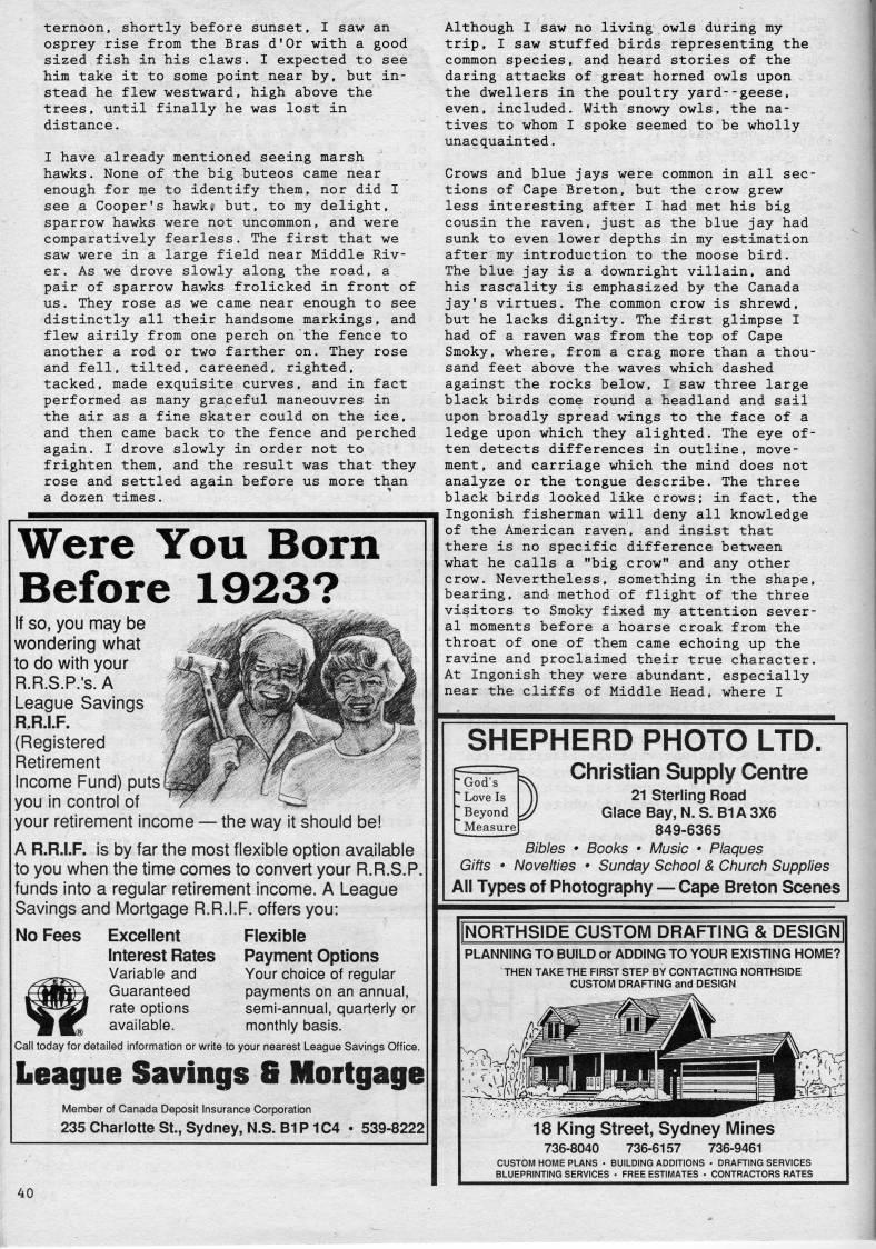 Published by Ronald Caplan on 1988/8/1 (245 reads)ternoon, shortly before sunset, I saw an osprey rise from the Bras d'Or with a good sized fish in his claws. I expected to see him take it to some point near by, but in? stead he flew westward, high above the trees, until finally he was lost in distance. I have already mentioned seeing marsh hawks. None of the big buteos came near enough for me to identify them, nor did I see a Cooper's hawki but, to my delight, sparrow hawks were not uncommon, and were comparatively fearless. The first that we saw were in a large field near Middle Riv? er. As we drove slowly along the road, a pair of sparrow hawks frolicked in front of us. They rose as we came near enough to see distinctly all their handsome markings, and flew airily from one perch on the fence to another a rod or two farther on. They rose and fell, tilted, careened, righted, tacked, made exquisite curves, and in fact performed as many graceful maneouvres in the air as a fine skater could on the ice, and then came back to the fence and perched again. I drove slowly in order not to frighten them, and the result was that they rose and settled again before us more than a dozen times. Were You Born Before 1923? if so, you may be wondering what to do with your R.R.S.P.'s.A League Savings R.R.I.F. (Registered Retirement Income Fund) puts you in control of '' ' '' your retirement income • the way it should be! A R.R.LF. is by far the most flexible option available to you when the time comes to convert your R.R.S.P. funds into a regular retirement income. A League Savings and Mortgage R.R.I.F. offers you: Flexible Payment Options Your choice of regular payments on an annual, semi-annual, quarterly or monthly basis. Call today for detailed information or write to your nearest League Savings Office. League Savings 8 Mortgage Member of Canada Deposit Insurance Corporation 235 Charlotte St., Sydney, N.S. B1P1C4 • 539-8222 No Fees Excellent interest Rates Variable and Guaranteed rate options available. Although I saw no living owls during my trip, I saw stuffed birds representing the common species, and heard stories of the daring attacks of great horned owls upon the dwellers in the poultry yard--geese, even, included. With snowy owls, the na? tives to whom I spoke seemed to be wholly unacquainted. Crows and blue jays were common in all sec? tions of Cape Breton, but the crow grew less interesting after I had met his big cousin the raven, just as the blue jay had sunk to even lower depths in my estimation after my introduction to the moose bird. The blue jay is a downright villain, and his rascality is emphasized by the Canada jay's virtues. The common crow is shrewd, but he lacks dignity. The first glimpse I had of a raven was from the top of Cape Smoky, where, from a crag more than a thou? sand feet above the waves which dashed against the rocks below, I saw three large black birds come round a headland and sail upon broadly spread wings to the face of a ledge upon which they alighted. The eye of? ten detects differences in outline, move? ment , and carriage which the mind does not analyze or the tongue describe. The three black birds looked like crows; in fact, the Ingonish fisherman will deny all knowledge of the American raven, and insist that there is no specific difference between what he calls a "big crow" and any other crow. Nevertheless, something in the shape, bearing, and method of flight of the three visitors to Smoky fixed my attention sever? al moments before a hoarse croak from the throat of one of them came echoing up the ravine and proclaimed their true character. At Ingonish they were abundant, especially near the cliffs of Middle Head, where I SHEPHERD PHOTO LTD. Christian Supply Centre 21 Sterling Road GlaceBay,N.S. B1A3X6 849-6365 Bibles • Books • !Ausic • Plaques Gifts * Novelties • Sunday School & Church Supplies All Types of Phiotography • Cape Breton Scenes PLANNING TO BUILD or ADDING TO YOUR EXISTING HOME? THEN TAKE THE FIRST STEP BY CONTACTING NORTHSIDE CUSTOM DRAFTING and DESIGN 18 King Street, Sydney i/llnes 736-8040 736-6157 736-9461 CUSTOM HOME PLANS • BUILDING ADDITIONS • DRAFTING SERVICES BLUEPRINTING SERVICES • FREE ESTIMATES • CONTRACTORS RATES