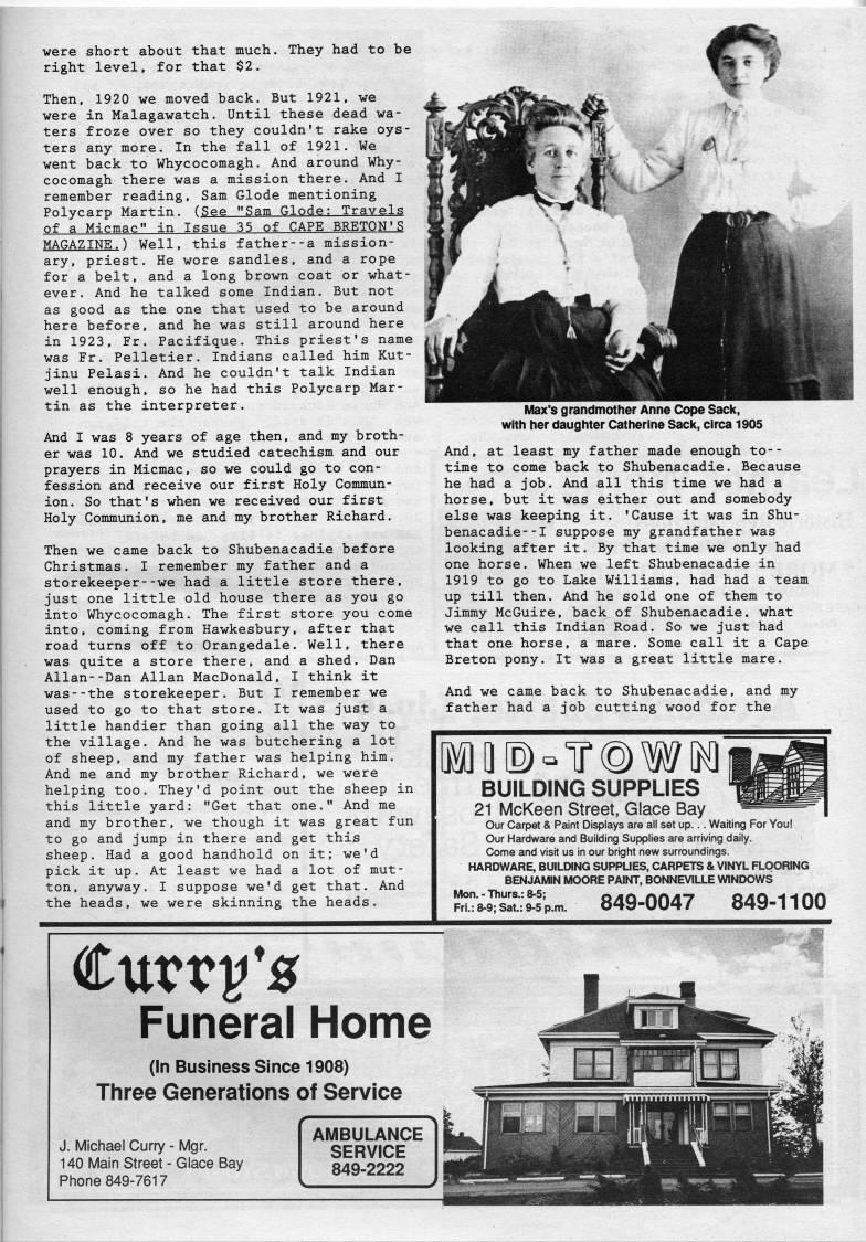 Published by Ronald Caplan on 1989/2/1 (390 reads)were short about that much. They had to be right level, for that $2. Then, 1920 we moved back. But 1921, we were in Malagawatch. Until these dead wa? ters froze over so they couldn't rake oys? ters any more. In the fall of 1921. We went back to Whycocomagh. And around Why? cocomagh there was a mission there. And I remember reading, Sam Glode mentioning Polycarp Martin. (See "Sam Glode: Travels of a Micmac" in Issue 35 of CAPE BRETON'S MAGAZINE.) Well, this father--a mission? ary, priest. He wore sandles, and a rope for a belt, and a long brown coat or what? ever. And he talked some Indian. But not as good as the one that used to be around here before, and he was still around here in 1923, Fr. Pacifique. This priest's name was Fr. Pelletier. Indians called him Kut- jinu Pelasi. And he couldn't talk Indian well enough, so he had this Polycarp Mar? tin as the interpreter. And I was 8 years of age then, and my broth? er was 10. And we studied catechism and our prayers in Micmac, so we could go to con? fession and receive our first Holy Commun? ion. So that's when we received our first Holy Communion, me and my brother Richard. Then we came back to Shubenacadie before Christmas. I remember my father and a storekeeper--we had a little store there, just one little old house there as you go into Whycocomagh. The first store you come into, coming from Hawkesbury, after th't road turns off to Orangedale. Well, there was quite a store there, and a shed. Dan Allan--Dan Allan MacDonald, I think it was--the storekeeper. But I remember we used to go to that store. It was just a little handier than going all the way to the village. And he was butchering a lot of sheep, and my father was helping him. And me and my brother Richard, we were helping too. They'd point out the sheep in this little yard: "Get that one." And me and my brother, we though it was great fun to go and jump in there and get this sheep. Had a good handhold on it; we'd pick it up. At least we had a lot of mut? ton, anyway. I suppose we'd get that. And the heads, we were skinning the heads. iviax's grandmother Anne Cope Sack, with her daughter Catherine Sacl(, circa 1905 And, at least my father made enough to-- time to come back to Shubenacadie. Because he had a job. And all this time we had a horse, but it was either out and somebody else was keeping it. 'Cause it was in Shu? benacadie- -I suppose my grandfather was looking after it. By that time we only had one horse. When we left Shubenacadie in 1919 to go to Lake Williams, had had a team up till then. And he sold one of them to Jimmy McGuire, back of Shubenacadie. what we call this Indian Road. So we just had that one horse, a mare. Some call it a Cape Breton pony. It was a great little mare. And we came back to Shubenacadie, and my father had a job cutting wood for the [|??-Tr(Q)WM BUILDING SUPPLIES 21 McKeen Street, Glace Bay Our Carpet & Paint Displays are all set up... Waiting For You! Our Hardware and Building Supplies are arriving daily. Come and visit us in our bright new surroundings. HARDWARE, BUILDING SUPPUES. CARPETS & VINYL FLOORING BENJAMIN MOORE PAINT, BONNEVILLE WINDOWS 'i9TsS:t?p • ,. 849-0047 849-1100 Funeral Home (In Business Since 1908) Three Generations of Service J. Michael Curiy - Mgr. 140 Main Street - Glace Bay Phone 849-7617 AMBULANCE SERVICE 849-2222