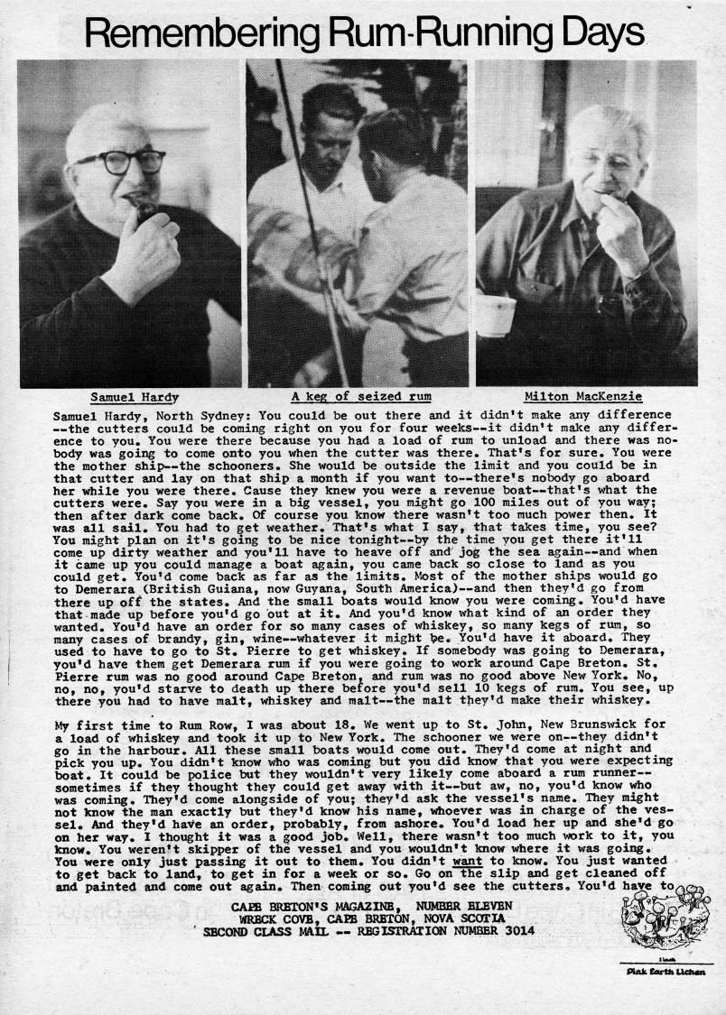 Published by Ronald Caplan on 1975/6/1 (1432 reads)Remembering Rum-Running Days Samuel Hardy Milton MacKenzie A keg of seized rum Samuel Hardy, North Sydney: You could be out there and it didn't make any difference • the cutters could be coming right on you for four weeks • it didn't make any differ? ence to you. You were there because you had a load of rum to unload and there was no? body was going to corae onto you when the cutter was there. That's for sure. You were the raother ship • the schooners. She would be outside the limit and you could be in that cutter and lay on that ship a raonth if you want to • there's nobody go aboard her while you were there. Cause they knew you were a revenue boat • that's what the cutters were. Say you were in a big vessel, you might go 100 miles out of you way; then after dark corae back. Of course you know there wasn't too much power then. It was all sail. You had to get weather. That's what I say, that takes time, you see? You raight plan on it's going to be nice tonight • by the time you get there it'll corae up dirty weather and you'll have to heave off and jog the sea again • and when it came up you could manage a boat again, you came back so close to land as you could get. You'd come back as far as the limits. Most of the mother ships would go to Demerara (British Guiana, now Guyana, South America) • and then they'd go from there up off the states. And the small boats would know you were coming. You'd have that made up before you'd go but at it. And you'd know what kind of an order they wanted. You'd have an order for so many cases of whiskey, so many kegs of rum, so many cases of brandy, gin, wine • whatever it might T?e. You'd have it aboard. They used to have to go to St. Pierre to get whiskey. If somebody was going to Demerara, you'd have them get Demerara rum if you were going to work around Cape Breton. St. Pierre rum was no good around Cape Breton, and rum was no good above New York. No, no, no, you'd starve to death up there before you'd sell 10 kegs of rum. You see, up there you had to have malt, whiskey and malt • the malt they'd make their whiskey. My first time to Rum Row, I was about 18. We went up to St. John, New Brunsw'ick for a load of whiskey and took it up to New York. The schooner we were on • they didn't go in the harbour. All these small boats would come out. They'd come at night and pick you up. You didn't know who was coming but you did know that you were expecting boat. It could be police but they wouldn't very likely come aboard a rum runner • sometimes if they thought they could get away with it • but aw, no, you'd know who was coming. They'd come alongside of you; they'd ask the vessel's name. They might not know the raan exactly but they'd know his name, vdioever was in charge of the ves? sel* And they'd have an order, probably, from ashore* You'd load her up and she'd go on her way* I thoi:'ht it was a good job. Well, there wasn't too much work to it, you know. You weren't skipper of the vessel and you wouldn't know where it was going. You were only just passing it out to them. You didn't want to know. You just wanted to get back to land, to get in for a week or so. Go on the slip and get cleaned off and painted and corae out again. Then coming out you'd see the cutters* You'd have to CAEB BRETON'S MAGAZINE, NUMBER ELEVEN WRECK COVB, CAEB BRETON, NOVA SCOTIA ' SECOND CLASS 14AIL • REGISmAXIC??} NUMBER 3014 PinkEortliUctMa