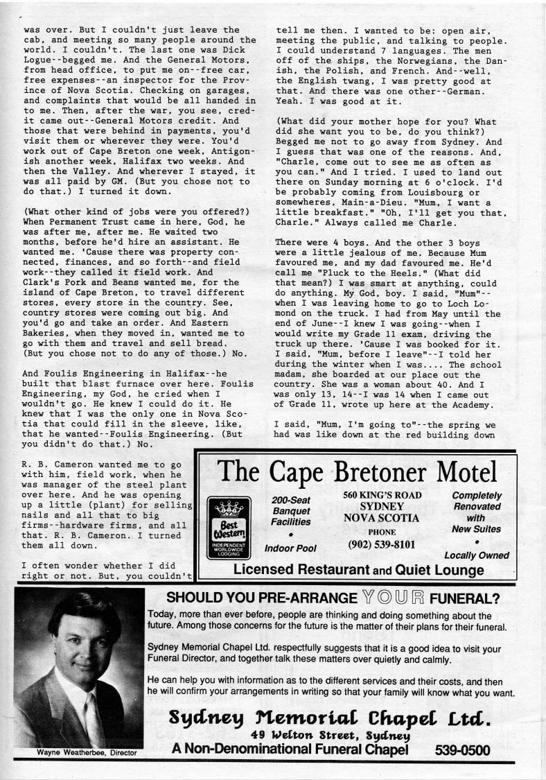 was over. But I couldn't just leave the cab, and meeting so many people around the world. I couldn't. The last one was Dick Logue--begged me. And the General Motors, from head office, to put me on--free car, free expenses--an inspector for the Prov? ince of Nova Scotia. Checking on garages, and complaints that would be all handed in to me. Then, after the war, you see, cred? it came out--General Motors credit. And those that were behind in payments, you'd visit them or wherever they were. You'd work out of Cape Breton one week, Antigon? ish another week, Halifax two weeks. And then the Valley. And wherever I stayed, it was all paid by GM. (But you chose not to do that.) I turned it down. (What other kind of jobs were you offered?) When Permanent Trust came in here, God, he was after me, after me. He waited two months, before he'd hire an assistant. He wanted me. 'Cause there was property con? nected, finances, and so forth--and field work--they called it field work. And Clark's Pork and Beans wanted me, for the island of Cape Breton, to travel different stores, every store in the country. See, country stores were coming out big. And you'd go and take an order. And Eastern Bakeries, when they moved in, wanted me to go with them and travel and sell bread. (But you chose not to do any of those.) No. And Foulis Engineering in Halifax--he built that blast furnace over here. Foulis Engineering, my God, he cried when I wouldn't go. He knew I could do it. He knew that I was the only one in Nova Sco? tia that could fill in the sleeve, like, that he wanted--Foulis Engineering. (But you didn't do that.) No. tell me then. I wanted to be: open air, meeting the public, and talking to people. I could understand 7 languages. The men off of the ships, the Norwegians, the Dan? ish, the Polish, and French. And--well, the English twang, I was pretty good at that. And there was one other--German. Yeah. I was good at it. (What did your mother hope for you? What did she want you to be, do you think?) Begged me not to go away from Sydney. And I guess that was one of the reasons. And, "Charle, come out to see me as often as you can." And I tried. I used to land out there on Sunday morning at 6 o'clock. I'd be probably coming from Louisbourg or somewheres, Main-a-Dieu. "Mum, I want a little breakfast." "Oh, I'll get you that, Charle." Always called me Charle. There were 4 boys. And the other 3 boys were a little jealous of me. Because Mum favoured me, and my dad favoured me. He'd call me "Pluck to the Heels." (What did that mean?) I was smart at anything, could do anything. My God, boy. I said, "Mum"-- when I was leaving home to go to Loch Lo? mond on the truck. I had from May until the end of June--I knew I was going--when I would write my Grade 11 exam, driving the truck up there. 'Cause I was booked for it. I said, "Mum, before I leave"--I told her during the winter when I was.... The school madam, she boarded at our place out the country. She was a woman about 40. And I was only 13, 14--I was 14 when I came out of XJrade 11, wrote up here at the Academy. I said, "Mum, I'm going to"--the spring we had was like down at the red building down R. B. Cameron wanted me to go with him, field work, when he was manager of the steel plant over here. And he was opening up a little (plant) for selling nails and all that to big firms--hardware firms, and all that. R. B. Cameron. I turned them all down. I often wonder whether I did right or not. But, you couldn't The Cape Bretoner Motel 200'Seat Banquet Facilities • Indoor Pool 560 KING'S ROAD SYDNEY NOVA SCOTIA PHONE (902) 539-8101 Completely Renovated with New Suites 0 Locally Owned Licensed Restaurant and Quiet Lounge Wayne Weatherloee, Director SHOULD YOU PRE-ARRANGE V ?? y IHi FUNERAL? Today, more than ever before, people are thinking and doing something about the future. Among those concerns for the future is the matter of their plans for their funeral. Sydney Memorial Chapel Ltd. respectfully suggests that it is a good idea to visit your Funeral Director, and together talk these matters over quietly and calmly. He can help you with information as to the different services and their costs, and then he will confirm your arrangements in writing so that your family will know what you want. Si'finetf ?temoriaC Chapel Ltd, 49 Welton Street, St|cineip A Non-Denominational Funeral Chapel 539-0500