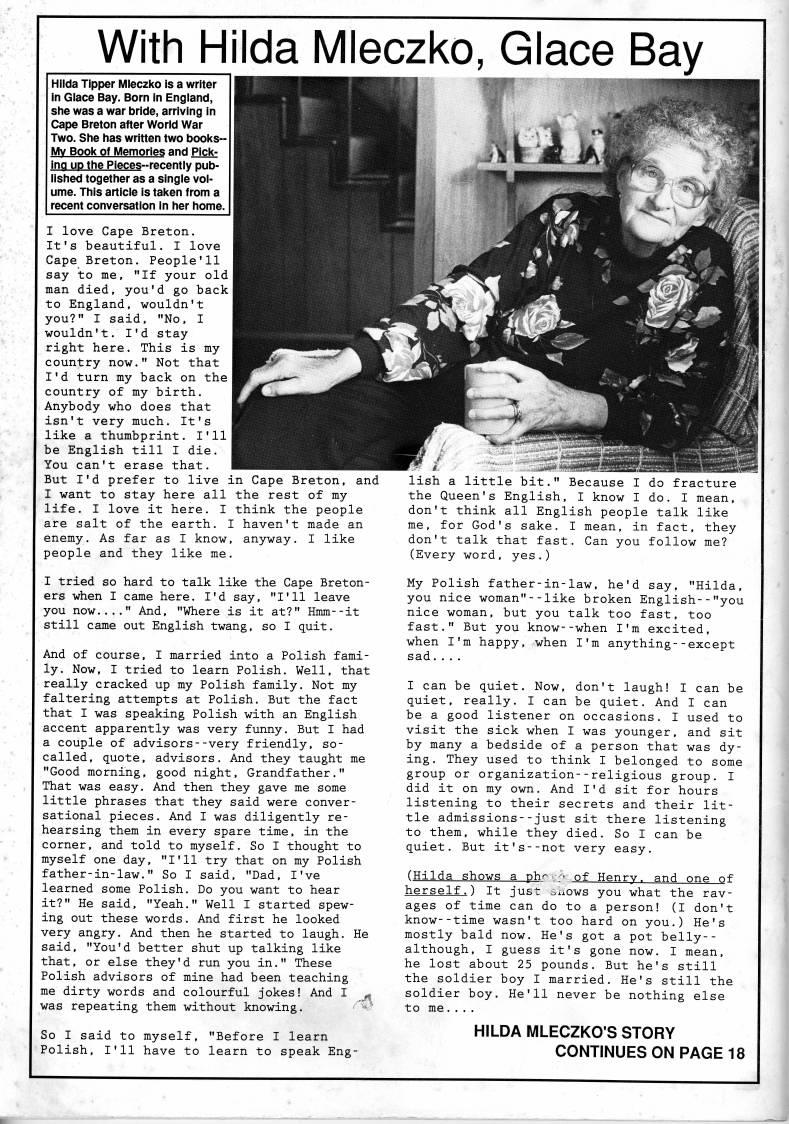 Published by Ronald Caplan on 1990/6/1 (183 reads)With Hilda MIeczko, Glace Bay I love Cape Breton. It's beautiful. I love Cape Breton. People'11 say to me, "If your old man died, you'd go back to England, wouldn't you?" I said, "No, I wouldn't. I'd stay right here. This is my country now." Not that I'd turn my back on the country of my birth. Anybody who does that isn't very much. It's like a thumbprint. I'll be English till I die. You can't erase that. But I'd prefer to live in Cape Breton, and I want to stay here all the rest of my life. I love it here. I think the people are salt of the earth. I haven't made an enemy. As far as I know, anyway. I like people and they like me. I tried so hard to talk like the Cape Breton? ers when I came here. I'd say, "I'll leave you now...." And, "Where is it at?" Hmm--it still came out English twang, so I quit. And of course, I married into a Polish fami? ly. Now, I tried to learn Polish. Well, that really cracked up my Polish family. Not my faltering attempts at Polish. But the fact that I was speaking Polish with an English accent apparently was very funny. But I had a couple of advisors--very friendly, so- called, quote, advisors. And they taught me "Good morning, good night. Grandfather." That was easy. And then they gave me some little phrases that they said were conver? sational pieces. And I was diligently re? hearsing them in every spare time, in the corner, and told to myself. So I thought to myself one day, "I'll try that on my Polish father-in-law." So I said, "Dad, I've learned some Polish. Do you want to hear it?" He said, "Yeah." Well I started spew? ing out these words. And first he looked very angry. And then he started to laugh. He said, "You'd better shut up talking like that, or else they'd run you in." These Polish advisors of mine had been teaching me dirty words and colourful jokes! And I _' was repeating them without knowing. ''h* So I said to myself, "Before I learn Polish, I'll have to learn to speak Eng? lish a little bit." Because I do fracture the Queen's English, I know I do. I mean, don't think all English people talk like me, for God's sake. I mean, in fact, they don't talk that fast. Can you follow me? (Every word, yes.) My Polish father-in-law, he'd say, "Hilda, you nice woman"--like broken English--"you nice woman, but you talk too fast, too fast." But you know--when I'm excited, when I'm happy, when I'm anything--except sad.... I can be quiet. Now, don't laugh! I can be quiet, really. I can be quiet. And I can be a good listener on occasions. I used to visit the sick when I was younger, and sit by many a bedside of a person that was dy? ing. They used to think I belonged to some group or organization--religious group. I did it on my own. And I'd sit for hours listening to their secrets and their lit? tle admissions--just sit there listening to them, while they died. So I can be quiet. But it's--not very easy. (Hilda shows a ph'" ;:' of Henry, and one of herself.) It just .:>iiOws you what the rav? ages of time can do to a person! (I don't know--time wasn't too hard on you.) He's mostly bald now. He's got a pot belly-- although, I guess it's gone now. I mean, he lost about 25 pounds. But he's still the soldier boy I married. He's still the soldier boy. He'll never be nothing else to me.... HILDA MLECZKO'S STORY CONTINUES ON PAGE 18