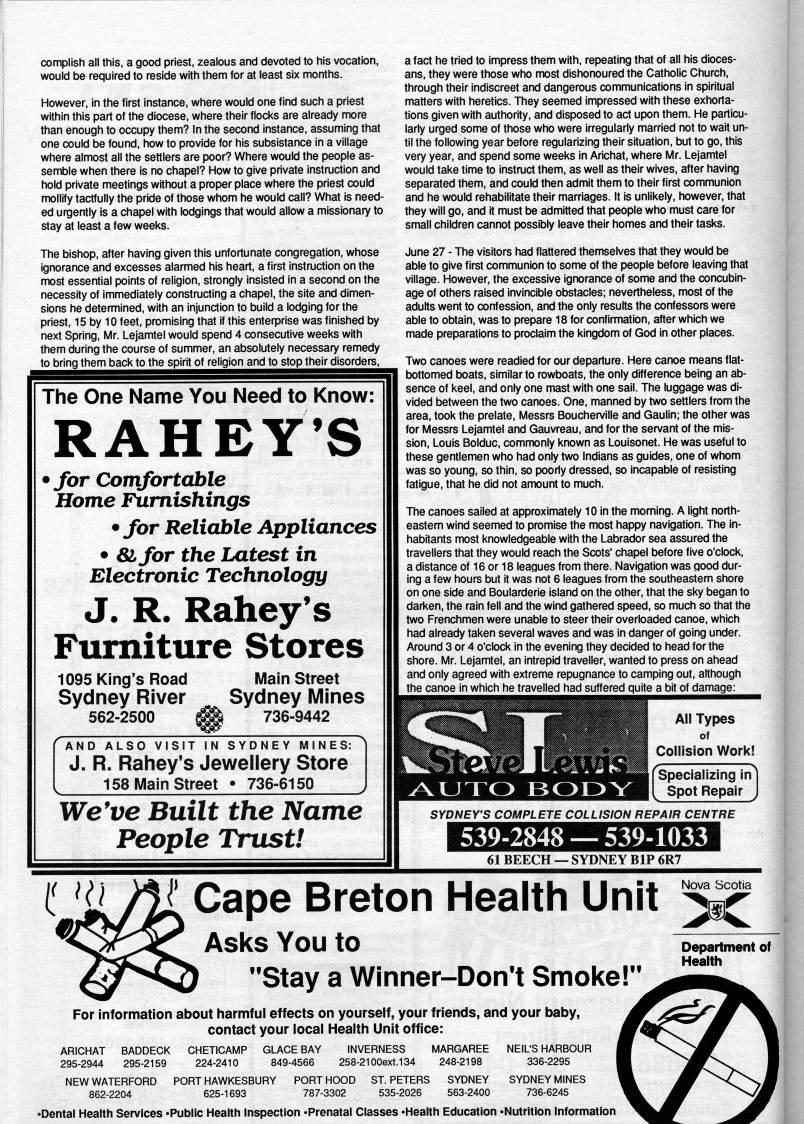 Published by Ronald Caplan on 1991/1/1 (393 reads)complish all this, a good priest, zealous and devoted to his vocation, would be required to reside with them for at least six months. However, in the first instance, where would one find such a priest within this part of the diocese, where their flocks are already more than enough to occupy them? In the second instance, assuming that one could be found, how to provide for his subsistance in a village where almost all the settlers are poor? Where would the people as? semble when there is no chapel? How to give private instmction and hold private meetings without a proper place where the priest could mollify tactfully the pride of those whom he would call? What is need? ed urgently is a chapel with lodgings that would allow a missionary to stay at least a few weeks. The bishop, after having given this unfortunate congregation, whose ignorance and excesses alarmed his heart, a first instmction on the most essential points of religion, strongly insisted in a second on the necessity of immediately constructing a chapel, the site and dimen? sions he detemiined, with an injunction to build a lodging for the priest, 15 by 10 feet, promising that if this enterprise was finished by next Spring, Mr. Lejamtel would spend 4 consecutive weeks with them during the course of summer, an absolutely necessary remedy to bring them back to the spirit of religion and to stop their disorders, The One Name You Need to Know: RAHEY'S • for Comfortable Home Furnishings • for Reliable Appliances • &for; the Latest in Electronic Technology J. R. Rahey's Furniture Stores 1095 King's Road Main Street Sydney River Sydney Mines 562-2500 ' 736-9442 fAND ALSO VISIT IN SYDNEY MINES: ' J. R. Rahey's Jewellery Store 158 Main street • 736-6150 We've Built the Name People Trust! a fact he tried to impress them with, repeating that of all his dioces? ans, they were those who most dishonoured the Catholic Church, through their indiscreet and dangerous communications in spiritual matters with heretics. They seemed impressed with these exhorta? tions given with authority, and disposed to act upon them. He particu? larly urged some of those who were irregulariy married not to wait un? til the following year before regularizing their situation, but to go, this very year, and spend some weeks in Arichat, where Mr. Lejamtel would take time to instmct them, as well as their wives, after having separated them, and could then admit them to their first communion and he would rehabilitate their marriages. It is unlikely, however, that they will go, and it must be admitted that people who must care for small children cannot possibly leave their homes and their tasks. June 27 - The visitors had flattered themselves that they would be able to give first communion to some of the people before leaving that village. However, the excessive ignorance of some and the concubin? age of others raised invincible obstacles; nevertheless, most of the adults went to confession, and the only results the confessors were able to obtain, was to prepare 18 for confirmation, after which we made preparations to proclaim the kingdom of God in other places. Two canoes were readied for our departure. Here canoe means flat- bottomed boats, similar to rowboats, the only difference being an ab? sence of keel, and only one mast with one sail. The luggage was di? vided between the two canoes. One, manned by two settlers from the area, took the prelate, Messrs Bouchen/ille and Gaulin; the other was for Messrs Lejamtel and Gauvreau, and for the servant of the mis? sion, Louis Bolduc, commonly known as Louisonet. He was useful to these gentlemen who had only two Indians as guides, one of whom was so young, so thin, so pooriy dressed, so incapable of resisting fatigue, that he did not amount to much. The canoes sailed at approximately 10 in the morning. A light north? eastern wind seemed to promise the most happy navigation. The in? habitants most knowledgeable with the Labrador sea assured the travellers that they would reach the Scots' chapel before five o'clock, a distance of 16 or 18 leagues from there. Navigation was good dur? ing a few hours but it was not 6 leagues from the southeastern shore on one side and Boularderie island on the other, that the sky began to darken, the rain fell and the wind gathered speed, so much so that the two Frenchmen were unable to steer their overloaded canoe, which had already taken several waves and was in danger of going under. Around 3 or 4 o'clock in the evening they decided to head for the shore. Mr. Lejamtel, an intrepid traveller, wanted to press on ahead and only agreed with extreme repugnance to camping out, although the canoe in which he travelled had suffered quite a bit of damage: SYDNEY'S COMPLETE COLLISION REPAIR CENTRE 539-2848 • 539-1033 61 BEECH • SYDNEY BIP 6R7 Cape Breton Health Unit ' Asks You to "Stay a Winner-Don't Smoke!" Department of Health For information about harmful effects on yourself, your friends, and your baby, contact your local Health Unit office: ARICHAT 295-2944 BADDECK 295-2159 CHETICAMP 224-2410 GLACE BAY 849-4566 INVERNESS 258-21 OOext. 134 NEW WATERFORD 862-2204 PORT HAWKESBURY 625-1693 PORT HOOD 787-3302 ST. PETERS 535-2026 MARGAREE 248-2198 SYDNEY 563-2400 NEIL'S HARBOUR 336-2295 SYDNEY MINES 736-6245 • Dental Health Services 'Public Health Inspection 'Prenatal Classes 'Health Education 'Nutrition Information