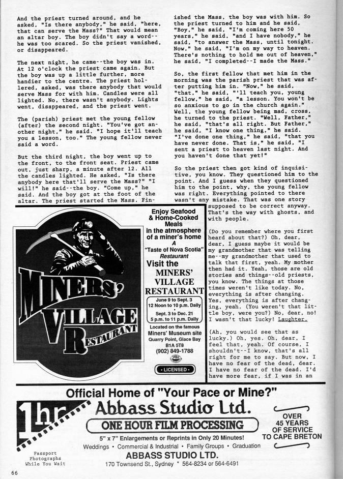 Published by Ronald Caplan on 1991/6/1 (178 reads)And the priest turned around, and he asked, "Is there anybody," he said, "here, that can serve the Mass?" That would mean an altar boy. The boy didn't say a word-- he was too scared. So the priest vanished, or disappeared. The next night, he came--the boy was in. At 12 o'clock the priest came again. But the boy was up a little further, more handier to the centre. The priest hol? lered, asked, was there anybody that would serve Mass for with him. Candles were all lighted. No. there wasn't anybody. Lights went, disappeared, and the priest went. The (parish) priest met the young fellow (after) the second night. "You've got an? other night." he said. "I hope it'll teach you a lesson, too." The young fellow never said a word. But the third night, the boy went up to the front, to the front seat. Priest came out, just sharp, a minute after 12. All the candles lighted. He asked. "Is there anybody here that'll serve the Mass?" "I will!" he said--the boy. "Come up." he said. And the boy got at the foot of the altar. The priest started the Mass. Fin? ished the Mass. the boy was with him. So the priest turned to him and he said, "Boy," he said. "I'm coming here 50 years," he said, "and I have nobody," he said, "to answer the Mass. until tonight. Now," he said, "I'm on my way to heaven. There's nothing to hold me out of heaven," he said, "I completed--! made the Mass." So, the first fellow that met him in the morning was the parish priest that was af? ter putting him in. "Now," he said, "that," he said, "'11 teach you, young fellow," he said, "a lesson. You won't be so anxious to go in the church again." Well, the young fellow being mad, cross, he turned to the priest. "Well, Father," he said, "that's all right. But Father," he said, "I know one thing," he said. "I've done one thing," he said, "that you have never done. That is," he said, "I sent a priest to heaven last night. And you haven't done that yet!" So the priest then got kind of inquisi? tive, you know. They questioned him to the point. And I guess when they questioned him to the point, why, the young fellow was right. Everything pointed to there wasn't any mistake. That was one story supposed to be correct anyway. That's the way with ghosts, and with people. Enjoy Seafood & Home-Cooked Meals in the atmosphere of a miner's home A "Taste of Nova Scotia' Restaurant Visit the MINERS' VILLAGE RESTAURANT June 9 to Sept. 3 12 Noon to 10 p.m. Daily Sept. 3 to Dec. 21 5 p.m. to 11 p.m. Dally Located on the famous l/liners' l/luseum site Quarry Point, Glace Bay B1A5T8 (902) 849-1788 a D (Do you remember where you first heard about that?) Oh, dear, dear, I guess maybe it would be my grandmother that was telling me--my grandmother that used to talk that first, yeah. My mother then had it. Yeah, those are old stories and things--old priests, you know. The things at those times weren't like today. No, everything is after changing. Yes, everything is after chang? ing, yeah. (You weren't that lit? tle boy, were you?) No, dear, no! I wasn't that lucky! Laughter. (Ah, you would see that as lucky.) Oh, yes. Oh, dear, I feel that, yeah. Of course, I shouldn't--! know, that's all right for me to say. But now, I have no fear of the dead, dear. I have no fear of the dead. I'd have more fear, if I was in an Official Home of "Your Pace or Mine?" Abhass Studla Ltde ( ONE HOUR FILM PROCESSniG' ot'sfR'v'Ici OVER Passport Photographs While You Wait SERVICE 5" X 7" Enlargements or Reprints in Only 20 Minutes! TO CAPE BRETON Weddings • Commercial & Industrial • Family Groups Graduation ABBASS STUDIO LTD. 170 Townsend St., Sydney * 564-8234 or 564-6491 66