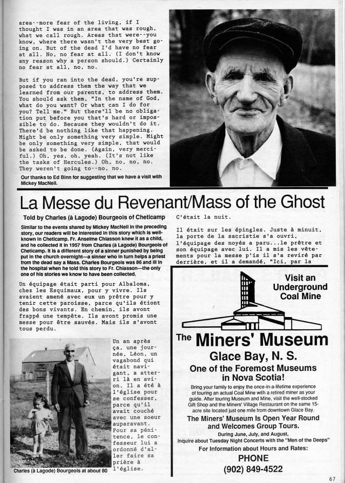 Published by Ronald Caplan on 1991/6/1 (170 reads)area--more fear of the living, if I thought I was in an area that was rough, what we call rough. Areas that were--you know, where there wasn't the very best go? ing on. But of the dead I'd have no fear at all. No, no fear at all. (I don't know any reason why a person should.) Certainly no fear at all, no, no. But if you ran into the dead, you're sup? posed to address them the way that we learned from our parents, to address them. You should ask them, "In the name of God, what do you want? Or what can I do for you? Tell me." But there'll be no obliga? tion put before you that's hard or impos? sible to do. Because they wouldn't do it. There'd be nothing like that happening. Might be only something very simple. Might be only something very simple, that would be asked to be done. (Again, very merci? ful.) Oh. yes. oh. yeah. (It's not like the tasks of Hercules.) Oh. no. no. no. They weren't going to--no. no. Our thanks to Ed Binn for suggesting that we have a visit with Mickey MacNeil. La Messe du Revenant/Mass of the Ghost Told by Charles (a Lagode) Bourgeois Of Cheticamp C'etait la nuit. Similar to the events shared by Mickey MacNeil in the preceding story, our readers will be Interested In this story which is well- known in Cheticamp. Fr. Anselme Chlasson knew it as a child, and he collected It In 1957 from Charles (' Lagode) Bourgeois of Cheticamp. it is a different story of a sinner punished by being put in the church overnight • ' sinner who in turn helps a priest from the dead say a Mass. Charles Bourgeois was 86 and ill in the hospital when he told this story to Fr. Chiasson • the only one of his stories we know to have been collected. Un Equipage 6tait parti pour Albaloma. chez les Esquimaux, pour y vivre. lis avaient amen6 avec eux un pretre pour y tenir cette paroisse, parce qu'ils 6tiont des bons vivants. En chemin, ils avont frapp' une tempete. lis avont promis une messe pour etre sauv's. Mais ils s'avont tous perdu. Un an apr's ga. une jour- n'e. L'on. un vagabond qui 'tait navi- gant. a atter- ,- • • ri 1' en avi? on. II a 6t6 k jI'eglise pour se corifesser, parce qu'il avait couch6 favec une soeur auparavant. !Pour sa peni? tence, le con- ifesseur lui a jordonn' d'al? ler faire sa Ipri're h Charles (' Lagode) Bourgeois at about 80 I'eglise. Il etait sur les epingles. Juste k minuit. la porte de la sacristie s'a ouvri, 1'equipage des noy's a paru...le pr??tre et son equipage avec lui. II a mis les vete- ments pour la messe p'is il s'a revire par derriere, et il a demande, "Ici, par la Visit an Underground Coal Mine '''' Miners' Museum Glace Bay, N. S. One of the Foremost Museums in Nova Scotia! Bring your family to enjoy the once-in-a-lifetime experience of touring an actual Coal Mine with a retired miner as your guide. After touring Museum and Mine, visit the well-stocked Gift Shop and the Miners' Village Restaurant on the same 15- acre site located just one mile from downtown Glace Bay. Thie Miners' Museum Is Open Year Round and Welcomes Group Tours. During June, July, and August, inquire about Tuesday Night Concerts with the "Men of the Deeps" For Information about Hours and Rates: PHONE (902) 849-4522 67