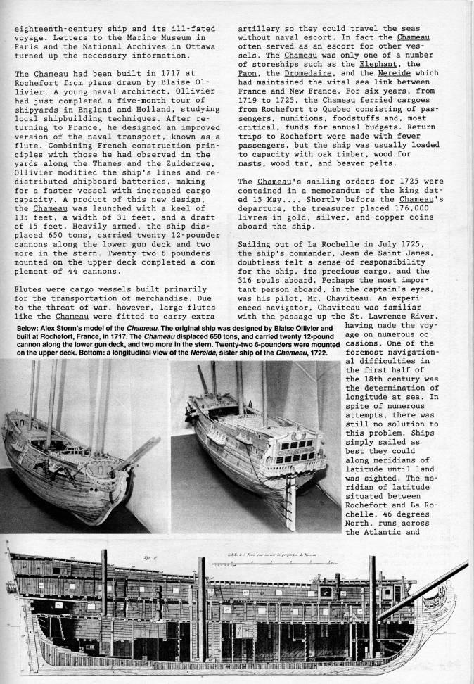 Published by Ronald Caplan on 1991/6/1 (753 reads)eighteenth-century ship and its ill-fated voyage. Letters to the Marine Museum in Paris and the National Archives in Ottawa turned up the necessary information. The Chameau had been built in 1717 at Rochefort from plans drawn by Blaise 01- livier. A young naval architect, Ollivier had just completed a five-month tour of shipyards in England and Holland, studying local shipbuilding techniques. After re? turning to France, he designed an improved version of the naval transport, known as a flute. Combining French construction prin? ciples with those he had observed in the yards along the Thames and the Zuiderzee, Ollivier modified the ship's lines and re? distributed shipboard batteries, making for a faster vessel with increased cargo capacity. A product of this new design, the Chameau was launched with a keel of 135 feet, a width of 31 feet, and a draft of 15 feet. Heavily armed, the ship dis? placed 650 tons, carried twenty 12-pounder cannons along the lower gun deck and two more in the stern. Twenty-two 6-pounders mounted on the upper deck completed a com? plement of 44 cannons. Flutes were cargo vessels built primarily for the transportation of merchandise. Due to the threat of war, however, large flutes like the Chameau were fitted to carry extra Below: Alex Storm's model of the Chameau. The original ship was designed by Blaise Ollivier and built at Rochefort, France, In 1717. The CAia/neai/displaced 650 tons, and carried twenty 12-pound cannon along the lower gun deck, and two more in the stern. Twenty-two 5-pounders were mounted on the upper deck. Bottom: a longitudinal view of the Nereide, sister ship of the Chameau, 1722. artillery so they could travel the seas without naval escort. In fact the Chameau often served as an escort for other ves? sels. The Chameau was only one of a number of storeships such as the Elephant, the Paon. the Dromedaire. and the Nereide which had maintained the vital sea link between France and New France. For six years, from 1719 to 1725, the Chameau ferried cargoes from Rochefort to Quebec consisting of pas? sengers, munitions, foodstuffs and, most critical, funds for annual budgets. Return trips to Rochefort were made with fewer passengers, but the ship was usually loaded to capacity with oak timber, wood for masts, wood tar, and beaver pelts. The Chameau's sailing orders for 1725 were contained in a memorandum of the king dat? ed 15 May.... Shortly before the Chameau's departure, the treasurer placed 176,000 livres in gold, silver, and copper coins aboard the ship. Sailing out of La Rochelle in July 1725, the ship's commander, Jean de Saint James, doubtless felt a sense of responsibility for the ship, its precious cargo, and the 316 souls aboard. Perhaps the most impor? tant person aboard, in the captain's eyes, was his pilot, Mr. Chaviteau. An experi? enced navigator, Chaviteau was familiar with the passage up the St. Lawrence River, having made the voy? age on numerous oc? casions . One of the foremost navigation? al difficulties in the first half of the 18th century was the determination of longitude at sea. In spite of numerous attempts, there was still no solution to this problem. Ships simply sailed as best they could along meridians of latitude until land was sighted. The me? ridian of latitude situated between Rochefort and La Ro? chelle, 46 degrees North, runs across the Atlantic and
