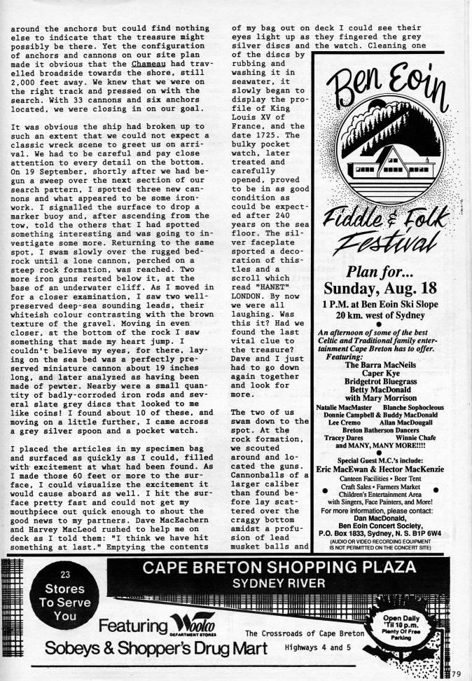 Published by Ronald Caplan on 1991/6/1 (358 reads)around the anchors but could find nothing else to indicate that the treasure might possibly be there. Yet the configuration of anchors and cannons on our site plan made it obvious that the Chameau had trav? elled broadside towards the shore, still 2,000 feet away. We knew that we were on the right track and pressed on with the search. With 33 cannons and six anchors located, we were closing in on our goal. It was obvious the ship had broken up to such an extent that we could not expect a classic wreck scene to greet us on arri? val. We had to be careful and pay close attention to every detail on the bottom. On 19 September, shortly after we had be? gun a sweep over the next section of our search pattern, I spotted three new can? nons and what appeared to be some iron? work. I signalled the surface to drop a marker buoy and, after ascending from the tow, told the others that I had spotted something interesting and was going to in? vestigate some more. Returning to the same spot, I swam slowly over the rugged bed? rock until a lone cannon, perched on a steep rock formation, was reached. Two more iron guns rested below it, at the base of an underwater cliff. As I moved in for a closer examination, I saw two well- preserved deep-sea sounding leads, their whiteish colour contrasting with the brown texture of the gravel. Moving in even closer, at the bottom of the rock I saw something that made my heart jump. I couldn't believe my eyes, for there, lay? ing on the sea bed was a perfectly pre? served miniature cannon about 19 inches long, and later analyzed as having been made of pewter. Nearby were a small quan? tity of badly-corroded iron rods and sev? eral slate grey discs that looked to me like coins! I found about 10 of these, and moving on a little further, I came across a grey silver spoon and a pocket watch. I placed the articles in my specimen bag and surfaced as quickly as I could, filled with' excitement at what had been found. As I made those 60 feet or more to the sur? face, I could visualize the excitement it would cause aboard as well. I hit the sur? face pretty fast and could not get my mouthpiece out quick enough to shout the good news to my partners. Dave MacEachern and Harvey MacLeod rushed to help me on deck as I told them: "I think we have hit something at last." Emptying the contents of my bag out on eyes light up as silver discs and of the discs by rubbing and washing it in seawater, it slowly began to display the pro? file of King Louis XV of France, and the date 1725. The bulky pocket watch, later treated and carefully opened, proved to be in as good condition as could be expect? ed after 240 years on the sea floor. The sil? ver faceplate sported a deco? ration of this? tles and a scroll which read "HANET" LONDON. By now we were all laughing. Was this it? Had we found the last vital clue to the treasure? Dave and I just had to go down again together and look for more. The two of us swam down to the spot. At the rock formation, we scouted around and lo? cated the guns. Cannonballs of a larger caliber than found be? fore lay scat? tered over the craggy bottom amidst a profu? sion of lead musket balls and deck I could see their they fingered the grey the watch. Cleaning one Plan for... Sunday, Aug. 18 1 P.M. at Ben Eoin Ski Slope 20 km. west of Sydney An afternoon of some of the best Celtic and Traditional family enter? tainment Cape Breton has to offer. Featuring: The Barra MacNeils Caper Kye Bridgetrot Bluegrass Betty MacDonald with Mary Morrison Natalie MacMaster Blanche Sophocleous Donnie Campbell & Buddy MacDonald Lee Cremo Allan MacDougall Breton Batherson Dancers Tracey Dares Winnie Chafe and MANY, MANY MORE!!!! • Special Guest M.C.'s include: Eric MacEwan & Hector MacKenzie Canteen FacUities • Beer Tent ' Craft Sales • Farmers Market ' Children's Entertainment Area with Singers, Face Painters, and More! For more information, please contact: Dan MacDonald, Ben Eoin Concert Society, P.O. Box 1833, Sydney, N. S. BIP 6W4 (AUDIO OR VIDEO RECORDING EQUIPMENT IS NOT PERMfFTED ON THE CONCERT SfTE) Stores To Serve You CAPE BRETON SHOPPING PLAZA SYDNEY RIVER llilifill' llllilll ?? --miuauumiiiiif' , VKicXXUlXlK'jr'jMmif' The crossroads of Cape Breton Sobeys & Shopper's Drug Mart "'''''''" ?"<' ' Open Daily 'TillOp.m. Plenty Of FfM '. Parkino ,'L' 79