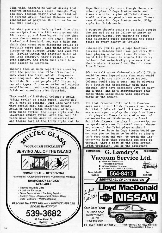 like this. There's no way of saying that they're specifically Irish, though. They are now, because that's what we think of as current style--Michael Coleman and that generation of players. Current as far as the 20th century. Cape Breton style, even though there are other styles of Cape Breton music and there are other styles of Irish--those would be the two predominant ones: Inver? ness County for Cape Breton music, Sligo style for Irish music. But when you start looking back into older manuscripts from the 19th century and the 18th century, and looking at the way they wrote the ornaments on the pages, both in Ireland and Scotland, you can't help but think that there were different styles of Scottish music then, that might have been closer to the current Irish--and vice ver? sa. (Styles within the Scottish music of the 18th century?) That's right. Or the 19th century. And Irish that could have been closer to Scottish. There's been so much repertoire crossing, over the generations. It's often hard to know where the first melodic fragments were composed, whether they were Irish or Scottish. But most people will listen to certain types of ornamentation and melodic embellishment, and immediately call that Irish and something else Scottish. They would call Michael Coleman's style "Sligo style" of Irish music. County Sli? go, a part of Ireland. Just like we'd have what people call the Inverness County style of Cape Breton fiddling. Although both those styles--the Sligo style and the Inverness County style--over the last 50 years have become sort of universalized and become sort of the Irish style and the "YOUR GLASS SPECIALISTS" SERVING ALL OF THE ISLAND COMMERCIAL - RESIDENTIAL • storefronts • Automatic Entrances • Commercial Windows EMERGENCY SERVICE AVAILABLE • Thermo Insulated Units • Aluminum Entrances • Glass Replacement • Caulking Repairs • Custom Glass • Replacement Stained Glass • Door Hardware • Weatherstripping BLACKIE MacPHERSON • LAWRENCE MULLER EDGAR MacKINNON 1 suppose there's going to be Irish people who get mad at me in Galway or Kerry or different places, but there's no doubt that Coleman's music influenced the reper? toire in every county of Ireland. Similarly, you'll get a Cape Bretoner playing a Coleman tune. You get Jerry Hol? land playing a Coleman tune. He doesn't sound like Coleman, he sounds like Jerry Holland. But melodically, you know that that's where it came from. That it came from Coleman. (Can we talk about Coleman's style?) There would be more improvising than what would currently be the norm in Cape Breton. Coleman would play a tune, and be playing it a little bit differently each time through. He'd have different ways of play? ing a tune, and he'd spontaneously rear? range those ideas mixed with improvisa? tions of the moment. (Is that freedom--I'11 call it freedom-- seen more in our Irish players than in our Scottish fiddlers?) Well, I know I never was encouraged to play that way from Scot? tish players. There is more of a sort of conservative attitude among the local Scottish players, to play it correctly, so to speak--whatever "correct" means. Where? as, some of the Irish players that I learned from here in Cape Breton would en? courage you to learn to be able to play a tune more than one way, to trick the lis? tener- -to keep them guessing and more at? tentive. That's part of the Cape Breton Irish tradition. One of the important COMMERCIAL RESIDENTIAL G. Landry's Vacuum Service Ltd. SEPTIC SYSTEMS CLEANED INSTALLED & REPAIRED BACKHOE BULLDOZER RENTAL PORTABLE TOILET RENTAL & SERVICE Front Lake Rd. Sydney 564-8413 ?? /SERVING ALL OF CAPE BRETON'-- • '/.v c''' Lk' MacDonald IMISSAN ii=yiiM Our 31st Year 124 KINGS ROAD SYDNEY RIVER Toll Free 1-800-565-9427 20 CAR SHOWROOM 1991 Pathfinder 4x4 NOW IN STOCK • Also Available in 4-Door •