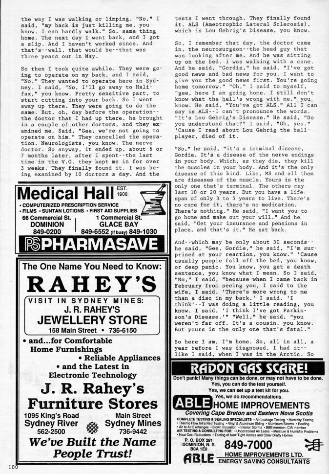 Published by Ronald Caplan on 1991/6/1 (157 reads)the way I was walking or limping. "No," I said, "my back is just killing me, you know. I can hardly walk." So, same thing home. The next day I went back, and I got a slip. And I haven't worked since. And that's--well, that would be--that was three years out in May. So then I took quite awhile. They were go? ing to operate on my back, and I said, "No." They wanted to operate here in Syd? ney. I said, "No, I'll go away to Hali? fax," you know. Pretty sensitive part, to start cutting into your back. So I went away up there. They were going to do the same. But, oh, day before the operation-- the doctor that I had up there, he brought in a couple of other doctors, and they ex? amined me. Said, "Gee, we're not going to operate on him." They cancelled the opera? tion. Neurologists, you know. The nerve doctor. So anyway, it ended up, about 6 or 7 months later, after I spent--the last time in the V.G. they kept me in for over 3 weeks. They finally found it. I was be? ing examined by 10 doctors a day. And the EST. 1906 Medical Hall • COMPUTERIZED PRESCRIPTION SERVICE • FILMS • SUNTAN LOTIONS • FIRST AID SUPPLIES 66 Commercial St. 1 Commercial StJ DOMINION 849-0200 GLACE BAY 849-6552 (it busy) 849-1030 PHARMASAVE The One Name You Need to Know: RAHEY'S VISIT IN SYDNEY MINES: J. R. RAHEY'S JEWELLERY STORE 158 Main Street • 736-6150 • and. • .for Comfortable Home Furnishings • Reliable Appliances • and the Latest in Electronic Technology J. R. Rahey's Furniture Stores 1095 King's Road Main Street Sydney River ' Sydney Mines 562-2500 W 736-9442 We*ve Built the Name People Trust! tests I went through. They finally found it. ALS (Ameotrophic Lateral Sclerosis), which is Lou Gehrig's Disease, you know. So, I remember that day, the doctor came in, the neurosurgeon--the head guy that was looking after me. And he was sitting up on the bed. I was walking with a cane. And he said, "Gordie," he said, "I've got good news and bad news for you. I want to give you the good news first. You're going home tomorrow." "Oh," I said to myself, "gee, here I am going home. I still don't know what the hell's wrong with me," you know. He said, "You've got ALS." All I can say is ALS--I can't pronounce the words. "It's Lou Gehrig's Disease." He said, "Do you understand that?" I said, "Oh, yes." 'Cause I read about Lou Gehrig the ball? player, died of it. "So," he said, "it's a terminal disease, Gordie. It's a disease of the nerve endings in your body. Which, as they die, they kill the muscles in your body. And it's the only disease of this kind. Like, MS and all them are diseases of the muscle. Yours is the only one that's terminal. The others may last 10 or 20 years. But you have a life? span of only 3 to 5 years to live. There's no cure for it, there's no medication. There's nothing." He said, "I want you to go home and make out your will." And he said, "Get your insurance and pensions in place, and that's it." He sat back. And--which may be only about 30 seconds-- he said, "Gee, Gordie," he said, "I'm sur? prised at your reaction, you know." 'Cause usually people fall off the bed, you know, or deep panic. You know, you get a death sentence, you know what I mean. So I said, "No," I said, "because when I came back in February from seeing you, I said to the wife, I said, 'There's more wrong to me than a disc in my back,' I said. 'I think'--I was doing a little reading, you know. I said, 'I think I've got Parkin? son's Disease.'" "Well." he said, "you weren't far off. It's a cousin, you know. But yours is the only one that's fatal." So here I am, I'm home. So. all in all, a year before I was diagnosed, I had it-- like I said, when I was in the Arctic. So 100 RADON GfiS SCfiRE! Don't panic! l/lany things can be done, or may not have to be done. Yes, you can do the test yourself. Yes, we can set up a test kit for you. Yes, we do recommendations. 'l5UdH0ME iMPROVEMENTS Covering Cape Breton and Eastern Nova Scotia COMPLETE TESTING & SEALING SPECIALISTS • Air Leakage Testing • Humidity Testing • Thenno Flow Infra Red Testing ?Vinyl & Aluminum Siding • Aluminum Storms • Roofing • Air to Air Exchanges • Blown Insulation • Interior Storms • BBB member, CIA member AIR TESTING & CONSULTING FOR: • Uncontrolled Air Leaks • Moisture & Humidity Problems • Heat Cost Reductions • Testing of New Tight Homes and Older Drafty Homes P. O. BOX 281 DOMiNiON, N. S. B0A1E0 ABLE 849-7000 HOME IMPROVEMENTS LTD. ENERGY SAVING CONSULTANTS '