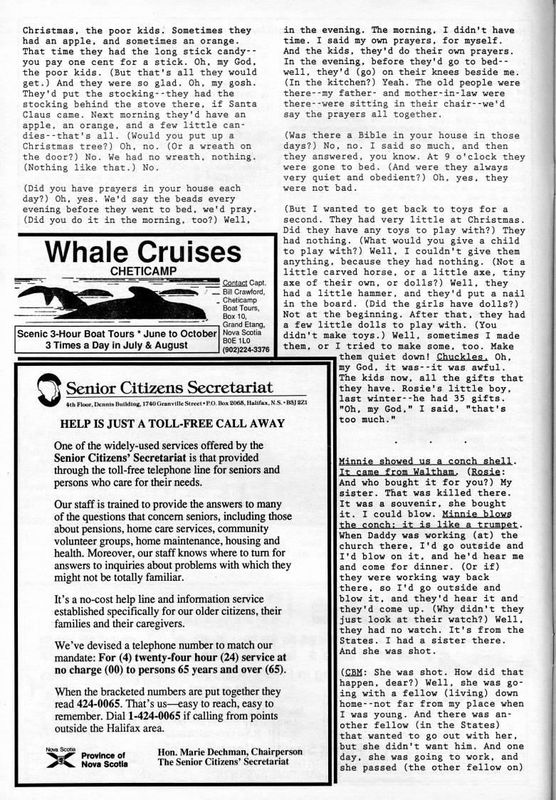 Published by Ronald Caplan on 1991/8/1 (230 reads)Christmas, the poor kids. Sometimes they had an apple, and sometimes an orange. That time they had the long stick candy-- you pay one cent for a stick. Oh, my God, the poor kids. (But that's all they would get.) And they were so glad. Oh, my gosh. They'd put the stocking--they had the stocking behind the stove there, if Santa Glaus came. Next morning they'd have an apple, an orange, and a few little can? dies- -that's all. (Would you put up a Christmas tree?) Oh, no. (Or a wreath on the door?) No. We had no wreath, nothing. (Nothing like that.) No. (Did you have prayers in your house each day?) Oh, yes. We'd say the beads every evening before they went to bed, we'd pray. (Did you do it in the morning, too?) Well, Whale Cruises CHETICAMP Scenic 3-Hour Boat Tours * June to October 3 Times a Day in July & August Contact Capt. _ Bill Crawford, _ Cheticamp Boat Tours, Box 10, Grand Etang, Nova Scotia BOE ILO (902)224-3376 0 Senior Citizens Secretariat 4th Floor, Dennis Building, 1740 Granville Street • P.O. Box 2065, Halifax, N.S. • B3J 2Z1 HELP IS JUST A TOLL-FREE CALL AWAY One of the widely-used services offered by the Senior Citizens' Secretariat is that provided through the toll-free telephone line for seniors and persons who care for their needs. Our staff is trained to provide the answers to many of the questions that concern seniors, including those about pensions, home care services, community volunteer groups, home maintenance, housing and health. Moreover, our staff knows where to tum for answers to inquiries about problems with which they might not be totally familiar. It's a no-cost help line and information service established specifically for our older citizens, their families and their caregivers. We've devised a telephone number to match our mandate: For (4) twenty-four hour (24) service at no charge (00) to persons 65 years and over (65). When the bracketed numbers are put together they read 424-0065. That's us • easy to reach, easy to remember. Dial 1-424-0065 if calling from points outside the Halifax area. in the evening. The morning, I didn't have time. I said my own prayers, for myself. And the kids, they'd do their own prayers. In the evening, before they'd go to bed-- well, they'd (go) on their knees beside me. (In the kitchen?) Yeah. The old people were there--my father- and mother-in-law were there--were sitting in their chair--we'd say the prayers all together. (Was there a Bible in your house in those days?) No, no. I said so much, and then they answered, you know. At 9 o'clock they were gone to bed. (And were they always very quiet and obedient?) Oh, yes, they were not bad. (But I wanted to get back to toys for a second. They had very little at Christmas. Did they have any toys to play with?) They had nothing. (What would you give a child to play with?) Well, I couldn't give them anything, because they had nothing. (Not a little carved horse, or a little axe, tiny axe of their own, or dolls?) Well, they had a little hammer, and they'd put a nail in the board. (Did the girls have dolls?) Not at the beginning. After that, they had a few little dolls to play with. (You didn't make toys.) Well, sometimes I made them, or I tried to make some, too. Make them quiet down! Chuckles. Oh, my God, it was--it was awful. The kids now, all the gifts that they have. Rosie's little boy, last winter--he had 35 gifts. "Oh, my God," I said, "that's too much." 'jSc Province of Nova Scotia Hon. Marie Dechman, Chairperson The Senior Citizens' Secretariat Minnie showed us a conch shell. It came from Waltham. (Rpsig: And who bought it for you?) My sister. That was killed there. It was a souvenir, she bought it. I could blow. Minnie blows the conch: it is like a trumpet. When Daddy was working (at) the church there, I'd go outside and I'd blow on it, and he'd hear me and come for dinner. (Or if) they were working way back there, so I'd go outside and blow it, and they'd hear it and they'd come up. (Why didn't they just look at their watch?) Well, they had no watch. It's from the States. I had a sister there. And she was shot. (CBM: She was shot. How did that happen, dear?) Well, she was go? ing with a fellow (living) down home--not far from my place when I was young. And there was an? other fellow (in the States) that wanted to go out with her, but she didn't want him. And one day, she was going to work, and she passed (the other fellow on)