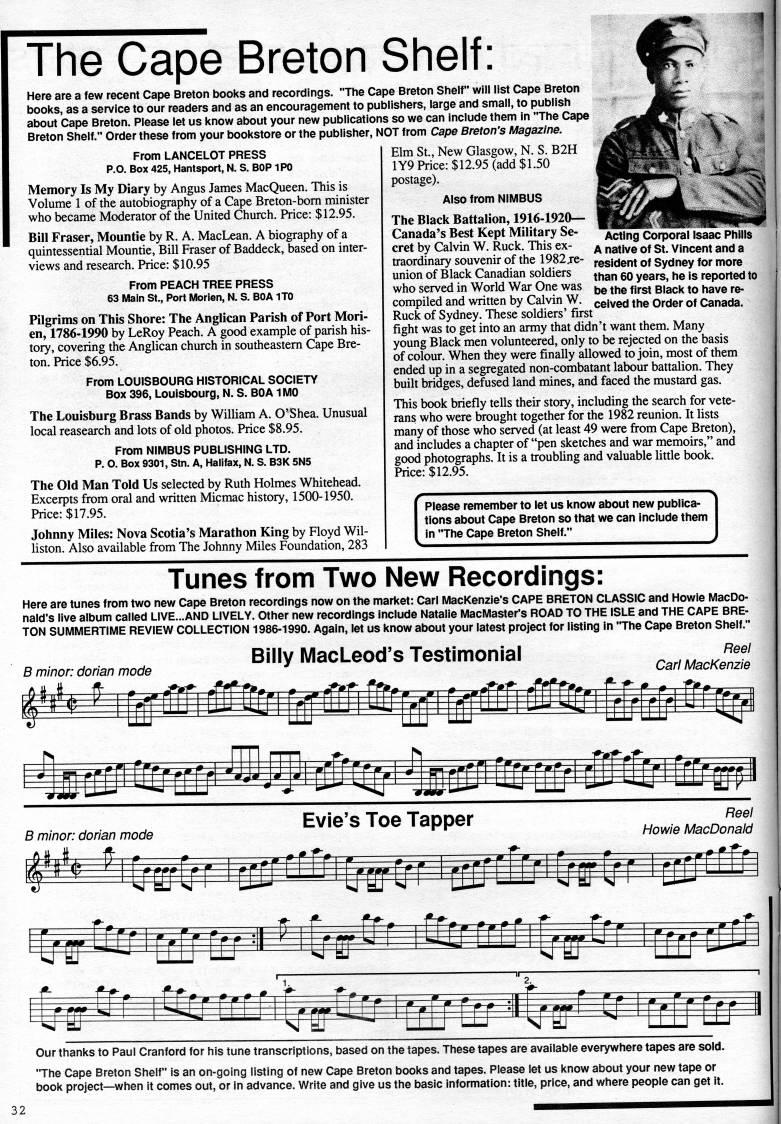 Published by Ronald Caplan on 1991/8/1 (424 reads)The Cape Breton Shelf: Here are a few recent Cape Breton books and recordings. "The Cape Breton Shelf" will list Cape Breton books, as a service to our readers and as an encouragement to publishers, large and small, to publish about Cape Breton. Please let us know about your new publications so we can include them in "The Cape Breton Shelf." Order these from your bookstore or the publisher, NOT from Cape Breton's Magazine. From LANCELOT PRESS | Elm St., New Glasgow, N. S. B2H P.O. Box425,Hantsport,N.S. B0P1P0 " "' Memory Is My Diary by Angus James MacQueen. This is Volume 1 of the autobiography of a Cape Breton-bom minister who became Moderator of the United Church. Price: $12.95. Bill Fraser, Mountie by R. A. MacLean. A biography of a quintessential Mountie, Bill Fraser of Baddeck, based on inter? views and research. Price: $10.95 From PEACH TREE PRESS 63 Main St., Port Morien, N. S. BOA 1T0 Pilgrims on This Shore: The Anglican Parish of Port Mori- en, 1786-1990 by LeRoy Peach. A good example of parish his? tory, covering the Anglican church in southeastern Cape Bre? ton. Price $6.95. From LOUISBOURG HISTORICAL SOCIETY Box 396, Louisbourg, N. S. BOA 1 MO The Louisburg Brass Bands by WiUiam A. O'Shea. Unusual local reasearch and lots of old photos. Price $8.95. From NIMBUS PUBLISHING LTD. P. O. Box 9301, Stn. A, Halifax, N. S. B3K 5N5 The Old Man Told Us selected by Ruth Holmes Whitehead. Excerpts from oral and written Micmac history, 1500-1950. Price: $17.95. Johnny Miles: Nova Scotia's Marathon King by Floyd Wil? liston. Also available from The Johnny Miles Foundation, 283 Acting Corporal Isaac Phills A native of St. Vincent and a resident of Sydney for more than 60 years, he is reported to be the first Black to have re? ceived the Order of Canada. 1Y9 Price: $12.95 (add $1.50 postage). Also from NIMBUS The Black Battalion, 1916-1920 • Canada's Best Kept Military Se? cret by Calvin W. Ruck. This ex? traordinary souvenir of the 1982 je- union of Black Canadian soldiers who served in World War One was compiled and written by Calvin W. Ruck of Sydney. These soldiers' first fight was to get into an army that didn't want them. Many young Black men volunteered, only to be rejected on the basis of colour. When they were finally allowed to join, most of them ended up in a segregated non-combatant labour battalion. They built bridges, defused land mines, and faced the mustard gas. This book briefly tells their story, including the search for vete? rans who were brought together for the 1982 reunion. It lists many of those who served (at least 49 were from Cape Breton), and includes a chapter of "pen sketches and war memoirs," and good photographs. It is a troubhng and valuable Httle book. Price: $12.95. Please remember to let us know about new publica? tions about Cape Breton so that we can include them in "The Cape Breton Shelf." Tunes from Two New Recordings: Here are tunes from two new Cape Breton recordings now on the market: Carl MacKenzie's CAPE BRETON CLASSIC and Howie MacDo- nald's live album called LIVE...AND LIVELY. Other new recordings Include Natalie MacMaster's ROAD TO THE ISLE and THE CAPE BRE? TON SUMMERTIME REVIEW COLLECTION 1986-1990. Again, let us know about your latest project for listing In "The Cape Breton Shelf." Reel Carl MacKenzie B minor: dorian mode Billy MacLeod's Testimonial B minor: dorian mode Evie's Toe Tapper Reel Howie MacDonald Our thanks to Paul Cranford for his tune transcriptions, based on the tapes. These tapes are available everywhere tapes are sold. "The Cape Breton Shelf" is an on-going listing of new Cape Breton books and tapes. Please let us know about your new tape or book project • when it comes out, or in advance. Write and give us the basic information: title, price, and where people can get it.