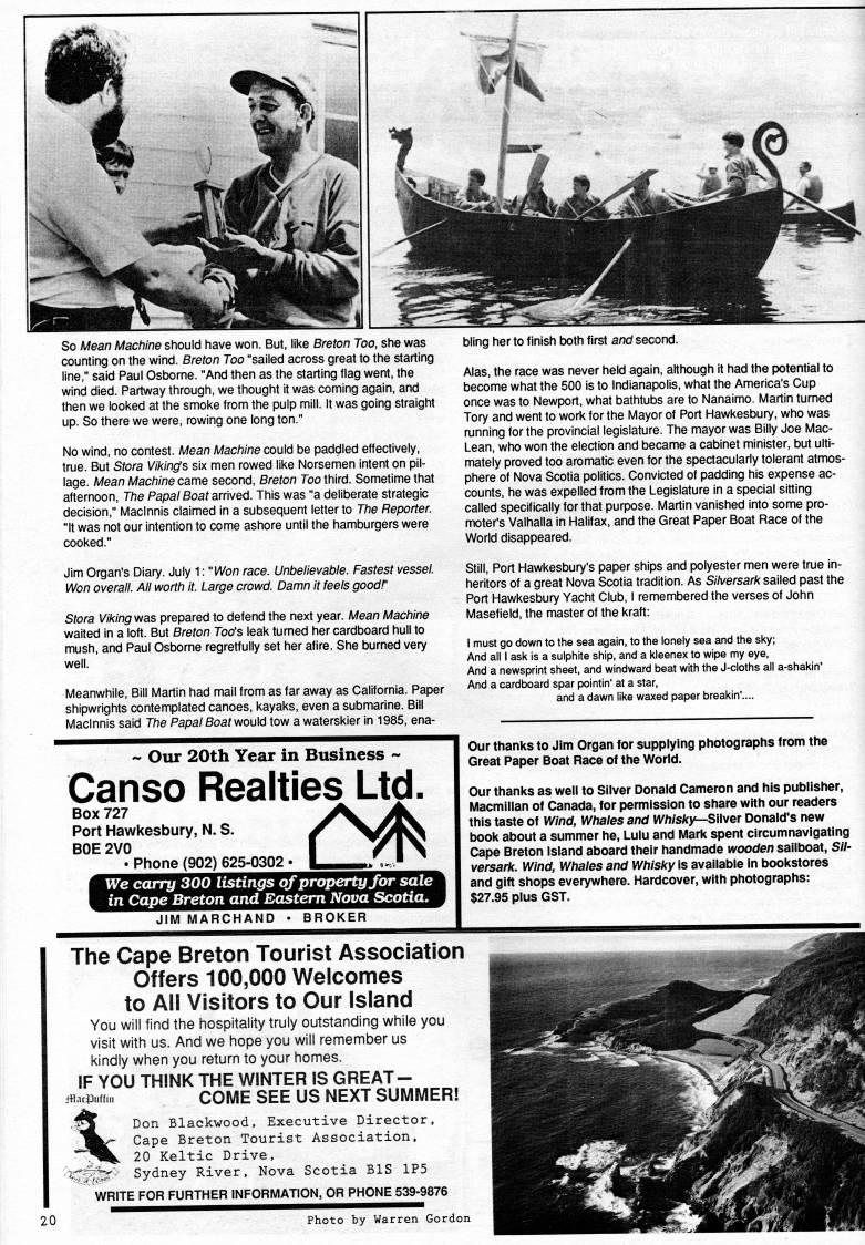 Published by Ronald Caplan on 1992/1/1 (414 reads)So Mean Machine should have won. But, like Breton Too, she was counting on the wind. Breton Too "sailed across great to the starting line," said Paul Osborne. "And then as the starting flag went, the wind died. Partway through, we thought it was coming again, and then we looked at the smoke from the pulp mill. It was going straight up. So there we were, rowing one long ton." No wind, no contest. Mean Machine could be paddled effectively, true. But Stora Vikings six men rowed like Norsemen intent on pil? lage. Mean Machine came second, Breton Too third. Sometime that afternoon. The Papal Boat arwed. This was "a deliberate strategic decision," Maclnnis claimed in a subsequent letter to The Reporter. "It was not our intention to come ashore until the hamburgers were cooked." Jim Organ's Diary. July 1: "Won race. Unbelievable. Fastest vesseL Won overall. All worth it. Large crowd. Damn it feels goodf Stora Viking was prepared to defend the next year. Mean Machine waited in a loft. But Breton Too's leak turned her cardboard hull to mush, and Paul Osborne regretfully set her afire. She burned very well. Meanwhile, Bill Martin had mail from as far away as California. Paper shipwrights contemplated canoes, kayaks, even a submarine. Bill Maclnnis said The Papa/Soaf would tow a waterskier in 1985, ena? bling her to finish both first and second. Alas, the race was never held again, although it had the potential to become what the 500 Is to Indianapolis, what the America's Cup once was to Newport, what bathtubs are to Nanaimo. Martin turned Tory and went to work for the Mayor of Port Hawkesbury, who was running for the provincial legislature. The mayor was Billy Joe Mac- Lean, who won the election and became a cabinet minister, but ulti? mately proved too aromatic even for the spectacularly tolerant atmos? phere of Nova Scotia politics. Convicted of padding his expense ac? counts, he was expelled from the Legislature in a special sitting called specifically for that purpose. Martin vanished into some pro? moter's Valhalla in Halifax, and the Great Paper Boat Race of the World disappeared. Still, Port Hawkesbury's paper ships and polyester men were true in? heritors of a great Nova Scotia tradition. As S/Vversar/c sailed past the Port Hawkesbury Yacht Club, 1 remembered the verses of John Masefield, the master of the kraft: I must go down to the sea again, to the lonely sea and the sky; And all I ask is a sulphite ship, and a kleenex to wipe my eye, And a newsprint sheet, and windward beat with the J-cloths all a-shakin' And a cardboard spar pointin' at a star, and a dawn like waxed paper breakin'.... Our 20th Year in Business - Canso Realties Ltd. Box 727 Port Hawkesbury, N. 8. BOE 2V0 . Phone (902) 625-0302 • We carry 300 listings of property for sale in Cape Breton and Eastern Nova Scotia. JIM MARCHAND • BROKER Our thanks to Jim Organ for supplying photographs from the Great Paper Boat Race of the World. Our thanks as well to Silver Donald Cameron and his publisher, Macmillan of Canada, for permission to share with our readers this taste of Wind, Whales and WhIsky • SWyer Donald's new book about a summer he, Lulu and IVIark spent circumnavigating Cape Breton Island aboard their handmade wooden sailboat, Sil? versark. Wind, Whales and Whisky is available in bookstores and gift shops everywhere. Hardcover, with photographs: $27.95 plus GST. The Cape Breton Tourist Association Offers 100,000 Welcomes to All Visitors to Our Island You will find the hospitality truly outstanding while you visit with us. And we hope you will remember us kindly when you return to your homes. IF YOU THINK THE WINTER IS GREAT- COME SEE us NEXT SUMMER! Don Blackwood, Executive Director, Cape Breton Tourist Association, 20 Keltic Drive, Sydney River, Nova Scotia BIS 1P5 WRITE FOR FURTHER INFORMATION, OR PHONE 539-9876 Photo by Warren Gordon $.