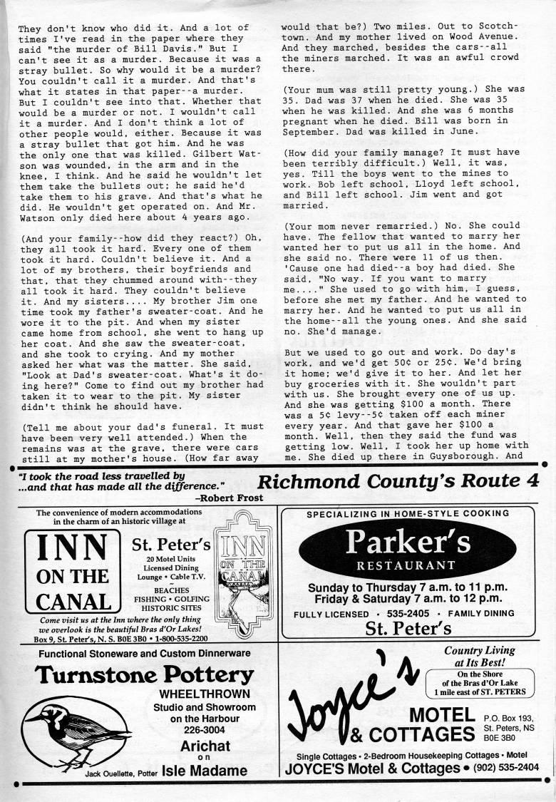 Published by Ronald Caplan on 1992/6/1 (228 reads)They don't know who did it. And a lot of times I've read in the paper where they said "the murder of Bill Davis." But I can't see it as a murder. Because it was a stray bullet. So why would it be a murder? You couldn't call it a murder. And that's what it states in that paper--a murder. But I couldn't see into that. Whether that would be a murder or not. I wouldn't call it a murder. And I don't think a lot of other people would, either. Because it was a stray bullet that got him. And he was the only one that was killed. Gilbert Wat? son was wounded, in the arm and in the knee, I think. And he said he wouldn't let them take the bullets out: he said he'd take them to his grave. And that's what he did. He wouldn't get operated on. And Mr. Watson only died here about 4 years ago. (And your family--how did they react?) Oh, they all took it hard. Every one of them took it hard. Couldn't believe it. And a lot of my brothers, their boyfriends and that, that they chummed around with--they all took it hard. They couldn't believe it. And my sisters.... My brother Jim one time took my father's sweater- coat. And he wore it to the pit. And when my sister came home from school, she went to hang up her coat. And she saw the sweater-coat, and she took to crying. And my mother asked her what was the matter. She said, "Look at Dad's sweater- coat. What's it do? ing here?" Come to find out my brother had taken it to wear to the pit. My sister didn't think he should have. (Tell me about your dad's funeral. It must have been very well attended.) When the remains was at the grave, there were cars still at my mother's house. (How far away would that be?) Two miles. Out to Scotch- town. And my mother lived on Wood Avenue. And they marched, besides the cars--all the miners marched. It was an awful crowd there. (Your mum was still pretty young.) She was 35. Dad was 37 when he died. She was 35 when he was killed. And she was 6 months pregnant when he died. Bill was born in September. Dad was killed in June. (How did your family manage? It must have been terribly difficult.) Well, it was, yes. Till the boys went to the mines to work. Bob left school, Lloyd left school, and Bill left school. Jim went and got married. (Your mom never remarried.) No. She could have. The fellow that wanted to marry her wanted her to put us all in the home. And she said no. There were 11 of us then. 'Cause one had died--a boy had died. She said, "No way. If you want to marry me...." She used to go with him, I guess, before she met my father. And he wanted to marry her. And he wanted to put us all in the home--all the young ones. And she said no. She'd manage. But we used to go out and work. Do day's work, and we'd get 500 or 250. We'd bring it home; we'd give it to her. And let her buy groceries with it. She wouldn't part with us. She brought every one of us up. And she was getting $100 a month. There was a 50 levy--50 taken off each miner every year. And that gave her $100 a month. Well, then they said the fund was getting low. Well, I took her up home with me. She died up there in Guysborough. And "I took the road less travelled by ...and that has made all the difference." -Robert Frost Richmond County *s Route 4 The convenience of modern accommodations in the charm of an historic village at INN ON THE CANAL St. Peter's 20 Motel Units Licensed Dining Lounge • Cable T.V. BEACHES FISHING • GOLFING HISTORIC SITES Come visit us at the Inn where the only thing we overlook is the beautiful Bras d'Or Lakes! Box 9, St Peter's, N. S. BOE 3B0 • 1-800-535-2200 SPECIALIZING IN HOME-STYLE COOKING Parker's RESTAURANT Sunday to Thursday 7 a.m. to 11 p.m. Friday & Saturday 7 a.m. to 12 p.m. FULLY LICENSED • 535-2405 • FAMILY DINING St. Peter's Functional Stoneware and Custom Dinnerware Turnstone Pottery WHEELTHROWN Studio and Showroom on the Harbour 226-3004 Arichat on Jack Ouellette, Potter IsIG MadaiTie V'V&CO; H Country Living at Its Best! On the Shore of the Bras d'Or Lake 1 mUe east of ST. PETERS MOTEL & COTTAGES P.O. Box 193, Single Cottages • 2-Bedroom Housekeeping Cottages • Motel JOYCE'S Motel & Cottages • 002) 535-2404
