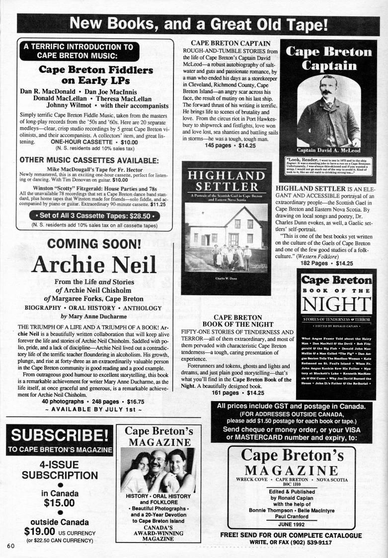 Published by Ronald Caplan on 1992/6/1 (254 reads)New Books, and a Great Old Tape! A TERRIFIC INTRODUCTION TO CAPE BRETON MUSIC: Cape Breton Fiddlers on Early LPs Dan R. MacDonald • Dan Joe Maclnnis Donald MacLellan • Theresa MacLellan Johnny Wilmot • with their accompanists Simply terrific Cape Breton Fiddle Music, taken from the masters of long-play records from the '50s and '60s. Here are 20 separate medleys • clear, crisp studio recordings by 5 great Cape Breton vi? olinists, and their accompanists. A collectors' item, and great lis? tening. ONE-HOUR CASSETTE • $10.00 (N. 3. residents add 10% sales tax) OTHER MUSIC CASSETTES AVAILABLE: Mike MacDougall's Tape for Fr. Hector Newly remastered, this is an exciting one-hour cassette, perfect for hsten- ing or dancing. With Tim Donovan on guitar. $10.00 Winston "Scotty" Fitzgerald: House Parties and 78s All the unavailable 78 recordings that set a Cape Breton dance band stan? dard, plus home tapes that Winston made for friends • solo fiddle, and ac? companied by piano or guitar. Extraordiaaiy 90-minute cassette. $11.25 . Set of All 3 Cassette Tapes: $28.50 • (N. 8. residents add 10% sales tax on all cassette tapes) COMING SOON! Archie Neil From the Life and Stories o/Archie Neil Chisholm o/Margaree Forks, Cape Breton BIOGRAPHY • ORAL HISTORY • ANTHOLOGY by Mary Anne Ducharme THE TRIUMPH OF A LIFE AND A TOIUMPH OF A BOOK! Ar? chie Neil is a beautifully written collaboration that will keep alive forever the life and stories of Archie Neil Chisholm. Saddled with po? lio, pride, and a lack of discipline • 'Archie Neil lived out a contradic? tory life of the terrific teacher floundering in alcoholism. His growth, plunge, and rise at forty-three as an extraordinarily valuable person in the Cape Breton community is good reading and a good example. From outrageous good humour to excellent slorytelUng, this book is a remarkable achievement for writer Mary Anne Ducharme, as the life itself, at once graceful and generous, is a remarkable achieve? ment for Archie Neil Chisholm. 40 photographs • 248 pages • $16.75 ~ AVAILABLE BY JULY 1st ~ CAPE BRETON CAPTAIN ROUGH-AND-TUMBLE STORIES from the life of Cape Breton's Captain David McLeod • a robust autobiography of salt? water and guts and passionate romance, by a man who ended his days as a storekeeper in Cleveland, Richmond County, Cape Breton Island • 'an angry scar across his face, the result of mutiny on his last ship. The forward thrust of his writing is terrific. He brings life to scenes of brutality and love. From the circus riot in Port Hawkes? bury to shipwreck and fistfights, love won and love lost, sea shanties and battling sails in storms • he was a tough, tough man. 145 pages • $14.25 HIGHLAND SETTLER IS AN ELE GANT AND ACCESSIBLE portrayal of an extraordinary people • the Scottish Gael in Cape Breton and Eastern Nova Scotia. By drawing on local songs and poetry. Dr. Charles Dunn evokes, as well, a Gaelic set? tlers' self-portrait. "This is one of the best books yet written on the culture of the Gaels of Cape Breton and one of the few good studies of a folk- culture." (Western Folklore) 182 Pages • $14.25 SUBSCRIBE! TO CAPE BRETON'S MAGAZINE 4-ISSUE SUBSCRIPTION • in Canada $15.00 • outside Canada $19.00 us CURRENCY (or $22.50 CAN CURRENCY) Cape Breton's MAGAZINE CAPE BRETON BOOK OF THE NIGHT nFTY-ONE STORIES OF TENDERNESS AND TERROR • all of them extraordinary, and most of them pervaded with characteristic Cape Breton tenderness • a tough, caring presentation of experience. Forerunners and tokens, ghosts and lights and dreams, and just plain good storytelling • that's what you'll find in the Cape Breton Book of the Night. A beautifully designed book. 161 pages • $14.25 Ail prices include GST and postage in Canada. (FOR ADDRESSES OUTSIDE CANADA, please add $1.50 postage for each book or tape.) Send ciieque or money order, or your VISA or MASTERCARD number and expiry, to: HISTORY • ORAL HISTORY and FOLKLORE • Beautiful Photographs • and a 20-Year Devotion to Cape Breton Island CANADA'S AWARD-WINNING MAGAZINE Cape Breton's MAGAZINE WRECK COVE - NOVASCOTIA Edited & Published by Ronald Caplan with the help of Bonnie Thompson • Belle Maclntyre Paul Cranford JUNE 1992 FREE! SEND FOR OUR COMPLETE CATALOGUE WRITE, OR FAX (902) 539-9117