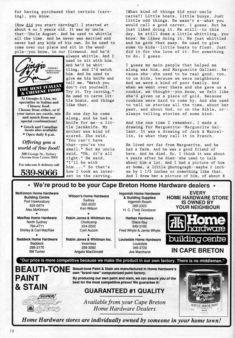 Published by Ronald Caplan on 1992/6/1 (147 reads)for having purchased that certain (carv? ing) , you know. (How did you start carving?) I started at about 4 or 5 years old. It was my uncle that--Uncle August. And he used to whittle all the time. And he never was married and never had any kids of his own. So he used to come over our place and sit in the wood? pile- -you know, in our firewood. And he'd always whittle. And I used to sit with him. And he'd be whit? tling, and I'd watch him. And he used to give me his knife and tell me, "Watch you don't cut yourself. Try it. Try carving," He used to carve lit? tle boats, and things like that. So one day he came along, and he had a knife for me--a lit? tle jackknife. My mother was kind of scared. She said, "You can't have that--you're too small," But my uncle said, "Oh, it's all right," He said, "I'll be with him.,,," So that's how I took an inter? est in the carving. At Gioi'o & Lim, we specialize in Italian and Chinese food. Choose from either, or if your tastes are exotic, mix and match from our special combinations! • Greek and Canadian items also available • Open daily 4 p.m. Offering you a world of fine food! 536 George St., Sydney (Across from Centre 200) For take-out & delivery call 539-8066 (What kind of things did your uncle carve?) Little boats, little buoys. Just little odd things. He wasn't a--what you would call a good carver, I guess. But he just liked doing it. He still--to this day, he still does a little whittling, you know. He likes doing it. He just whittled and he gave that away. He used to give some to kids--little boats to float. Just did it for the love of it. For something to do. I guess, I guess my main people that helped me along was him, and Marguerite Gallant, Be? cause she--she used to be real good, too, to us kids, because we were neighbours. And we were a kind of poor family. And when we went over there and she gave us a cookie, we thought--you know, we felt like she'd given us a piece of gold. Because cookies were hard to come by. And she used to tell us stories all the time, about her past, and about God, or on the Bible, or-- always telling stories of some kind. And the one time I remember, I made a drawing for Marguerite--Marguerite Gal? lant, It was a drawing of Jack k Marcel? lin, is what they call it in French. He lived not far from Marguerite, and he had a farm. And he was a good friend of hers, And he died. So, I think it was about 4 years after he died--she used to talk about him a lot, And I had a picture of him at home, a little photograph--maybe 2 inch? es by 1 1/2 inches or something like that. And I drew her a picture of him, of about 8 We're proud to be your Cape Breton Home Hardware dealers McKinnon Home Hardware Building Centre Port Hawkesbury 625-0674 Alex McKinnon • MacRae Home Hardware North Sydney 794-4711 Shirley & Carl MacRae • Baddecl( Home Hardware Baddeck 295-2170 Bill Turner Wilson's Home Hardware Sydney 562-6020 Ken Wilson • Robin Jones & Whitman Inc. Cheticamp 224-2022 Cyril Aucoin • Robin Jones & Whitman Inc. Inverness 258-3092 Angela MacDonald Ingonish Home Hardware & Building Supplies Ingonish Beach 285-2323 H. C. (Ted) Goodyear • Harbax Hardware Glace Bay 849-3108 Fred Whyte & Jamie Whyte • Louisdale Home Hardware Louisdale 345-2720 Joe Marchand EVERY HOME HARDWARE STORE IS OWNED BY YOUR NEIGHBOUR "*''' hardware building centre IN CAPE BRETON "Our price is more competitive because we make the product in our own factory. There is no middleman.' D P A MTI -TO N E Beauti-tone Paint & Stain are manufactured in Home Hardware's "''"'''' ?? ?? ?? V'"''- own "brand new" computerized paint factory. PAINT & STAIN By producing our own paint and stain, we can assure you of the best for the most competitive prices! We guarantee it! GUARANTEED #1 QUALITY Available from your Cape Breton Home Hardware Dealers Home Hardware stores are individually owned by someone in your home town!