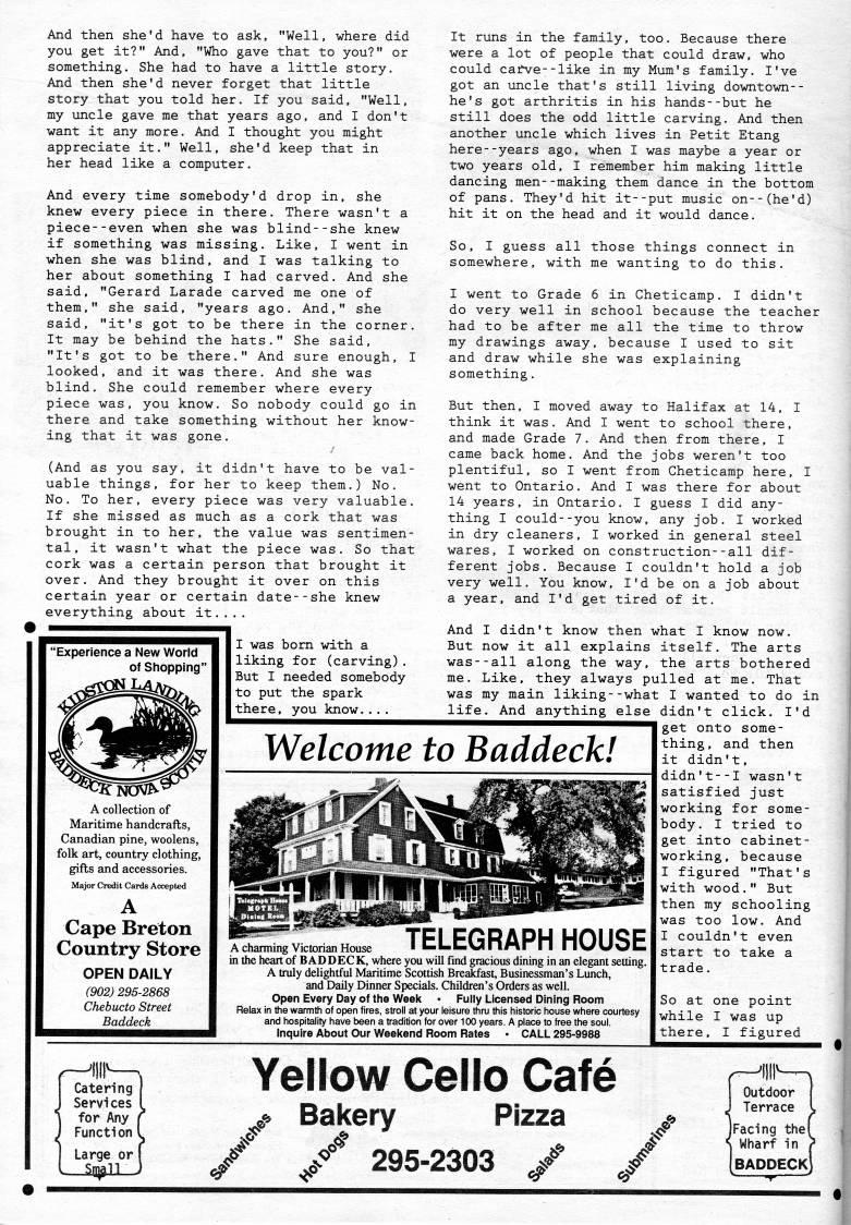 Published by Ronald Caplan on 1992/6/1 (185 reads)And then she'd have to ask, "Well, where did you get it?" And, "Who gave that to you?" or something. She had to have a little story. And then she'd never forget that little story that you told her. If you said, "Well, my uncle gave me that years ago, and I don't want it any more. And I thought you might appreciate it." Well, she'd keep that in her head like a computer. And every time somebody'd drop in. she knew every piece in there. There wasn't a piece--even when she was blind--she knew if something was missing. Like, I went in when she was blind, and I was talking to her about something I had carved. And she said, "Gerard Larade carved me one of them," she said, "years ago. And," she said, "it's got to be there in the corner. It may be behind the hats," She said, "It's got to be there." And sure enough, I looked, and it was there. And she was blind. She could remember where every piece was, you know. So nobody could go in there and take something without her know? ing that it was gone, (And as you say, it didn't have to be val? uable things, for her to keep them,) No, No, To her, every piece was very valuable. If she missed as much as a cork that was brought in to her, the value was sentimen? tal, it wasn't what the piece was, So that cork was a certain person that brought it over. And they brought it over on this certain year or certain date--she knew everything about it.,,. 'Experience a New Worid of Shopping" A collection of Maritime handcrafts, Canadian pine, woolens, folk art, country clothing, gifts and accessories. Major Credit Cards Accepted A Cape Breton Country Store OPEN DAILY (902) 295-2868 Chebucto Street Baddeck I was bom with a liking for (carving). But I needed somebody to put the spark there, you know.... It runs in the family, too. Because there were a lot of people that could draw, who could cai?ve--like in my Mum's family, I've got an uncle that's still living downtown-- he's got arthritis in his hands--but he still does the odd little carving. And then another uncle which lives in Petit Etang here--years ago, when I was maybe a year or two years old, I remember him making little dancing men--making them dance in the bottom of pans. They'd hit it--put music on--(he'd) hit it on the head and it would dance. So, I guess all those things connect in somewhere, with me wanting to do this, I went to Grade 6 in Cheticamp, I didn't do very well in school because the teacher had to be after me all the time to throw my drawings away, because I used to sit and draw while she was explaining something. But then, I moved away to Halifax at 14, I think it was. And I went to school there, and made Grade 7, And then from there, I came back home. And the jobs weren't too plentiful, so I went from Cheticamp here, I went to Ontario. And I was there for about 14 years, in Ontario. I guess I did any? thing I could--you know, any job, I worked in dry cleaners, I worked in general steel wares, I worked on construction--all dif? ferent jobs. Because I couldn't hold a job very well. You know, I'd be on a job about a year, and I'd get tired of it. And I didn't know then what I know now. But now it all explains itself. The arts was--all along the way, the arts bothered me. Like, they always pulled at me. That was my main liking--what I wanted to do in life. And anything else didn't click, I'd get onto some? thing, and then it didn't, didn't--! wasn't satisfied just working for some? body. I tried to get into cabinet- working, because I figured "That's with wood." But then my schooling was too low. And I couldn't even start to take a trade, So at one point while I was up there, I figured Welcome to Baddeck! A charming Victorian House ?? tLtvJIrlAr n MV/UuCI in the heart of BADDECK, where you will find gracious dining in an elegant setting. A tmly delightful Maritime Scottish Breakfast, Businessman's Lunch, and Daily Dinner Specials. Children's Orders as well. Open Every Day of the Weeit • Fully Licensed Dining Room Relax in the warmth of open fires, stroll at your leisure thru this historic house where courtesy and hospitality have been a tradition for over 100 years. A place to free the soul. Inquire About Our Weeltend Room Rates • CALL 295-9988 Yellow Cello Cafe y Bakery Pizza '/ 295-2303 ,/