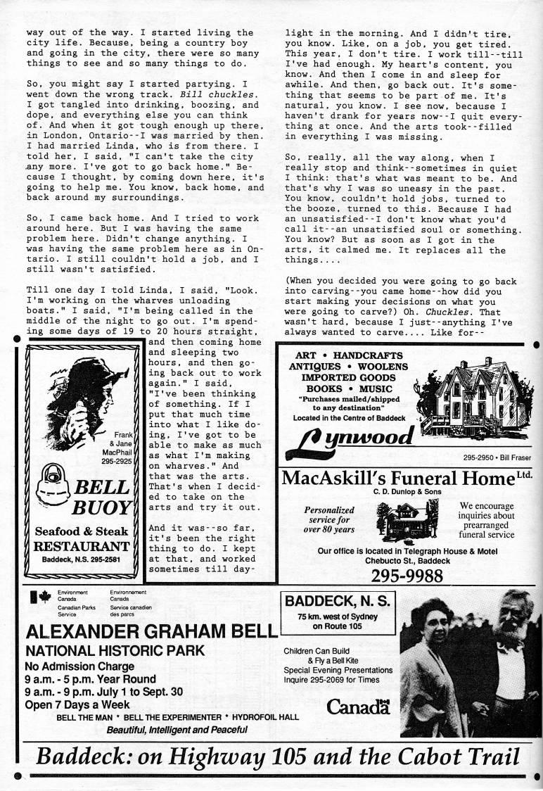 Published by Ronald Caplan on 1992/6/1 (139 reads)way out of the way. I started living the city life. Because, being a country boy and going in the city, there were so many things to see and so many things to do. So, you might say I started partying. I went down the wrong track. Bill chuckles. 1 got tangled into drinking, boozing, and dope, and everything else you can think of. And when it got tough enough up there, in London, Ontario--I was married by then, I had married Linda, who is from there. I told her, I said, "I can't take the city .any more. I've got to go back home." Be? cause I thought, by coming down here, it's going to help me. You know, back home, and back around my surroundings. So, I came back home. And I tried to work around here. But I was having the same problem here. Didn't change anything, I was having the same problem here as in On? tario, I still couldn't hold a job, and I still wasn't satisfied. Till one day I told Linda, I said, "Look, I'm working on the wharves unloading boats," I said, "I'm being called in the middle of the night to go out, I'm spend? ing some days of 19 to 20 hours straight, and then coming home and sleeping two hours, and then go? ing back out to work again," I said, "I've been thinking of something. If I put that much time into what I like do? ing, I've got to be able to make as much as what I'm making on wharves." And that was the arts. That's when I decid? ed to take on the arts and try it out. And it was--so far, it's been the right thing to do. I kept at that, and worked sometimes till day- a&JSay; BUOY Seafood & Steak j RESTAURANT | Baddeck, N.S. 295-2581 ' 1' Environnrent Environnement Canada Canada Canadian Parks Service canadien light in the morning. And I didn't tire, you know. Like, on a job, you get tired. This year, I don't tire. I work till--till I've had enough. My heart's content, you know. And then I come in and sleep for awhile. And then, go back out. It's some? thing that seems to be part of me. It's natural, you know, I see now, because I haven't drank for years now--I quit every? thing at once. And the arts took--filled in everything I was missing. So, really, all the way along, when I really stop and think--sometimes in quiet I think: that's what was meant to be. And that's why I was so uneasy in the past. You know, couldn't hold jobs, turned to the booze, turned to this. Because I had an unsatisfied--I don't know what you'd call it--an unsatisfied soul or something. You know? But as soon as I got in the arts, it calmed me. It replaces all the things,,.. (When you decided you were going to go back into carving--you came home--how did you start making your decisions on what you were going to carve?) Oh. Chuckles. That wasn't hard, because I just--anything I've always wanted to carve.... Like for-- ART • HANDCRAFTS ANTIQUES • WOOLENS IMPORTED GOODS BOOKS • MUSIC "Purchases mailed/shipped to any destination" Located in the Centre of Baddeck /9yni4food 295-2950 • Bill Fraser MacAskiirs Funeral Home'*"' C. D. Dunlop & Sons Personalized service for over 80 years We encourage inquiries about prearranged funeral service Our office is iocated in Telegraph House & Motel Chebucto St., Baddeck 295-9988 ALEXANDER GRAHAM BELL NATIONAL HISTORIC PARK No Admission Charge 9 a.m. - 5 p.m. Year Round 9 a.m. - 9 p.m. July 1 to Sept. 30 Open 7 Days a Weel< BADDECK, N. S, 75 km. west of Sydney on Route 105 Children Can Build & Fly a Bell Kite Special Evening Presentations Inquire 295-2069 for Times BELL THE MAN * BELL THE EXPERIMENTER * HYDROFOIL HALL Beautiful, Intelligent and Peaceful Canada Baddeck: on Highway 105 and the Cabot Trail