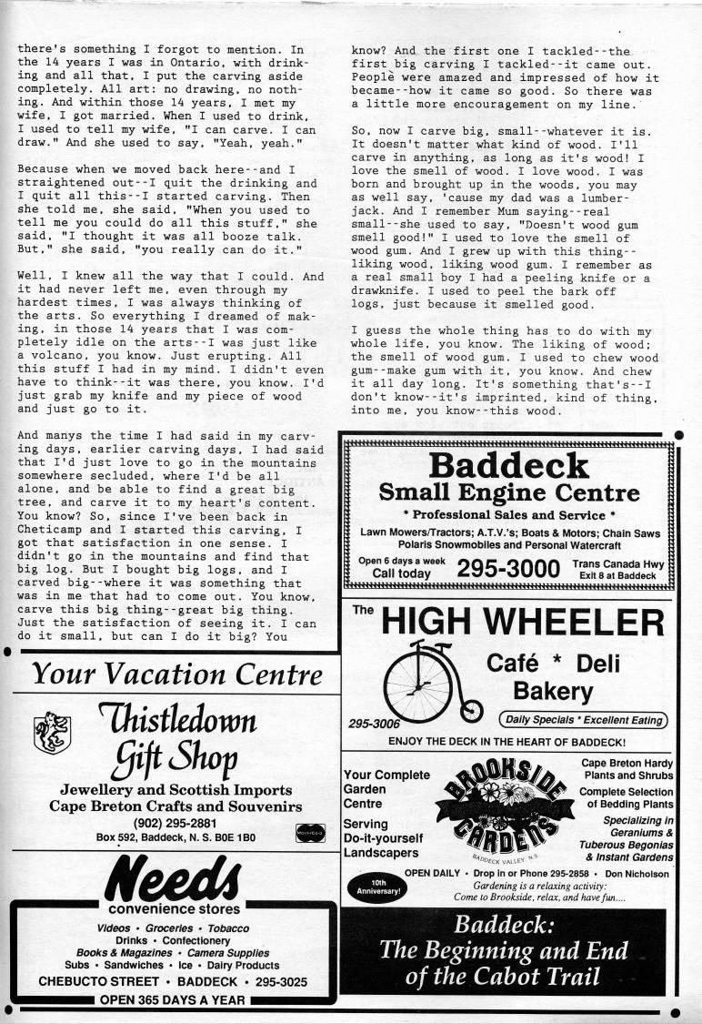 Published by Ronald Caplan on 1992/6/1 (123 reads)there's something I forgot to mention. In the 14 years I was in Ontario, with drink? ing and all that, I put the carving aside completely. All art: no drawing, no noth? ing. And within those 14 years, I met my wife, I got married. When I used to drink, I used to tell my wife, "I can carve. I can draw." And she used to say, "Yeah, yeah." Because when we moved back here--and I straightened out--I quit the drinking and I quit all this--I started carving. Then she told me, she said, "When you used to tell me you could do all this stuff." she said, "I thought it was all booze talk. But," she said, "you really can do it," Well, I knew all the way that I could. And it had never left me, even through my hardest times, I was always thinking of the arts. So everything I dreamed of mak? ing, in those 14 years that I was com? pletely idle on the arts--I was just like a volcano, you know. Just erupting. All this stuff I had in my mind, I didn't even have to think--it was there, you know, I'd just grab my knife and my piece of wood and just go to it. And manys the time I had said in my carv? ing days, earlier carving days, I had said that I'd just love to go in the mountains somewhere secluded, where I'd be all alone, and be able to find a great big tree, and carve it to my heart's content. You know? So, since I've been back in Cheticamp and I started this carving, I got that satisfaction in one sense. I didn't go in the mountains and find that big log. But I bought big logs, and I carved big--where it was something that was in me that had to come out. You know, carve this big thing--great big thing. Just the satisfaction of seeing it, I can do it small, but can I do it big? You Your Vacation Centre Dtistlcdown 'iftShof Jewellery and Scottish Imports Cape Breton Crafts and Souvenirs (902) 295-2881 Box 592, Baddeck, N. S. BOE 1B0 JKeaU convenience stores ' Videos • Groceries • Tobacco Drinks • Confectionery Booi(S & Magazines • Camera Suppiies Subs • Sandwiches • ice • Dairy Products CHEBUCTO STREET • BADDECK • 295-3025 I OPEN 365 DAYS A YEAR I know? And the first one I tackled--the first big carving I tackled--it came out. People were amazed and impressed of how it became--how it came so good. So there was a little more encouragement on my line. So, now I carve big, small--whatever it is. It doesn't matter what kind of wood. I'll carve in anything, as long as it's wood! I love the smell of wood, I love wood. I was born and brought up in the woods, you may as well say, 'cause my dad was a lumber? jack. And I remember Mum saying--real small--she used to say, "Doesn't wood gum smell good!" I used to love the smell of wood gum. And I grew up with this thing-- liking wood, liking wood gum. I remember as a real small boy I had a peeling knife or a drawknife, I used to peel the bark off logs, just because it smelled good, I guess the whole thing has to do with my whole life, you know. The liking of wood; the smell of wood gum. I used to chew wood gum--make gum with it, you know. And chew it all day long. It's something that's--I don't know--it's imprinted, kind of thing, into me, you know--this wood. '''''''''''''''''''''''''''''''''''''''''''''''''''''''''''''''''''''''''''''''''1 Baddeck Small Engine Centre * Professional Sales and Service * Lawn Mowers/Tractors; A,T,V,'s; Boats & Motors; Chain Saws Polaris Snowmobiles and Personal Watercraft Open 6 days a week OQC 0000 Trans Canada Hwy Call today '9%/"OUUU Exit 8 at Baddeck ?<<<<<<<?<<< • < = * InstdM Gartiens ILY • Drop in or Phone 295-2858 • Don Nicholson Gardening is a relaxing activity: Come to Brookside, relax, and have fun.... Baddeck: The Beginning and End of the Cahot Trail