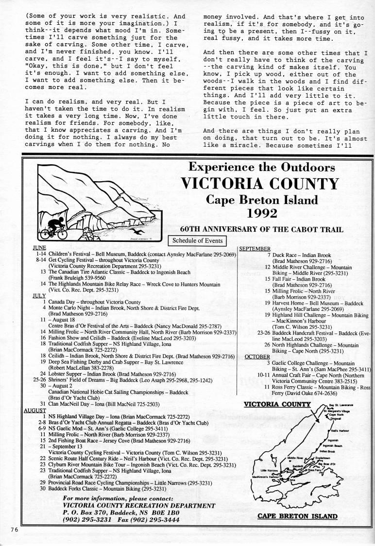 Published by Ronald Caplan on 1992/6/1 (174 reads)(Some of your work is very realistic. And some of it is more your imagination,) I think--it depends what mood I'm in. Some? times I'll carve something just for the sake of carving. Some other time, I carve, and I'm never finished, you know, I'll carve, and I feel it's--I say to myself, "Okay, this is done," but I don't feel it's enough. I want to add something else, I want to add something else. Then it be? comes more real. I can do realism, and very real. But I haven't taken the time to do it. In realism it takes a very long time. Now, I've done realism for friends. For somebody, like, that I know appreciates a carving. And I'm doing it for nothing, I always do my best carvings when I do them for nothing. No money involved. And that's where I get into realism, if it's for somebody, and it's go? ing tp be a present, then I--fussy on it, real fussy, and it takes more time. And then there are some other times that I don't really have to think of the carving --the carving kind of makes itself. You know, I pick up wood, either out of the woods--I walk in the woods and I find dif? ferent pieces that look like certain things. And I'll add very little to it. Because the piece is a piece of art to be? gin with, I feel. So just put an extra little touch in there. And there are things I don't really plan on doing, that turn out to be. It's almost like a miracle. Because sometimes I'll Experience the Outdoors VICTORIA COUNTY Cape Breton Island 1992 60TH ANNIVERSARY OF THE CABOT TRAIL JUNE 1-14 8-14 JULY 1 4 24 25-26 30 31 AUgUST Children's Festival - Bell Museum, Baddeck (contact Aynsley MacFarlane 295-2069) Get Cycling Festival - throughout Victoria County (Victoria County Recreation Department 295-3231) The Canadian Tire Atlantic Classic - Baddeck to Ingonish Beach (Frank Bruleigh 539-9560 The Highlands Mountain Bike Relay Race - Wreck Cove to Hunters Mountain (Vict. Co. Rec. Dept. 295-3231) Canada Day - throughout Victoria County Monte Carlo Night - Indian Brook, North Shore & District Fire Dept. (Brad Matheson 929-2716) - August 18 Centre Bras d'Or Festival of the Arts - Baddeck (Nancy MacDonald 295-2787) Milling Frolic - North River Community Hall, North River (Barb Morrison 929-2337) Fashion Show and Ceilidh - Baddeck (Eveline MacLeod 295-3203) Traditional Codfish Supper - NS Highland Village, lona (Brian MacCormack 725-2272) Ceilidh - Indian Brook, North Shore & District Fire Dept. (Brad Matheson 929-2716) Deep Sea Fishing Derby and Crab Supper - Bay St. Lawrence (Robert MacLellan 383-2278) Lobster Supper - Indian Brook (Brad Matheson 929-2716) Shriners' Field of Dreams - Big Baddeck (Leo Asaph 295-2968,295-1242) - August 2 Canadian National Hobie Cat Sailing Championships - Baddeck (Bras d'Or Yacht Club) Clan MacNeil Day - lona (Bill MacNeil 725-2503) NS Highland Village Day - lona (Brian MacCormack 725-2272) Bras d'Or Yacht Club Annual Regatta - Baddeck (Bras d'Or Yacht Club) NS Gaelic Mod - St. Ann's (Gaelic College 295-3411) Milling Frolic - North River (Barb Morrison 929-2337) 2nd Fishing Boat Race - Jersey Cove (Brad Matheson 929-2716) - September 13 Victoria County Cycling Festival - Victoria County (Tom C. Wilson 295-3231) Scenic Route Half Century Ride - Neil's Harbour (Vict. Co. Rec. Dept. 295-3231) Clybum River Mountain Bike Tour - Ingonish Beach (Vict. Co. Rec. Dept. 295-3231) Traditional Codfish Supper - NS Highland Village, lona (Brian MacCormack 725-2272) Provincial Road Race Cycling Championships - Little Narrows (295-3231) Baddeck Forks Classic - Mountain Biking (295-3231) For more information, please contact: VICTORIA COUNTY RECREATION DEPARTMENT P. O. Box 370, Baddeck, NS BOE IBO (902) 295-3231 Fax (902) 295-3444 SEPTEMBER 7 Duck Race - Indian Brook (Brad Matheson 929-2716) ' 12 Middle River Challenge - Mountain Biking - Middle River (295-3231) 15 Fall Fair - Indian Brook (Brad Matheson 929-2716) 15 Milling Frolic - North River (Barb Morrison 929-2337) 19 Harvest Home - Bell Museum - Baddeck (Aynsley MacFarlane 295-2069) 19 Highland Hill Challenge - Mountain Biking - MacKinnon's Harbour (Tom C.Wilson 295-3231) 23-26 Baddeck Handcraft Festival - Baddeck (Eve? line MacLeod 295-3203) 26 North Highlands Challenge - Mountain Biking - Cape North (295-3231) OCTOBER 3 Gaelic College Challenge - Mountain Biking - St. Ann's (Sam MacPhee 295-3411) 10-11 Annual Craft Fair - Cape North (Northern Victoria Community Centre 383-2515) 11 Ross Ferry Classic - Mountain Biking - Ross Ferry (David Oake 674-2636) VICTORIA COUNTY CAPE BRETON ISLAND