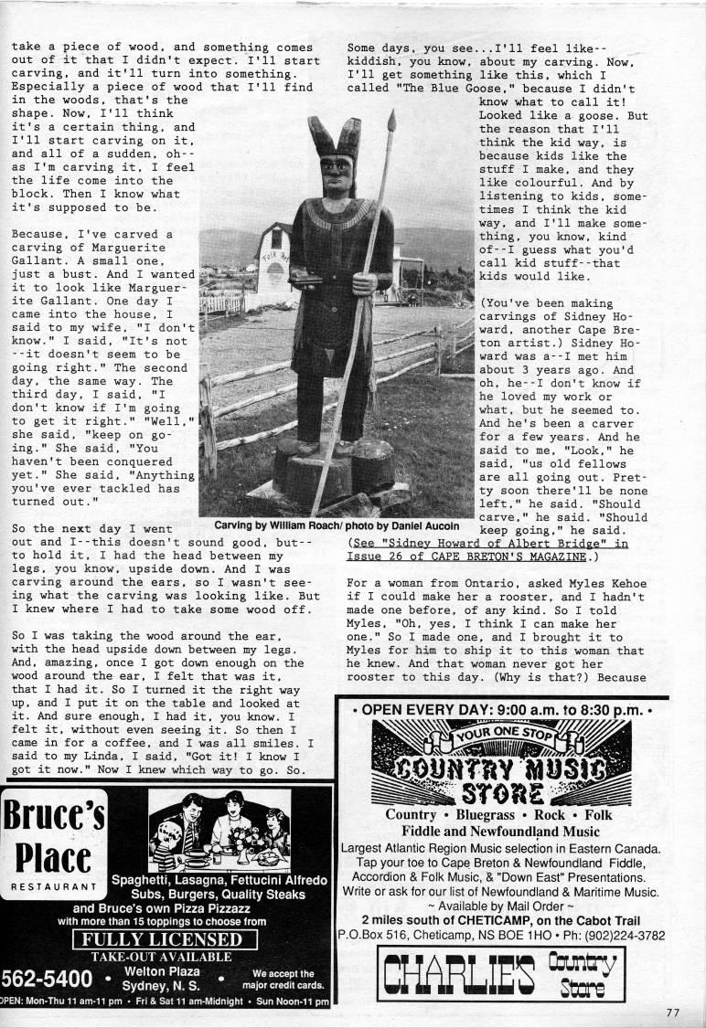 Published by Ronald Caplan on 1992/6/1 (171 reads)take a piece of wood, and something comes out of it that I didn't expect. I'll start carving, and it'll turn into something. Especially a piece of wood that I'll find in the woods, that's the shape. Now, I'll think it's a certain thing, and I'll start carving on it, and all of a sudden, oh-- as I'm carving it, I feel the life come into the block. Then I know what it's supposed to be. Because, I've carved a carving of Marguerite Gallant. A small one, just a bust. And I wanted it to look like Marguer? ite Gallant. One day I came into the house, I said to my wife, "I don't know." I said, "It's not --it doesn't seem to be going right," The second day, the same way. The third day, I said, "I don't know if I'm going to get it right," "Well," she said, "keep on go? ing." She said, "You haven't been conquered yet." She said, "Anything you've ever tackled has turned out," Some days, you see,,.I'11 feel like-- kiddish, you know, about my carving. Now, I'll get something like this, which I called "The Blue Goose," because I didn't know what to call it! ' Looked like a goose. But the reason that I'll think the kid way, is because kids like the stuff I make, and they like colourful. And by listening to kids, some? times I think the kid way, and I'll make some? thing, you know, kind of--I guess what you'd call kid stuff--that kids would like. ??v-:; So the next day I went out and I--this doesn't sound good, but-- to hold it, I had the head between my legs, you know, upside down. And I was carving around the ears, so I wasn't see? ing what the carving was looking like. But I knew where I had to take some wood off. So I was taking the wood around the ear, with the head upside down between my legs. And, amazing, once I got down enough on the wood around the ear, I felt that was it, that I had it. So I turned it the right way up, and I put it on the table and looked at it. And sure enough, I had it, you know. I felt it, without even seeing it. So then I came in for a coffee, and I was all smiles. I said to my Linda, I said, "Got it! I know I got it now," Now I knew which way to go. So, Carving by William Roach/ photo by Daniel Aucoin (You've been making carvings of Sidney Ho- . .' ward, another Cape Bre- ? ., ... ton artist,) Sidney Ho- S ??>.' • ?'''T ward was a--I met him _..-.'"'- • ..Ifei''i'v about 3 years ago. And ' • ??'C;;'''.'~'??b--:.; '"'"'"~ oh, he--I don't know if '??-, • ??- • /,-??'<'??' ' he loved my work or ??'',.'''" " "* ' what, but he seemed to. ??''.- _' ??'''??..,...- -. And he's been a carver .-" • '. >'...-',-, for a few years. And he .V*. , y-'.,v>i'i,..,-l ,' said to me, "Look," he Jy -..-.'' • • ? said, "us old fellows are all going out. Pret? ty soon there'll be none left," he said, "Should carve," he said, "Should keep going," he said. (See "Sidney Howard of Albert Bridge" in Issue 26 of CAPE BRETON'S MAGAZINE,) For a woman from Ontario, asked Myles Kehoe if I could make her a rooster, and I hadn't made one before, of any kind. So I told Myles, "Oh, yes, I think I can make her one," So I made one, and I brought it to Myles for him to ship it to this woman that he knew. And that woman never got her rooster to this day, (Why is that?) Because Bruce'sl Place Spaghetti, Lasagna, Fettucini Alfredo Subs, Burgers, Quality Steaks and Bruce's own Pizza Pizzazz with more than 15 toppings to choose from FULLY LICENSED TAKE-OUT AVAILABLE ceo C/inn • Welton Plaza ' weacceptthe jO??,'OHtjJ Sydney, N.S. major credit cards. PEN: IVIon-Thu 11 am-11 pm • Fri & Sat 11 am-Midnight • Sun Noon-11 pm RESTAURANT OPEN EVERY DAY: 9:00 a.m. to 8:30 p.m. • Country • Bluegrass • Rock • Folk Fiddle and Newfoundland Music Largest Atlantic Region Music selection in Eastern Canada. Tap your toe to Cape Breton & Newfoundland Fiddle, Accordion & Folk Music, & "Down East" Presentations. Write or ask for our list of Newfoundland & Maritime Music. ~ Available by Mail Order ~ 2 miles south of CHETICAMP, on the Cabot Trail P.O.Box 516, Cheticamp, NS BOE 1H0 • Ph: (902)224-3782