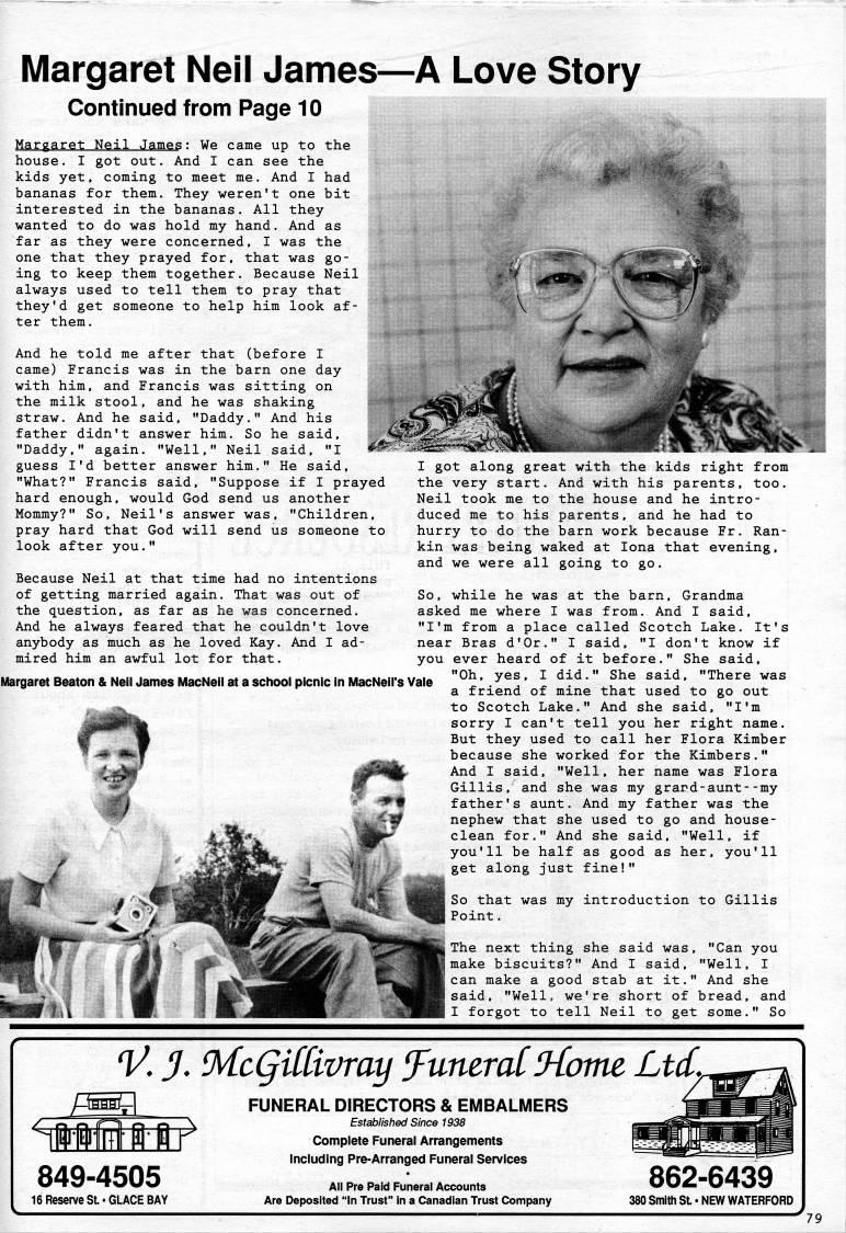 Published by Ronald Caplan on 1992/6/1 (134 reads)Margaret Neil James • A Love Story Continued from Page 10 Margaret Neil James: We came up to the house. I got out. And I can see the kids yet, coming to meet me. And I had bananas for them. They weren't one bit interested in the bananas. All they wanted to do was hold my hand. And as far as they were concerned, I was the one that they prayed for, that was go? ing to keep them together. Because Neil always used to tell them to pray that they'd get someone to help him look af? ter them. And he told me after that (before I came) Francis was in the barn one day with him, and Francis was sitting on the milk stool, and he was shaking straw. And he said, "Daddy." And his father didn't answer him. So he said, "Daddy," again. "Well," Neil said, "I guess I'd better answer him." He said, "What?" Francis said, "Suppose if I prayed hard enough, would God send us another Mommy?" So, Neil's answer was, "Children, pray hard that God will send us someone to look after you." Because Neil at that time had no intentions of getting married again. That was out of the question, as far as he was concerned. And he always feared that he couldn't love anybody as much as he loved Kay. And I ad? mired him an awful lot for that, lUlargaret Beaton & Neil James MacNeil at a school picnic in MacNeil's Vale I got along great with the kids right from the very start. And with his parents, too. Neil took me to the house and he intro? duced me to his parents, and he had to hurry to do the barn work because Fr. Ran? kin was being waked at lona that evening, and we were all going to go. So, while he was at the barn. Grandma asked me where I was from. And I said, "I'm from a place called Scotch Lake, It's near Bras d'Or," I said, "I don't know if you ever heard of it before." She said, "Oh, yes, I did." She said, "There was a friend of mine that used to go out to Scotch Lake." And she said, "I'm sorry I can't tell you her right name. But they used to call her Flora Kimber because she worked for the Kimbers." And I said, "Well, her name was Flora Gillis, and she was my grand-aunt--my father's aunt. And my father was the nephew that she used to go and house- clean for." And she said, "Well, if you'll be half as good as her, you'll get along just fine!" So that was Point. my introduction to Gillis The next thing she said was, "Can you make biscuits?" And I said, "Well, I can make a good stab at it." And she said, "Well, we're short of bread, and I forgot to tell Neil to get some." So 849-4505 16 Resenre St • GLACE BAY V. J. McQiCCivray J'uneraC9-Come Ltd. FUNERAL DIRECTORS & EMBALMERS Established Since 1938 Complete Funeral Arrangements Including Pre-Arranged Funeral Services All Pre Paid Funeral Accounts Are Deposited "In Trust" in a Canadian Trust Company 862-6439 380 Smith SL • NEW WATERFORD