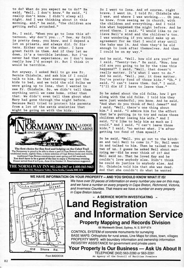 Published by Ronald Caplan on 1992/6/1 (144 reads)to do? What do you expect me to do?" He said, "Well, I don't know," He said, "I really don't know, I didn't sleep all night. And I was thinking about it this morning, and," he said, "the children are getting awful attached." So, I said, "When you go to lona this af? ternoon, why don't you...." See, my faith is pretty deep, you know, and I depend a lot on priests, and always did. Or Sis? ters, Either one or the other, I have great faith in them. And if they let me down, it's a terrible letdown. But I've never had that experience, so I don't know really how I'd accept it. But I think it would be terrible. But anyway, I asked Neil to go see Fr, Bernie Chisholm, and ask him if I could talk to him. So that evening--we put the kids to bed, and we told the old folks we were going up to lona, that I wanted to see Fr. Chisholm, So, we didn't tell them anything until we came home, other than that. We didn't even tell them about what Mary had gone through the night before. Because Neil tried to protect his parents from a lot of the extra anxieties that might be going on with the kids,,.. The first choice for fine food and lodging on the Cabot Trail The Normaway is proud to be able to share a part of Cape Breton's culture. Enjoy traditional music, nightly films, a choice selection of Cape Breton books and records, traditional Cape Breton entertainment most spring and fall weekends. You don't have to be a guest of the Inn to eiyoy a Normaway evening. Dinner served from 6 to 9 p.m., June 15 to October 15. Reservations suggested. THE NORMAWAY INN 902-248-2987 or 1-800-565-9463 P.O. Box 142, Margaree Vallev, Nova Scotia, Canada BOE 2C0 So I went to lona. And of course, right brave, I went in, I told Fr, Chisholm who I 'fJa$??, and where I was working,,,. Oh yes, he knew, from seeing me in church, with the children and everything. And I told him what happened the night before. And he stood there, I said, "I would like to re? lieve Neil's mind and the children's too, I was wondering if you would make up an agreement for me that I would stay until the baby was 14, And then they'd be old enough to look after themselves. And then I could be on my way." And he said, "Well, how old are you?" And I said, "Twenty-two." He said, "Now, how old are you going to be by the time this happens?" I said, "Well, that doesn't really matter. It's what I want to do." And he said, "Well, yes, it does matter. You're pretty fond of those kids," "Oh," I said, "I can't leave them. God," I said, "I'll die if I have to leave them," So he asked about the old folks, how I got along with the old folks, I told him they were just wonderful, you know. And he said, "And what do you think of Neil James?" And I said, "Well, there's one thing about him," I said, "I admire him for the effort that he's putting in to try and raise those children after losing his wife." And I said, "I'd like to help him as much as I could," And I said, "I can't leave those kids," I said, "no matter what, I'm after getting too fond of them myself." So he said, "Well, you go out to the kitch? en and tell Neil to come in," So, Neil went in and talked to him. Then he talked to the two of us, I guess he asked Neil about mar? rying me--did he ever think of it? And Neil said no, That he loved Kay and he couldn't love anybody else. Didn't think he could do justice to anybody else. And Fr, Chisholm told him that she was dead. And that she couldn't do what he wanted WE HAVE INFORMATION ON YOUR PROPERTY - AND YOU SHOULD KNOW WHAT IT IS! We have over 20 pieces of information on every number you see on this map, and we have a number on every property in Cape Breton, Richmond, Victoria, and Inverness Counties. That means we have a number on every property in Cape Breton Island. ~ A SERVICE WORTH INVESTIGATING ~ Land Registration and Information Service Property Mapping and Records Division 66 Wentworth Street, Sydney, N. S. B1P 6T4 CONTROL SYSTEM of concrete monuments for surveying BASE MAPS: Orthophoto for rural areas, Line Maps for cities, town, villages PROPERTY MAPS with boundary information and ownership information REGISTRY ASSISTANCE for government and private users Your Property Is Our Business • Ask Us About It TELEPHONE (902) 563-2280 or 563-2281 From BADDECK An Agency of the Council of Maritime Premiers