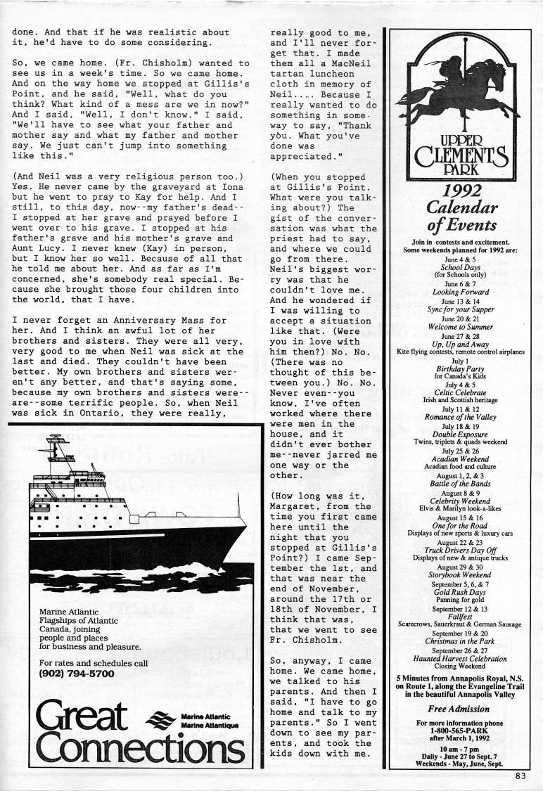 Published by Ronald Caplan on 1992/6/1 (133 reads)done. And that if he was realistic about it, he'd have to do some considering. So, we came home, (Fr, Chisholm) wanted to see us in a week's time. So we came home. And on the way home we stopped at Gillis's Point, and he said, "Well, what do you think? What kind of a mess are we in now?" And I said, "Well, I don't know." I said, "We'll have to see what your father and mother say and what my father and mother say. We just can't jump into something like this," (And Neil was a very religious person too,) Yes. He never came by the graveyard at lona but he went to pray to Kay for help. And I still, to this day, now--my father's dead-- I stopped at her grave and prayed before I went over to his grave, I stopped at his father's grave and his mother's grave and Aunt Lucy, I never knew (Kay) in person, but I know her so well, Because of all that he told me about her. And as far as I'm concerned, she's somebody real special. Be? cause she brought those four children into the world, that I have, I never forget an Anniversary Mass for her. And I think an awful lot of her brothers and sisters. They were all very, very good to me when Neil was sick at the last and died. They couldn't have been better. My own brothers and sisters wer? en't any better, and that's saying some, because my own brothers and sisters were-- are--some terrific people. So, when Neil was sick in Ontario, they were really. Marine Atlantic Flagships of Atlantic Canada, joining people and places for business and pleasure. For rates and schedules call (902) 794-5700 , Marine Atlantic Marine Atlantique Great ' Connections really good to me, and I'll never for? get that. I made them all a MacNeil tartan luncheon cloth in memory of Neil Because I really wanted to do something in some? way to say, "Thank you. What you've done was appreciated," (When you stopped at Gillis's Point, What were you talk? ing about?) The gist of the conver? sation was what the priest had to say, and where we could go from there, Neil's biggest wor? ry was that he couldn't love me. And he wondered if I was willing to accept a situation like that. (Were you in love with him then?) No, No. (There was no thought of this be? tween you.) No. No. Never even--you know, I've often worked where there were men in the house, and it didn't ever bother me--never jarred me one way or the other, (How long was it, Margaret, from the time you first came here until the night that you stopped at Gillis's Point?) I came Sep? tember the 1st, and that was near the end of November, around the 17th or 18th of November, I think that was, that we went to see Fr. Chisholm. So, anyway, I came home. We came home, we talked to his parents. And then I said, "I have to go home and talk to my parents," So I went down to see my par? ents , and took the kids down with me. 1992 Calendar of Events Join in contests and excitement. Some weekends planned for 1992 are: June 4 & 5 School Days (for Schools only) June 6 & 7 Looking Forward June 13 & 14 Sync for your Supper June 20 & 21 Welcome to Summer June 27 & 28 Up, Up and Away Kite flying contests, remote control airplanes Julyl Birthday Party for Canada's Kids July4&5 Celtic Celebrate Irish and Scottish heritage July 11 & 12 Romance of the Valley July 18 & 19 Double Exposure Twins, triplets & quads weekend July 25 & 26 Acadian Weelcend Acadian food and culture August 1,2, & 3 Battle of the Bands August 8 & 9 Celebrity Weekend Elvis & Marilyn look-a-likes August 15 & 16 One for the Road Displays of new sports & luxury cars August 22 & 23 Truck Drivers Day Off Displays of new & antique trucks August 29 & 30 Storybook Weekend September 5, 6, & 7 Gold Rush Days Panning for gold September 12 & 13 Fallfest Scarecrows, Sauerkraut & German Sausage September 19 & 20 Christmas in the Park September 26 & 27 Haunted Harvest Celebration Closing Weekend 5 Minutes from Annapolis Royal, N,S. on Route 1, along the Evangeline Trail in the beautiful Annapolis Valley Free Admission For more information phone 1-800-565-PARK after March 1,1992 10 am - 7 pm Dally - June 27 to Sept. 7 Weekends - May, June, Sept 83