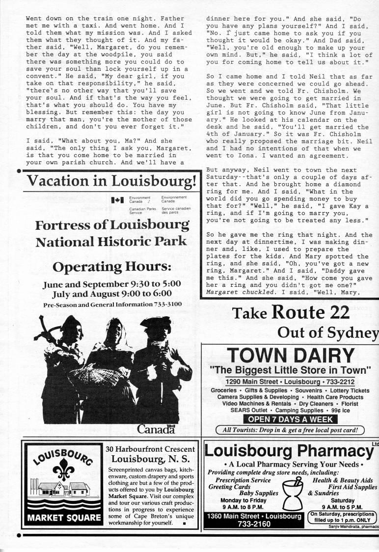 Published by Ronald Caplan on 1992/6/1 (195 reads)Went down on the train one night. Father met me with a taxi. And went home. And I told them what my mission was. And I asked them what they thought of it. And my fa? ther said, "Well, Margaret, do you remem? ber the day at the woodpile, you said there was something more you could do to save your soul than lock yourself up in a convent." He said, "My dear girl, if you take on that responsibility," he said, "there's no other way that you'll save your soul. And if that's the way you feel, that's what you should do. You have my blessing. But remember this: the day you marry that man, you're the mother of those children, and don't you ever forget it," I said, "What about you. Ma?" And she said, "The only thing I ask you, Margaret, is that you come home to be married in your own parish church. And we'll have a Vacation in Louisbourg! 1'1 Canada / Canada Canadian Parks Service canadien Fortress of Louisbourg National Historic Park Operating Hours: June and September 9:30 to 5:00 July and August 9:00 to 6:00 Pre-Season and General Information 733-3100 dinner here for you." And she said, "Do you have any plans yourself?" And I said, "No. 1" just came home to ask you if you thought it would be okay." And Dad said, "Well, you're old enough to make up your own mind. But," he said, "I think a lot of you for coming home to tell us about it," So I came home and I told Neil that as far as they were concerned we could go ahead. So we went and we told Fr, Chisholm, We thought we were going to get married in June. But Fr, Chisholm said, "That little girl is not going to know June from Janu? ary," He looked at his calendar on the desk and he said, "You'll get married the 4th of January." So it was Fr. Chisholm who really proposed the marriage bit, Neil and I had no intentions of that when we went to lona, I wanted an agreement. But anyway, Neil Saturday--that's ter that. And he ring for me. And world did you go that for?" "Well, ring, and if I'm you're not going went to town the next only a couple of days af- brought home a diamond I said, "What in the spending money to buy " he said, "I gave Kay a going to marry you, to be treated any less." So he gave me the ring that night. And the next day at dinnertime, I was making din? ner and, like, I used to prepare the plates for the kids. And Mary spotted the ring, and she said, "Oh, you've got a new ring, Margaret." And I said, "Daddy gave me this." And she said, "How come you gave her a ring and you didn't got me one?" Margaret chuckled. I said, "Well, Mary, Take Route 22 Out of Sydney TOWN DAIRY "The Biggest Little Store in Town" 1290 Main Street?? Louisbourg ?733-2212 Groceries • Gifts & Supplies • Souvenirs • Lottery Tickets Camera Supplies & Developing • Health Care Products Video Machines & Rentals • Dry Cleaners • Florist SEARS Outlet • Camping Supplies • 990 Ice OPEN 7 DAYS A WEEK Q All Tourists: Drop in & get a free local post card! ) MARKET SQUARE 30 Harbourfront Crescent Louisbourg, N. S. Screenprinted canvas bags, kitch- enware, custom drapery and sports clothing are but a few of the prod? ucts offered to you by Louisbourg Market Square. Visit our complex and tour our various craft produc? tions in progress to experience some of Cape Breton's unique workmanship for yourself. ?? Louisbourg Pharmacy • A Local Pharmacy Serving Your Needs • Providing complete drug store needs, including: Prescription Service jT-H'i Health & Beauty Aids Greeting Cards V"'/ First Aid Supplies Baby Supplies ' ' <' Sundries Monday to Friday f ' Saturday 9 A.M. to 8 P.M. L J 9 A.M, to 5 P.M. 1360 Mam Street • Louisbourg 733-2160 rOn Saturday, prescriptions' V' filled up to 1 p.m. ONLY J Sanjiv Maindiratta. pharmacisi