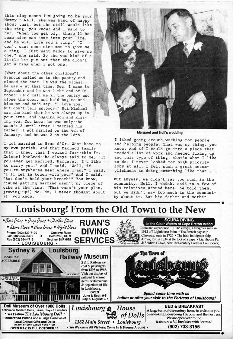 Published by Ronald Caplan on 1992/6/1 (133 reads)this ring means I'm going to be your Mommy." Well, she was kind of happy about that, but she still would like the ring, you know! And I said to her, "When you get big, there'll be some nice man come into your life, and he will give you a ring," "I don't want none nice man to give me a ring. I just want Daddy to give me one," she said. So she was kind of a little bit put out that she didn't get a ring when I got one. (What about the other children?) Francis called me in the pantry and closed the door. He was the oldest-- he was 4 at that time. See, I came in September and he was 4 the end of Oc? tober, He'd call me in the pantry and close the door, and he'd hug me and kiss me and he'd say, "I love you, but don't tell anybody," But Michael was the kind that he was always up in your arms, and hugging you and kiss? ing you. You know, he was only--he wasn't 2 until after I married his father, I got married on the 4th of January, and he was 2 on the 18th, I got married in Bras d'Or. Went home to my own parish. And that MacLeod family that I knew, that I worked for--this Fr, Colonel MacLeod--he always said to me, "If you ever get married, Margaret, I'd like to marry you," And I said, "Well, if you're anywheres near where I am," I said, "I'll get in touch with you." And I said, "But don't hold your breath!" You know, 'cause getting married wasn't my piece of cake at the time. (That wasn't your plan, growing up?) No, No, I never thought about it, you know. Margaret and Neil's wedding I liked going around working for people and helping people. That was my thing, you know. And if I could go into a place that needed a lot of work and needed fixing up and this type of thing, that's what I like to do, I never looked for high-priority jobs at all, I felt such a great accom? plishment in doing something like that.... But anyway, we didn't say too much in the community. Neil, I think, said to a few of his relatives around here--he told them, but we didn't say too much in the communi? ty about it. But his father and mother Louisbourg! From the Old Town to the New Phone (902) 539-7100 wee RUAN'S DIVING Gustavo Ruan Fax (90i2) 842-0492 • Box 6266, RR3 _'_, ,,,?,',-' Res (902) 564-4715 Sydney Bl P 6G5 Q P D /10 P Q .LOUISBOURG > ocriviuco SCUBA DIVING in the Clear Waters of Cape Breton Island , Come and experience.... • Tne Evelyn, a freighter sunk in 1912 off Lighthouse Point • The French pay ship Chameau, sunk in 1725 • The Irish immigrant ship Astrea, lost in 1834 at the foot of a cape • Lighthouse Pt. '' & Soldier's Cove, near 18th-century Fortress Louisbourg Sydney &'. Louisburg IHIIIlfflliriHIIIH'''''''' Railway Museum 5 & L Railway ran coal & passengers from 1895 to 1968. BOKO Visit our display of railroad & marine items, watercolours, 6 depictions of life in Louisbourg. OPEN June & Sept: 9-5 July & August: 9-7 'tl'ToMnirf Spend some time with us before or after your visit to the Fortress of Louisbourg! Doll Museum of Over 1900 Dolls Antique to Modern Dolls, Bears, Toys & Furniture * Via FeatuTB The Louisbourg Doll * Handcrafted Puffins and a Large Selection of Local Crafted Gifts and Dolls MAJOR CREDIT CARDS ACCEPTED OPEN MAY 15 TILL OCTOBER 15 Louisbourgj 1382 Main Street : House of Dolls Louisbourg BED & BREAKFAST A large tum-of-the-centuiy home to welcome you, overlooking Louisbourg Harbour and the Fortress. We are open year round & feature a full breakfast with "extras." We Welcome All Visitors: Come In & Browse Around • (902)733-3155