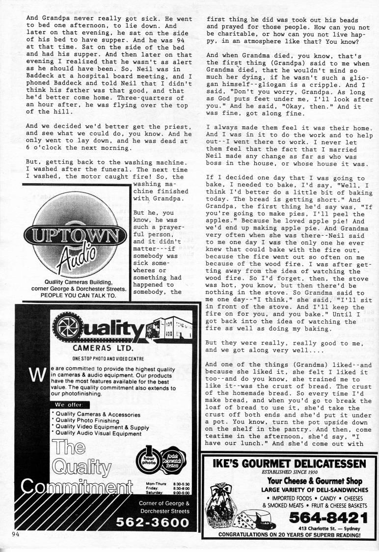 Published by Ronald Caplan on 1992/6/1 (145 reads)And Grandpa never really got sick. He went to bed one afternoon, to lie down. And later on that evening, he sat on the side of his bed to have supper. And he was 94 at that time. Sat on the side of the bed and had his supper. And then later on that evening I realized that he wasn't as alert as he should have been. So, Neil was in Baddeck at a hospital board meeting, and I phoned Baddeck and told Neil that I didn't think his father was that good, and that he'd better come home. Three-quarters of an hour after, he was flying over the top of the hill. And we decided we'd better get the priest, and see what we could do, you know. And he only went to lay down, and he was dead at 6 o'clock the next morning. But, getting back to the washing machine. I washed after the funeral. The next time I washed, the motor caught fire! So, the washing ma? chine finished with, Grandpa, But he, you know, he was such a prayer? ful person, and it didn't matter if somebody was sick some? wheres or something had Quality Cameras Building, happened to corner George & Dorchester Streets, gomebodv the PEOPLE YOU CAN TALK TO. ''Oiiieuouy , first thing he did was took out his beads and prayed for those people. How can you not be charitable, or how can you not live hap? py, in an atmosphere like that? You know? And when Grandma died, you know, that's the firsj: thing (Grandpa) said to me when Grandma''died, that he wouldn't mind so much her dying, if he wasn't such a glio- gan himself--gliogan is a cripple. And I said, "Don't you worry. Grandpa, As long as God puts feet under me, I'll look after you," And he said, "Okay, then," And it was fine, got along fine, I always made them feel it was their home. And I was in it to do the work and to help out--I went there to work, I never let them feel that the fact that I married Neil made any change as far as who was boss in the house, or whose house it was. If I decided one day that I was going to bake, I needed to bake, I'd say, "Well, I think I'd better do a little bit of baking today. The bread is getting short." And Grandpa, the first thing he'd say was, "If you're going to make pies, I'll peel the apples." Because he loved apple pie! And we'd end up making apple pie. And Grandma very often when she was there--Neil said to me one day I was the only one he ever knew that could bake with the fire out, because the fire went out so often on me because of the wood fire, I was after get? ting away from the idea of watching the wood fire. So I'd forget, then, the stove was hot, you know, but then there'd be nothing in the stove. So Grandma said to me one day--"I think," she said, "I'll sit in front of the stove. And I'll keep the fire on for you, and you bake," Until I got back into the idea of watching the fire as well as doing my baking. But they were really, really good to me, and we got along very well..., And one of the things (Grandma) liked--and because she liked it, she felt I liked it too--and do you know, she trained me to like it--was the crust of bread. The crust of the homemade bread. So every time I'd make bread, and when you'd go to break the loaf of bread to use it, she'd take the crust off both ends and she'd put it under a pot. You know, turn the pot upside down on the shelf in the pantry. And then, come teatime in the afternoon, she'd say, "I have our lunch," And she'd come out with IKE'S GOURMET DELICATESSEN ESTABUSHED SINCE WO Your Cheese & Gourmet Shop LARGE VARIETY OF DELI-SANDWICHES • IMPORTED FOODS • CANDY • CHEESES & SMOKED MEATS • FRUIT & CHEESE BASKETS 564-8421 413 Chaiiotte St. • Sydney CONGRATULATIONS ON 20 YEARS OF SUPERB READING!