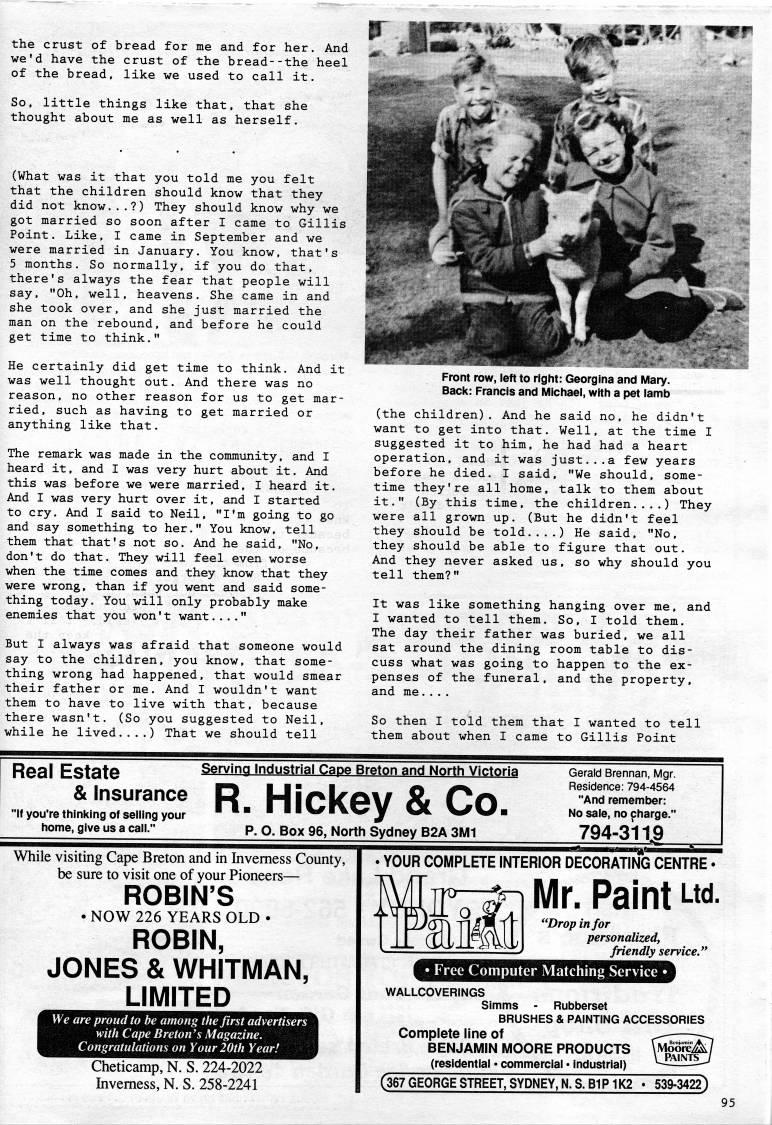 Published by Ronald Caplan on 1992/6/1 (122 reads)the crust of bread for me and for her. And we'd have the crust of the bread--the heel of the bread, like we used to call it. So, little things like that, that she thought about me as well as herself. (What was it that you told me you felt that the children should know that they did not know,,,?) They should know why we got married so soon after I came to Gillis Point. Like, I came in September and we were married in January, You know, that's 5 months. So normally, if you do that, there's always the fear that people will say, "Oh, well, heavens. She came in and she took over, and she just married the man on the rebound, and before he could get time to think." He certainly did get time to think. And it was well thought out. And there was no reason, no other reason for us to get mar? ried, such as having to get married or anything like that. The remark was made in the community, and I heard it, and I was very hurt about it. And this was before we were married, I heard it. And I was very hurt over it, and I started to cry. And I said to Neil, "I'm going to go and say something to her." You know, tell them that that's not so. And he said, "No, don't do that. They will feel even worse when the time comes and they know that they were wrong, than if you went and said some? thing today. You will only probably make enemies that you won't want,..." But I always was afraid that someone would say to the children, you know, that some? thing wrong had happened, that would smear their father or me. And I wouldn't want them to have to live with that, because there wasn't. (So you suggested to Neil, while he lived....) That we should tell W/ "?'F' Front row, left to right: Georgina and IVIary. Back: Francis and IMichael, with a pet lamb (the children). And he said no, he didn't want to get into that. Well, at the time I suggested it to him, he had had a heart operation, and it was just...a few years before he died. I said, "We should, some? time they're all home, talk to them about it." (By this time, the children..,.) They were all grown up. (But he didn't feel they should be told..,,) He said, "No, they should be able to figure that out. And they never asked us, so why should you tell them?" It was like something hanging over me, and I wanted to tell them. So, I told them. The day their father was buried, we all sat around the dining room table to dis? cuss what was going to happen to the ex? penses of the funeral, and the property, and me.... So then I told them that I wanted to tell them about when I came to Gillis Point Real Estate & Insurance "If you're thinking of selling your home, give us a call." Serving Industrial Cape Breton and North Victoria R. Hickey & Co. p. O. Box 96. North Sydney B2A 3M1 While visiting Cape Breton and in Inverness County, be sure to visit one of your Pioneers • ROBIN'S • NOW 226 YEARS OLD • ROBIN, JONES & WHITMAN, LIIVIITED We are proud to be among the first advertisers with Cape Breton's Magazine. Congratulations on Your 20th Year! Cheticamp, N. S, 224-2022 Inverness, N. S. 258-2241 Gerald Brennan, Mgr. Residence: 794-4564 "And rememt>er: No sale, no charge." 794-311.9 YOUR COMPLETE INTERIOR DECORATING CENTRE • [jTT'' Mr. Paint Ltd. "Drop in for personalized, friendly service." ' Free Computer Matching Service < WALLCOVERINGS Simms - Rubberset BRUSHES & PAINTING ACCESSORIES Complete line of ' • - • ' BENJAMIN MOORE PRODUCTS Mo(i"reA/ (residential • commercial • industrial) L'jj'g' (367 GEORGE STREET. SYDNEY, N.S.B1P1K2 ?? 539-342"2) 95