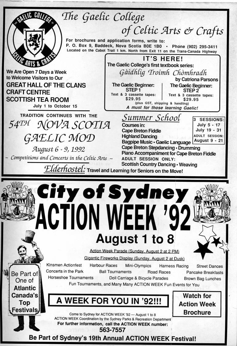 Published by Ronald Caplan on 1992/6/1 (153 reads)'fie QaeCic Cotttgt of Cdtic lAris & Crafts For brochures and application forms, write to: P. O. Box 9. Baddeck, Nova Scotia BOE 1B0 • Phone (902) 295-3411 Located on the Cabot Trail 1 km. North from Exit 11 on the Trans-Canada Highway We Are Open 7 Days a Week to Welcome Visitors to Our GREAT HALL OF THE CLANS CRAFT CENTRE SCOTTISH TEA ROOM July 1 to October 15 TRADITION CONTINUES WITH THE S4'H <){pVlA. scorns QIAILLIC MO(D Slugust 6 ?? 9,1992 ~ Competitions and Concerts in the CeCtic Arts ~ IT'S HERE! The Gaelic College's first textbook series: Qaidhiig nsoimfi Cfiomfiradfi by Catriona Parsons The Gaelic Beginner: STEP1 Text & 3 cassette tapes: $29.95 The Gaelic Beginner: STEP 2 Text & 3 cassette tapes: $29.95 (plus GST, shipping & handling) A must for those learning Gaelic! Summer Scdool Courses in: Cape Breton Fiddle Highland Dancing Bagpipe Music • Gaelic Language 3 SESSIONS: July 5-17 July 19 - 31 ADULT SESSION: August 9 - 21 Cape Breton Stepdancing • Drumming Piano Accompaniment for Cape Breton Fiddle ADULT SESSION ONLY: Scottish Country Dancing • Weaving LAdZTiiOStZll Travei and Learning for Seniors on the Move! City of Sydney ACTION WEEK '92 August 1 to 8 Be Part of One of Atlantic Canada's Top • iFestlvals'i Action Week Parade (Sunday. August 2 at 2 PM) Qigantic Firework? Display (gunday. August 2 at Dusk) Kinsmen Actionfest Harbour Races Mini-Olympics Harness Racing Street Dances Concerts in the Park Ball Tournaments Road Races Pancake Breakfasts Horseshoe Tournaments Doll Carriage & Bicycle Parades Brown Bag Lunches Fun Tournaments, and Many Many ACTION WEEK Fun Events for You |[ A WEEK FOR YOU IN'9211! Come to Sydney for ACTION WEEK '92 • August 1 to 8 ACTION WEEK Coordination by the Sydney Parks & Recreation Department For further information, call the ACTION WEEK number: 563-7557 Watch for Action Week Brochure Be Part of Sydney's 19th Annual ACTION WEEK Festival!