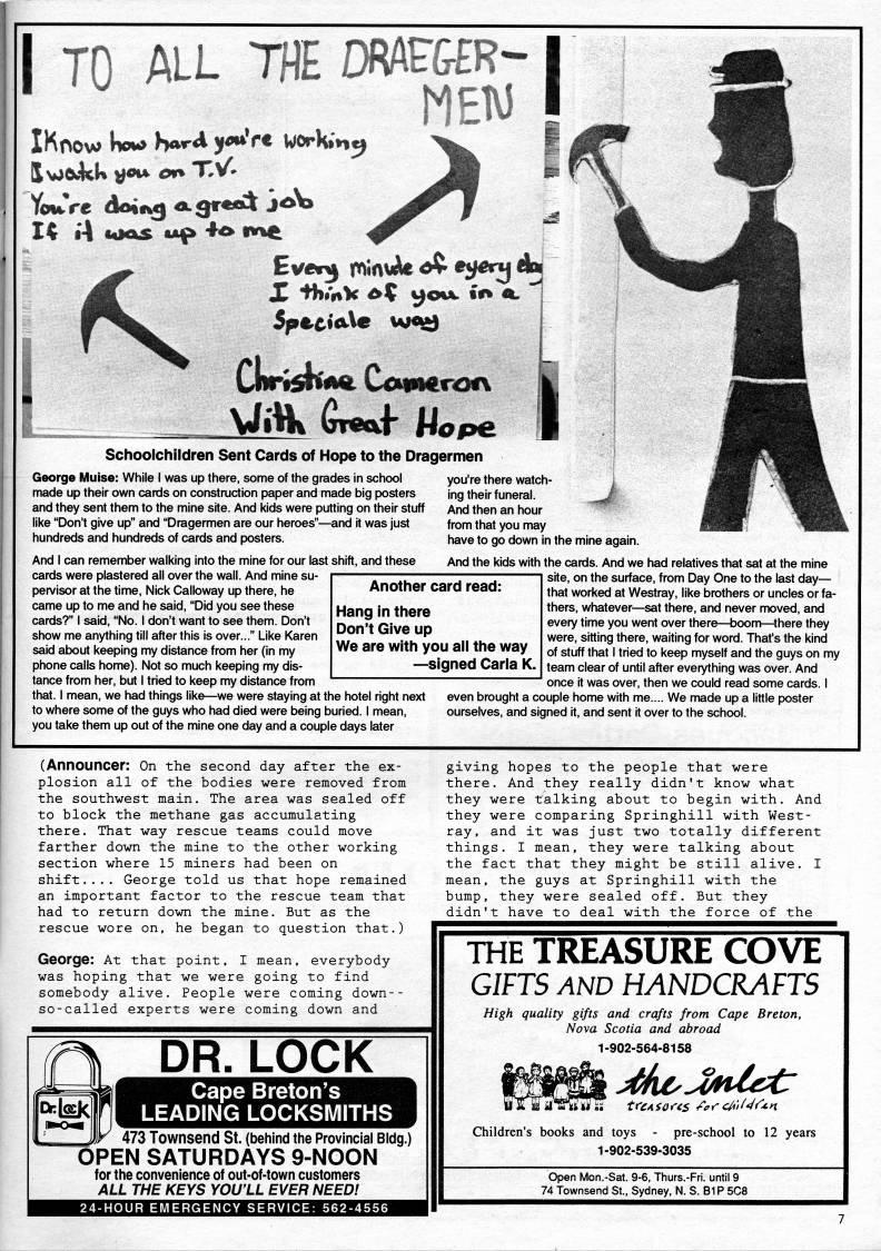 I in ALL T4E ORAr&??R- I It il mas ttf' *?> i*' Mill Gt'f Wiipe I Schoolchildren Sent Cards of Hope to the Dragermen George Muise: While I was up there, some of the grades in school made up their own cards on construction paper and made big posters and they sent them to the mine site. And kids were putting on their stuff like "Don't give up" and "Dragermen are our heroes" • and it was just hundreds and hundreds of cards and posters. And I can remember walking into the mine for our last shift, and these cards were plastered all over the wall. And mine su? pervisor at the time, Nick Calloway up there, he came up to me and he said, "Did you see these cards?" I said, "No. I don't want to see them. Don't show me anything till after this is over..." Like Karen said about keeping my distance from her (in my phone calls home). Not so much keeping my dis? tance from her, but I tried to keep my distance from that. I mean, we had things like • we were staying at the hotel right next to where some of the guys who had died were being buried. I mean, you take them up out of the mine one day and a couple days later Another card read: Hang In there Don't Give up We are with you all the way • signed Caria K. you're there watch? ing their funeral. And then an hour from that you may have to go down in the mine again. And the kids with the cards. And we had relatives that sat at the mine site, on the surface, from Day One to the last day • that worked at Westray, like brothers or uncles or fa? thers, whatever • sat there, and never moved, and every time you went over there • boom • there they were, sitting there, waiting for word. That's the kind of stuff that I tried to keep myself and the guys on my team clear of until after everything was over. And once it was over, then we could read some cards. I even brought a couple home with me.... We n'iade up a little poster ourselves, and signed it, and sent it over to the school. (Announcer: On the second day after the ex? plosion all of the bodies were removed from the southwest main. The area was sealed off to block the methane gas accumulating there. That way rescue teams could move farther down the mine to the other working section where 15 miners had been on shift.... George told us that hope remained an important factor to the rescue team that had to return down the mine. But as the rescue wore on, he began to question that.) George: At that point, I mean, everybody was hoping that we were going to find somebody alive. People were coming down-- so-called experts were coming down and giving hopes to the there. And they real they were talking ab' they were comparing ray, and it was just things. I mean, they the fact that they mean, the guys at Sp bump, they were seal didn't have to deal people that were ly didn't know what out to begin with. And Springhill with West- two totally different were talking about ight be still alive. I ringhill with the ed off. But they with the force of the DR. LOCK Cape Breton's LEADING LOCKSMITHS _ 473 Townsend St. (behind the Provincial Bidg.) OPEN SATURDAYS 9-NOON for the convenience of out-of-town customers ALL THE KEYS YOU'LL EVER NEED! 24-HOUR EMERGENCY SERVICE: 562-4556 THE TREASURE COVE GIFTS AND HANDCRAFTS High quality gifts and crafts from Cape Breton, Nova Scotia and abroad 1-902-564-8158 Children's books and toys - pre-school to 12 years 1-902-539-3035 Open Mon.-Sat. 9-6, Thurs.-Fri. until 9 74 Townsend St., Sydney, N. S. B1P 5C8