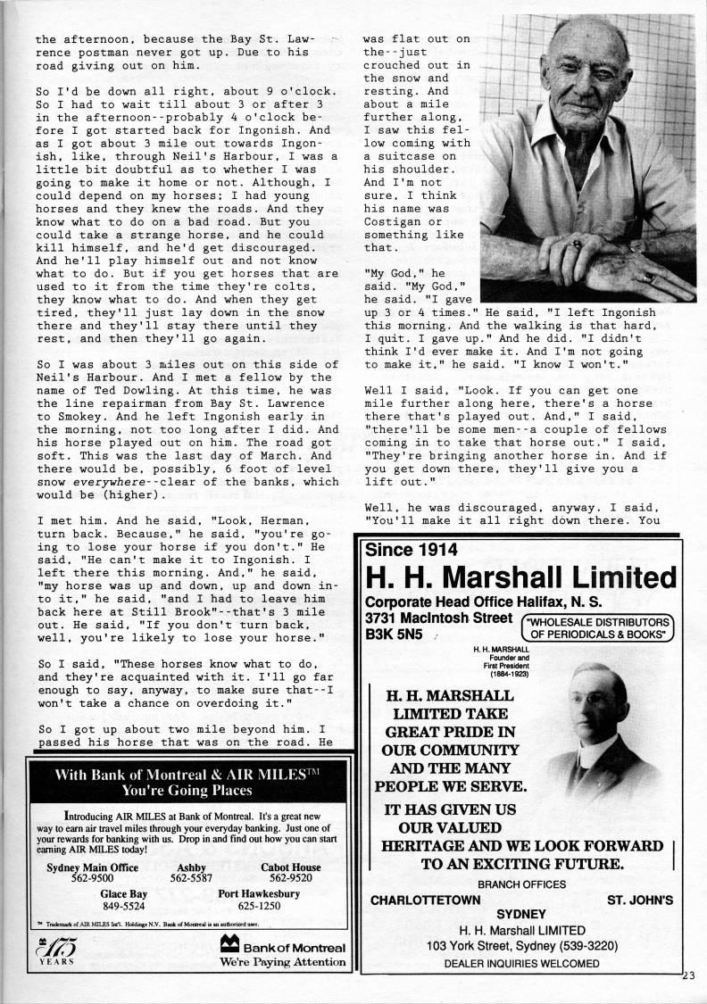 Published by Ronald Caplan on 1993/1/1 (266 reads)the afternoon, because the Bay St. Law? rence postman never got up. Due to his road giving out on him. So I'd be down all right, about 9 o'clock. So I had to wait till about 3 or after 3 in the afternoon--probably 4 o'clock be? fore I got started back for Ingonish. And as I got about 3 mile out towards Ingon? ish, like, through Neil's Harbour, I was a little bit doubtful as to whether I was going to make it home or not. Although, I could depend on my horses; I had young horses and they knew the roads. And they know what to do on a bad road. But you could take a strange horse, and he could kill himself, and he'd get discouraged. And he'll play himself out and not know what to do. But if you get horses that are used to it from the time they're colts, they know what to do. And when they get tired, they'll just lay down in the snow there and they'll stay there until they rest, and then they'll go again. So I was about 3 miles out on this side of Neil's Harbour. And I met a fellow by the name of Ted Dowling. At this time, he was the line repairman from Bay St. Lawrence to Smokey. And he left Ingonish early in the morning, not too long after I did. And his horse played out on him. The road got soft. This was the last day of March. And there would be, possibly, 6 foot of level snow everywhere--clear of the banks, which would be (higher). I met him. And he said, "Look, Herman, turn back. Because," he said, "you're go? ing to lose your horse if you don't." He said, "He can't make it to Ingonish. I left there this morning. And," he said, "my horse was up and down, up and down in? to it," he said, "and I had to leave him back here at Still Brook"--that's 3 mile out. He said, "If you don't turn back, well, you're likely to lose your horse." So I said, "These horses know what to do, and they're acquainted with it. I'll go far enough to say, anyway, to make sure that--I won't take a chance on overdoing it." So I got up about two mile beyond him. I passed his horse that was on the road. He With Bank of Montreal & AIR MILES • You're Going Places Introducing AIR MILES at Bank of Montreal. It's a great new way to earn air travel miles through your everyday banking. Just one of your rewards for banking with us. Drop in and find out how you can start earning AIR MILES today! Sydney Main Office 562-9500 Glace Bay 849-5524 Ashby 562-5587 Cabot House 562-9520 Port Hawkesbury 625-1250 Ik of AIR MILES Im'l. Holdings N.V. Bank of Montreal is an YEARS EZi Bank of Montreal We're Paying Attention was flat out on the--just crouched out in the snow and resting. And about a mile further along, I saw this fel? low coming with a suitcase on his shoulder. And I'm not sure, I think his name was Costigan or something like that. "My God." he said. "My God," he said. "I gave up 3 or 4 times." He said, "I left Ingonish this morning. And the walking is that hard, I quit. I gave up." And he did. "I didn't think I'd ever make it. And I'm not going to make it," he said. "I know I won't." Well I said, "Look. If you can get one mile further along here, there's a horse there that's played out. And," I said, "there'll be some men--a couple of fellows coming in to take that horse out." I said, "They're bringing another horse in. And if you get down there, they'll give you a lift out." Well, he was discouraged, anyway. I said, "You'll make it all right down there. You Since 1914 H. H. Marshall Limited Corporate Head Office Halifax, N. S. 3731 Macintosh Street B3K 5N5 WHOLESALE DISTRIBUTORS] OF PERIODICALS & BOOKS" J H. H. MARSHALL Founder and First President (1884-1923) H. H. MARSHALL LIMITED TAKE GREAT PRIDE IN OUR COMMUNITY AND THE MANY PEOPLE WE SERVE. IT HAS GIVEN US OUR VALUED HERITAGE AND WE LOOK FORWARD TO AN EXCITING FUTURE. BRANCH OFFICES CHARLOTTETOWN ST. JOHN'S SYDNEY H. H. Marshall LIMITED 103 York Street, Sydney (539-3220) DEALER INQUIRIES WELCOMED
