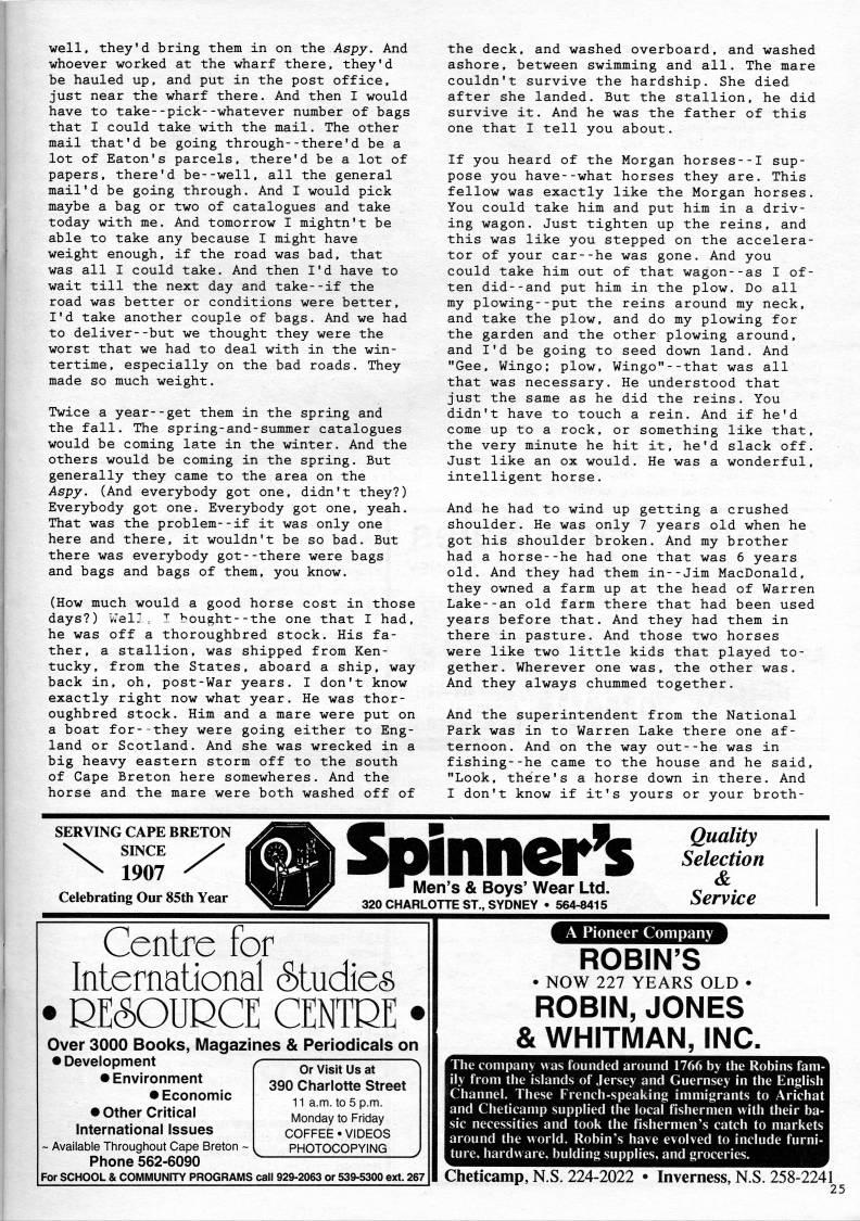 Published by Ronald Caplan on 1993/1/1 (214 reads)well, they'd bring them in on the Aspy. And whoever worked at the wharf there, they'd be hauled up, and put in the post office, just near the wharf there. And then I would have to take--pick--whatever number of bags that I could take with the mail. The other mail that'd be going through--there'd be a lot of Eaton's parcels, there'd be a lot of papers, there'd be--well, all the general mail'd be going through. And I would pick maybe a bag or two of catalogues and take today with me. And tomorrow I mightn't be able to take any because I might have weight enough, if the road was bad, that was all I could take. And then I'd have to wait till the next day and take--if the road was better or conditions were better, I'd take another couple of bags. And we had to deliver--but we thought they were the worst that we had to deal with in the win? tertime, especially on the bad roads. They made so much weight. Twice a year--get them in the spring and the fall. The spring-and-summer catalogues would be coming late in the winter. And the others would be coming in the spring. But generally they came to the area on the Aspy. (And everybody got one, didn't they?) Everybody got one. Everybody got one, yeah. That was the problem--if it was only one here and there, it wouldn't be so bad. But there was everybody got--there were bags and bags and bags of them, you know. (How much would a good horse cost in those days?) well, T 'bought--the one that I had, he was off a thoroughbred stock. His fa? ther, a stallion, was shipped from Ken? tucky, from the States, aboard a ship, way back in, oh, post-War years. I don't know exactly right now what year. He was thor? oughbred stock. Him and a mare were put on a boat for- they were going either to Eng? land or Scotland. And she was wrecked in a big heavy eastern storm off to the south of Cape Breton here somewheres. And the horse and the mare were both washed off of the deck, and washed overboard, and washed ashore, between swimming and all. The mare couldn't survive the hardship. She died after she landed. But the stallion, he did survive it. And he was the father of this one that I tell you about. If you heard of the Morgan horses--I sup? pose you have--what horses they are. This fellow was exactly like the Morgan horses. You could take him and put him in a driv? ing wagon. Just tighten up the reins, and this was like you stepped on the accelera? tor of your car--he was gone. And you could take him out of that wagon--as I of? ten did--and put him in the plow. Do all my plowing--put the reins around my neck, and take the plow, and do my plowing for the garden and the other plowing around, and I'd be going to seed down land. And "Gee, Wingo; plow, Wingo"--that was all that was necessary. He understood that just the same as he did the reins. You didn't have to touch a rein. And if he'd come up to a rock, or something like that, the very minute he hit it, he'd slack off. Just like an ox would. He was a wonderful, intelligent horse. And he had to wind up getting a crushed shoulder. He was only 7 years old when he got his shoulder broken. And my brother had a horse--he had one that was 6 years old. And they had them in--Jim MacDonald, they owned a farm up at the head of Warren Lake--an old farm there that had been used years before that. And they had them in there in pasture. And those two horses were like two little kids that played to? gether. Wherever one was, the other was. And they always chummed together. And the superintendent from the National Park was in to Warren Lake there one af? ternoon. And on the way out--he was in fishing--he came to the house and he said, "Look, there's a horse down in there. And I don't know if it's yours or your broth- SERVING CAPE BRETON SINCE 1907 Celebrating Our 85th Year Spinner's ?? Men's & Boys' Wear Ltd. 320 CHARLOTTE ST., SYDNEY • 564-8415 Quality Selection & Service Centre for International (Studies • DE60UDCE CENTQE • Over 3000 Books, Magazines & Periodicals on • Development • Environment • Economic • Other Critical International Issues ~ Available Throughout Cape Breton Phone 562-6090 Or Visit Us at 390 Charlotte Street 11 a.m. to 5 p.m. Monday to Friday COFFEE-VIDEOS PHOTOCOPYING For SCHOOL & COMMUNITY PROGRAMS call 929-2063 or 539-5300 ext. 267 A Pioneer Company ROBIN'S • NOW 227 YEARS OLD • ROBIN, JONES & WHITMAN, INC. The company was founded around 1766 by the Robins fam? ily from the islands of Jersey and Guernsey in the English Channel. These French-speaking immigrants to Arichat and Cheticamp supplied the local fishermen with their ba? sic necessities and took the fishermen's catch to markets around the world. Robin's have evolved to include furni? ture, hardware, bulding supplies, and groceries. Cheticamp, N.S. 224-2022 • Inverness, N.S. 258-2241