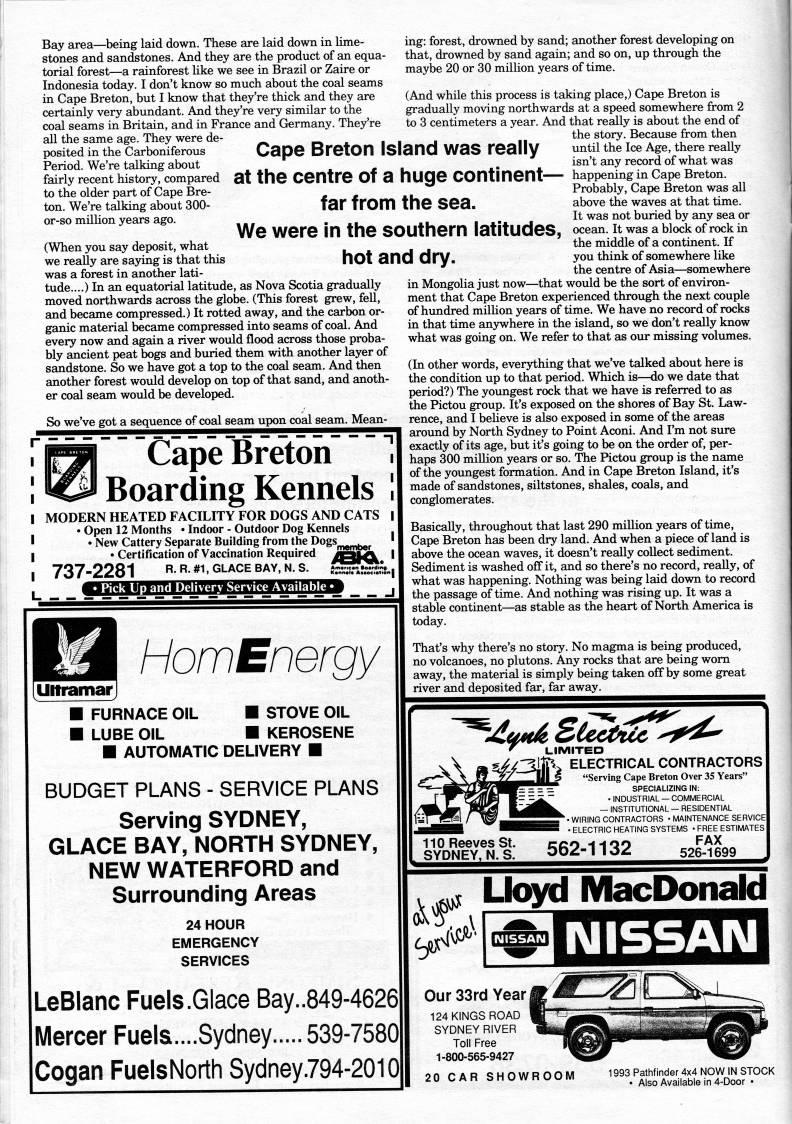 Published by Ronald Caplan on 1993/1/1 (232 reads)Bay area • 'being laid down. These are laid down in lime? stones and sandstones. And they are the product of an equa? torial forest • a rainforest like we see in Brazil or Zaire or Indonesia today. I don't know so much about the coal seams in Cape Breton, but I know that they're thick and they are certainly very abundant. And they're very similar to the coal seams in Britain, and in France and Germany. They're all the same age. They were de' posited in the Carboniferous Period. We're talking about fairly recent history, compared to the older part of Cape Bre? ton. We're talking about 300- or-so million years ago. ing: forest, drowned by sand; another forest developing on that, drowned by sand again; and so on, up through the maybe 20 or 30 million years of time. (When you say deposit, what we really are saying is that this was a forest in another lati? tude....) In an equatorial latitude, as Nova Scotia gradually moved northwards across the globe. (This forest grew, fell, and became compressed.) It rotted away, and the carbon or? ganic material became compressed into seams of coal. And every now and again a river would flood across those proba? bly ancient peat bogs and buried them with another layer of sandstone. So we have got a top to the coal seam. And then another forest would develop on top of that sand, and anoth? er coal seam would be developed. So we've got a sequence of coal seam upon coal seam. Mean- (And while this process is taking place,) Cape Breton is gradually moving northwards at a speed somewhere from 2 to 3 centimeters a year. And that really is about the end of the story. Because from then Cape Breton Island was really untn the ice Age, there reaiiy isn't any record of what was at the centre of a huge continent • happening in cape Breton Probably, Cape Breton was all far from the sea. We were in the southern latitudes, hot and dry. Cape Breton Boarding Kennels MODERN HEATED FACILITY FOR DOGS AND CATS • Open 12 Months • Indoor - Outdoor Dog Kennels • New Cattery Separate Building from the Dogs' • Certification of Vaccination Required 737-2281 R. R. #1, GLACE BAY, N.S. • Pick Up and Delivery Service Available • ' r HomEnergy ?? FURNACE OIL ?? STOVE OIL ?? LUBE OIL ?? KEROSENE ?? AUTOMATIC DELIVERY ?? BUDGET PLANS - SERVICE PLANS Serving SYDNEY, GLACE BAY, NORTH SYDNEY, NEW WATERFORD and Surrounding Areas 24 HOUR EMERGENCY SERVICES LeBlanc Fuels.Glace Bay..849-46261 Mercer Fuels....Sydney 539-7580 Cogan FuelsNorth Sydney .794-2010 above the waves at that time. It was not buried by any sea or ocean. It was a block of rock in the middle of a continent. If you think of somewhere like the centre of Asia • somewhere in Mongolia just now • that would be the sort of environ? ment that Cape Breton experienced through the next couple of hundred million years of time. We have no record of rocks in that time anywhere in the island, so we don't really know what was going on. We refer to that as our missing volumes. (In other words, everjrthing that we've talked about here is the condition up to that period. Which is • do we date that period?) The youngest rock that we have is referred to as the Pictou group. It's exposed on the shores of Bay St. Law? rence, and I believe is also exposed in some of the areas around by North Sydney to Point Aconi. And I'm not sure exactly of its age, but it's going to be on the order of, per? haps 300 million years or so. The Pictou group is the name of the youngest formation. And in Cape Breton Island, it's made of sandstones, siltstones, shales, coals, and conglomerates. Basically, throughout that last 290 million years of time, Cape Breton has been dry land. And when a piece of land is above the ocean waves, it doesn't really collect sediment. Sediment is washed off" it, and so there's no record, really, of what was happening. Nothing was being laid down to record the passage of time. And nothing was rising up. It was a stable continent • as stable as the heart of North America is today. That's why there's no story. No magma is being produced, no volcanoes, no plutons. Any rocks that are being worn away, the material is simply being taken off by some great river and deposited far, far away. ' LIIVIITEa ELECTRICAL CONTRACTORS "Serving Cape Breton Over 35 Years" SPECIALIZING IN: • INDUSTRIAL • COMMERCIAL • INSTITUTIONAL • RESIDENTIAL ?? WIRING CONTRACTORS • MAINTENANCE SERVICE] ?? ELECTRIC HEATING SYSTEMS • FREE ESTIMATES 110 Reeves St. SYDNEY, N. S. 562-1132 FAX 526-1699 ' ??M' Lloyd MacDonald ' NISSAN Our 33rd Year 124 KINGS ROAD SYDNEY RIVER Toll Free 1-800-565-9427 20 CAR SHOWROOM 1993 Pathfinder 4x4 NOW IN STOCK • Also Available in 4-Door •