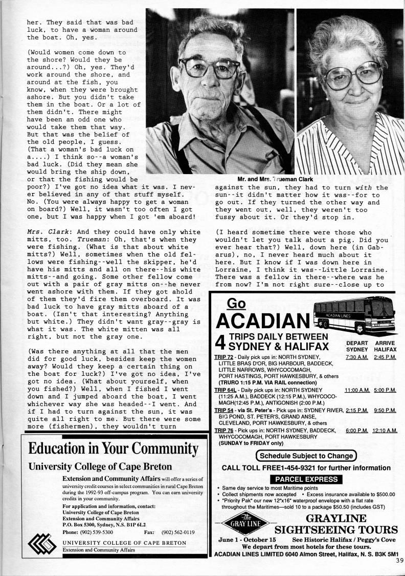 Published by Ronald Caplan on 1993/1/1 (259 reads)her. They said that was bad luck, to have a woman around the boat. Oh, yes. (Would women come down to the shore? Would they be around...?) Oh, yes. They'd work around the shore, and around at the fish, you know, when they were brought ashore. But you didn't take them in the boat. Or a lot of them didn't. There might have been an odd one who would take them that way. But that was the belief of the old people, I guess. (That a woman's bad luck on a....) I think so--a woman's bad luck. (Did they mean she would bring the ship down, or that the fishing would be poor?) I've got no idea what it was. I nev? er believed in any of that stuff myself. No. (You were always happy to get a woman on board?) Well, it wasn't too often I got one, but I was happy when I got 'em aboard! Mrs. Clark: And they could have only white mitts, too. Trueman: Oh, that's when they were fishing. (What is that about white mitts?) Well, sometimes when the old fel? lows were fishing--well the skipper, he'd have his mitts and all on there--his white mitts--and going. Some other fellow come out with a pair of gray mitts on--he never went ashore with them. If they got ahold of them they'd fire them overboard. It was bad luck to have gray mitts aboard of a boat. (Isn't that interesting? Anything but white.) They didn't want gray--gray is what it was. The white mitten was all right, but not the gray one. (Was there anything at all that the men did for good luck, besides keep the women away? Would they keep a certain thing on the boat for luck?) I've got no idea, I've got no idea. (What about yourself, when you fished?) Well, when I fished I went down and I jumped aboard the boat, I went whichever way she was headed--I went. And if I had to turn against the sun, it was quite all right to me. But there were some more (fishermen), they wouldn't turn Education in Your Community University College of Cape Breton Extension and Community Affairs win offer a series of university credit courses in select communities in rural Cape Breton during the 1992-93 off-campus program. You can earn university credits in your community. For application and information, contact: University College of Cape Breton Extension and Community Affairs P.O. Box 5300, Sydney, N.S. BIP 6L2 Phone:(902)539-5300 Fax: (902)562-0119 UNIVERSITY COLLEGE OF CAPE BRETON Extension and Community Affairs Mr. and Mr'. '?? ueman Clark against the sun, they had to turn with the sun--it didn't matter how it was--for to go out. If they turned the other way and they went out, well, they weren't too fussy about it. Or they'd stop in. (I heard sometime there were those who wouldn't let you talk about a pig. Did you ever hear that?) Well, down here (in Gab? arus), no, I never heard much about it here. But I know if I was down here in Lorraine, I think it was--Little Lorraine. There was a fellow in there--where was he from now? I'm not right sure--close up to DEPART ARRIVE SYDNEY HALIFAX 7:30 A.M. 2:45 P.M. ACADIAN 4 TRIPS DAILY BETWEEN SYDNEY & HALIFAX TRIP 72 - Daily pick ups in: NORTH SYDNEY. LITTLE BRAS D'OR. BIG HARBOUR, BADDECK. LITTLE NARROWS. WHYCOCOMAGH, PORT HASTINGS, PORT HAWKESBURY, & others (TRURO 1:15 P.M. VIA RAIL connection) IBIEML - Daily pick ups in: NORTH SYDNEY 11:00 A.M. 5:00 P.M. (11:25 A.M.), BADDECK (12:15 P.M.). WHYCOCO- MAGH(12:45 P.M.), ANTIGONISH (2:00 P.M.) TRIP 54 - via St. Peter's - Pick ups in: SYDNEY RIVER. 2:15 P.M. 9:50 P.M. BIG POND. ST. PETER'S. GRAND ANSE. CLEVELAND, PORT HAWKESBURY, & others TRIP 76 - Pick uos in: NORTH SYDNEY. BADDECK. 6:00 P.M. 12:10 A.M. WHYCOCOMAGH, PORT HAWKESBURY (SUNDAY to FRIDAY only) (schedule Subject to Change) CALL TOLL FREE1-454-9321 for further information '''''' • Same day service to most Maritime points ' Collect shipments now accepted • Excess insurance available to $500.00 ' "Priority Pak" our new 12''x16'' waterproof envelope with a flat rate throughout the Maritimes • sold 10 to a package $50.50 (includes GST) GRAYLINE SIGHTSEEING TOURS June 1 - October 15 See Historic Halifax / Peggy's Cove We depart from most hotels for these tours. ACADIAN LINES LIMITED 6040 Almon Street, Halifax, N. S. B3K 5M1