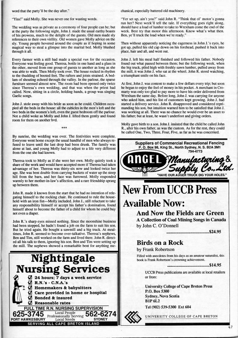 word that the party'll be the day after." "Yiss!" said Molly. She was never one for wasting words. The wedding was as private as a ceremony of four people can be; but at the party the following night, John J. made the usual earthy boasts of his prowess, much to the delight of the guests. Old men made sly references to their own virility. Old women gave Molly advice on the sly. Young people hovered around tiie couple as if hoping in some magical way to steal a glimpse into the marital bed. Molly blushed through it all. Every farmer with a still had made a special run for the occasion. Everyone was feeling good. Theresa, bottle in one hand and a glass in the other, moved from one group of guests to another as long as she was able to walk. Then Molly took over. The house rocked in rhythm to the thudding of booted feet. The rafters and joists sfrained. A bed? lam of shouting echoed through the valley. In the parlour, the sparse furniture seemed almost new. The room had been opened only twice since Theresa's own wedding, and that was when the priest had called. Now, sitting in a circle, holding hands, a group was singing Gaelic songs. John J. stole away with his bride as soon as he could. Children occu? pied all the beds in the house: all the cubicles in the men's loft and the two beds in the women's loft, even the guest bedroom off the parlour. Not a child woke as Molly and John J. lifted tiiem gentiy and found room for them on another bed. By sunrise, the wedding was over. The festivities were complete. Everyone went home except the usual handftil of men who always re- ftised to leave until the last drop had been drunk. The family was alone at last, and young Molly had to adjust to a Ufe very different from the one she had known. Theresa took to Molly as if she were her own. Molly quietiy took a share of the work and would have accepted more if Theresa had taken advantage of her. Theresa was thirty-six now and looked twice her age. She was bent double from carrying buckets of water up the steep hill from the barn, and her face was furrowed. Molly responded warmly to her mother-in-law's affection, and a rare friendship sprang up between them. John R. made it known from the start that he had no intention of rele? gating himself to the rocking chair. He continued to rule the house? hold with an iron fist • Molly included. John J., still reluctant to take any responsibility himself or accept his father's domination, found himself about to become the father of a child for whom he could buy not even a diaper. John R.'s sharp eyes missed nothing. Since the moonshine business had been stopped, he hadn't found a job on the farm to suit his son. But he tried again. He bought a sawmill and a big truck. At meal? times, John R. seemed to become over-talkative. Theresa's nephews, Ben and Tim, still worked on the farm and lived there. John R. direct? ed all his talk to them, ignoring his son. Ben and Tim were setting up the mill. The nephews showed a remarkable bent for anything me? chanical, especially battered old machinery. "Yer set up, ain't you?" said John R. "Think that ol' motor's gonna run her? Next week'11 tell the tale. If everything goes right along, should have a load of lumber to take to Wrexham come the end of the week. Best try that motor this afternoon. Know what's what then. Ben, ye'U truck the load when we're ready." Then without apparentiy noticing the eagerness in John J.'s eyes, he got up, pulled his old cap down on his forehead, pushed it back into place, hair and all, and went out. John J. left his meal half finished and followed his father. Nobody found out what passed between them; but the following week, when the big truck, piled high with freshly sawn lumber, pulled away from the mill, it was John J. who sat at the wheel. John R. stood watching, a triumphant smile on his face. At first, John J. was content to make a few dollars every trip; but soon he began to enjoy the feel of money in his pocket. A merchant in Cro? marty was only too glad to pay more to have his order delivered from Wrexham the same day. Before long, John J. was carrying for anyone who asked him, and his list of customers kept growing. John J. had started a delivery service. John R. disapproved and considered repri? manding his son, but intuition warned him to be satisfied that John J. was working at all. There was no chance he would ever be an asset to his father; but at least, he wasn't underfoot and giving orders. Molly gave birth to a son. John J. insisted that the child be called John R., after his own father, as was the custom. As for the rest, they could be called One, Two, Three, Four, Five, as far as he was concerned. Nightingale Nursing Services {Z 24 hours; 7 days a week service Q R.N.'s - C.N.A.'s {21 Homemakers & babysitters {21 Care provided in home or hospital {21 Bonded & insured {21 Reasonable rates FULLTIME R.N. NURSING SUPERVISION OZt>~0 f HO Professionally Serving t>DZ-DZ #4 PORT HAWKESBURY Local Needs SYDNEY SERVING ALL CAPE BRETON ISLAND Suppliers of Commercial Recreational Fencing p. O. Box 98, King St., North Sydney, N. S. B2A 3M1 794-4773 • HAVE OUR AUGER TRUCK DIG YOUR HOLES." New From UCCB Press Available Now: And Now the Fields are Green A Collection of Coal Mining Songs in Canada by John C. O'Donnell $24.95 Birds on a Rock by Frank Robertson Filled with anecdotes from his days as an amateur naturahst, this book is Frank Robertson's crowning achievement. $14.95 UCCB Press publications are available at local retailers or from: University College of Cape Breton Press P.O. Box 5300 Sydney, Nova Scotia BIP 6L2 Tel (902) 539-5300 Ext 604 UNIVERSITY COLLEGE OF CAPE BRETON