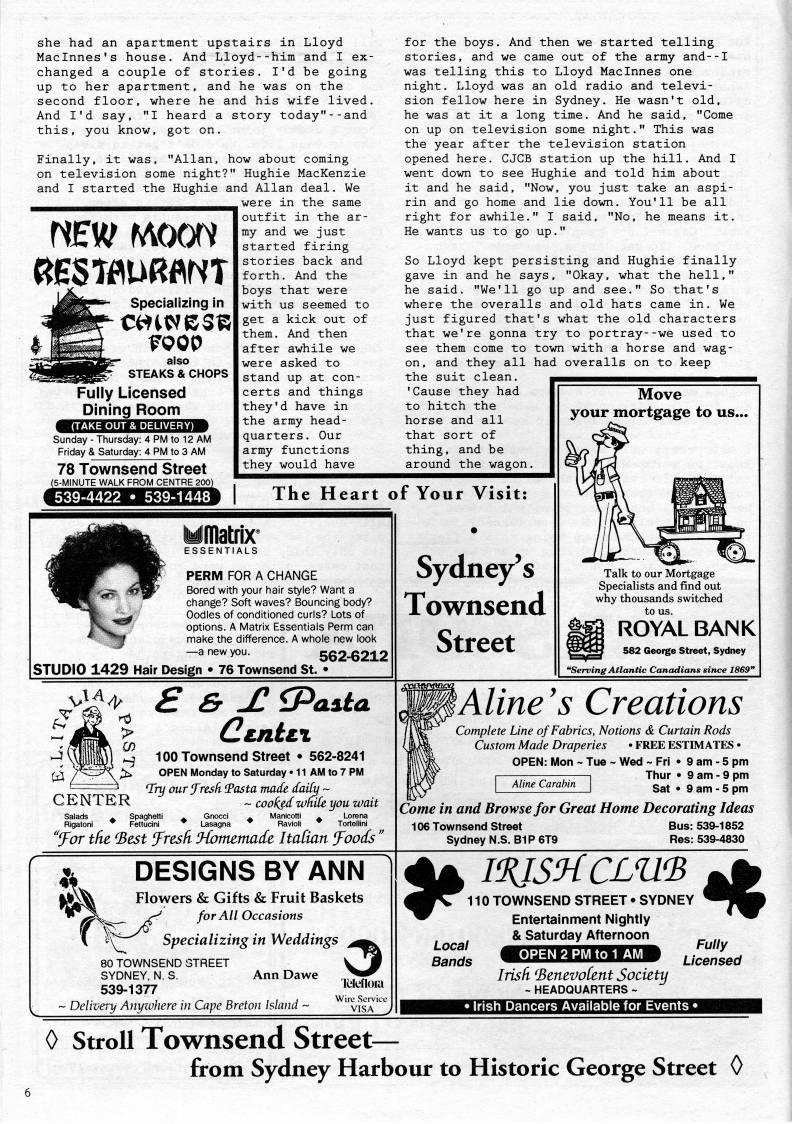 she had an apartment upstairs in Lloyd Maclnnes's house. And Lloyd--him and I ex? changed a couple of stories. I'd be going up to her apartment, and he was on the second floor, where he and his wife lived. And I'd say, "I heard a story today"--and this, you know, got on. Finally, it was, "Allan, how about coming on television some night?" Hughie MacKenzie and I started the Hughie and Allan deal. We _were in the same outfit in the ar? my and we just started firing stories back and forth. And the boys that were with us seemed to get a kick out of them. And then after awhile we were asked to stand up at con? certs and things they'd have in the army head? quarters. Our army functions they would have mw fAom Specializing in also STEAKS & CHOPS Fully Licensed Dining Room mmsssaassmsnm Sunday - Thursday: 4 PM to 12 AM Friday & Saturday: 4 PM to 3 AM for the boys. And then we started telling stories, and we came out of the army and--I was telling this to Lloyd Maclnnes one night. Lloyd was an old radio and televi? sion fellow here in Sydney. He wasn't old, he was at it a long time. And he said, "Come on up on television some night." This was the year after the television station opened here. CJCB station up the hill. And I went down to see Hughie and told him about it and he said, "Now, you just take an aspi? rin and go home and lie down. You'll be all right for awhile." I said, "No, he means it. He wants us to go up." So Lloyd kept persisting and Hughie finally gave in and he says, "Okay, what the hell," he said. "We'll go up and see." So that's where the overalls and old hats came in. We just figured that's what the old characters that we're gonna try to portray--we used to see them come to town with a horse and wag? on, and they all had overalls on to keep the suit clean. 'Cause they had to hitch the horse and all that sort of thing, and be around the wagon. The Heart of Your Visit: ymatrix' ESSENTIALS PERM FOR A CHANGE Bored with your hair style? Want a change? Soft waves? Bouncing body? Oodles of conditioned curls? Lots of options. A Matrix Essentials Perm can nnake the difference. A whole new look -a new you. 562-6212 STUDIO 1429 Hair Design * 76 Townsend St. * Sydney's Townsend Street Move your mortgage to us.. Talk to our Mortgage Specialists and find out why thousands switched to us. ROYAL BANK 582 George Street, Sydney "Serving Atlantic Canadians since 1869" ?? & X