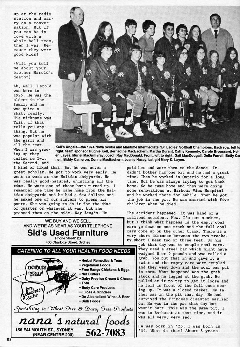 up at the radio station and car? ry on a conver? sation. But if you can be in love with a whole ball team, then I was. Be? cause they were good kids! (Will you tell me about your brother Harold's death?) Ah, well. Harold was born in 1926. He was the oldest in the family and he was quite a skit, really. His nickname was Twit, if that tells you any? thing. But he was popular with the girls and all the rest. When I was grow? ing up they called me Twit the Second, and I kind of liked that. But he was never a great scholar. He got to work very early. He went to work at the Halifax shipyards. He was really good-natured, whistling all the time. He wore one of those hats turned up. I remember one time he came home from the Hal? ifax shipyards and he had a few dollars and he asked one of our sisters to press his pants. She was going to do it for the dime or quarter or whatever it was, but she pressed them on the side. Ray laughs. He Kell's Angels • the 1974 Nova Scotia and Maritime Intermediate "B" Ladies' Softball Champions. Bacl( row, left to right: team sponsor Hughie Kelt, Bernadine MacEachern, Martha Durant, Cathy Kennedy, Carole Broussard, Hel? en Layes, Muriel MacGillivray, coach Ray MacDonald. Front, left to right: Gail MacDougall, Delia Farrell, Betty Car neli, Biddy Cameron, Donna MacEachern, Joanle Hasey, bat girl Mary K. Layes. paid her and wore them to the dance. It didn't bother him one bit and he had a great time. Then he worked in Ontario for a long time. But he was always trying to get back home. So he came home and they were doing some renovations at Harbour View Hospital and he worked there for awhile. Then he got the job in the pit. He was married with five children when he died. WE BUY AND WE SELL AND WE'RE AS NEAR AS YOUR TELEPHONE Sid's Used Furniture Phone 564-6123 436 Charlotte Street, Sydney CATERING TO ALL YOUR HEALTH FOOD NEEDS • Herbal Remedies & Teas • Vegetarian Foods • Free Range Chiclcens & Eggs • Nut Butters • Dairy Free Ice Cream & Cheese • Tofu • Body Care Products • Juices & Grinders • De-Alcoholized Wines & Beer • Bulk Foods ??.ciaG'in' in ''zat 'DxtL & U'aixtf 'xll Uoducis. nanCL l naturat foodi 156 FALMOUTH ST., SYDNEY C/'' HfiQI. (NEAR CENTRE 200) 30Zr" / 300 The accident happened--it was kind of a railroad accident. Now, I'm not a miner, but I think what happens is the empty coal cars go down on one track and the full coal cars come up on the other track. There is a very short distance between the two tracks. By short I mean two or three feet. So his job that day was to couple coal cars. They used a steel bar which might have weighed 8 or 9 pounds and was called a grab. You put that in and gave it a twist and the empty cars were coupled and they went down and the coal was put in them. What happened was the grab stuck and he tugged at the grab. He pulled at it to try to get it loose and he fell in front of the full ones com? ing up. It was a closed casket. My fa? ther was in the pit that day. He had survived the Princess disaster earlier on. He was in the pit that day but wasn't hurt. This was the same pit. I was in Bathurst at that time, and it was all very, very sad. He was born in '26; '34. What is that? I was born in About 8 years.