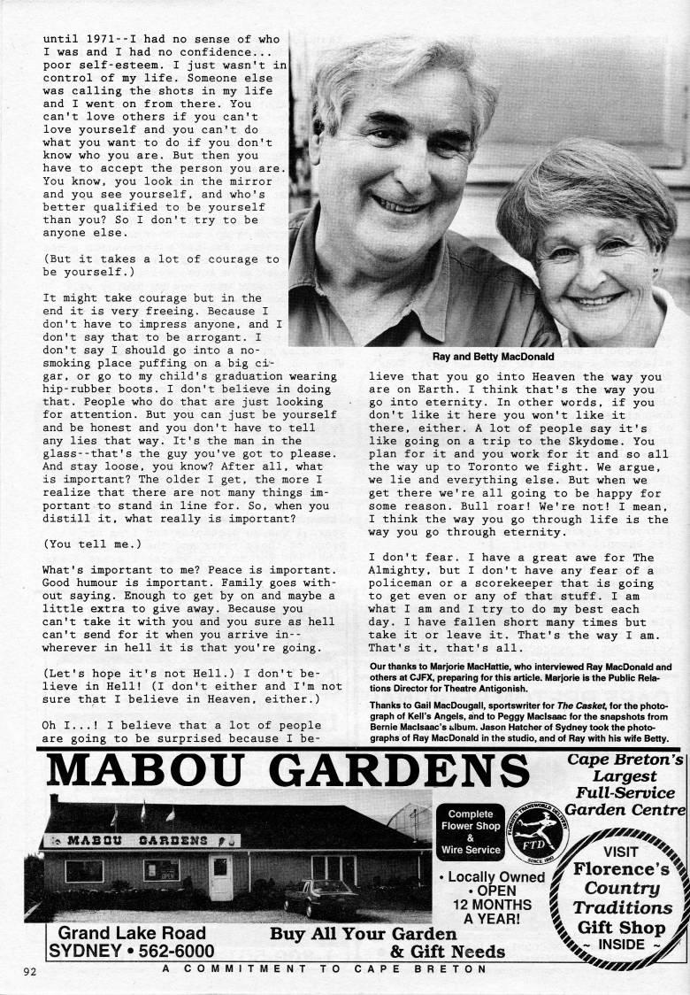 until 1971--I had no sense of who I was and I had no confidence... poor self-esteem. I just wasn't in control of my life. Someone else was calling the shots in my life and I went on from there. You can't love others if you can't love yourself and you can't do what you want to do if you don't know who you are. But then you have to accept the person you are. You know, you look in the mirror and you see yourself, and who's better qualified to be yourself than you? So I don't try to be anyone else. (But it takes a lot of courage to be yourself.) It might take courage but in the end it is very freeing. Because I don't have to impress anyone, and I don't say that to be arrogant. I don't say I should go into a no- smoking place puffing on a big ci? gar, or go to my child's graduation wearing hip-rubber boots. I don't believe in doing that. People who do that are just looking for attention. But you can just be yourself and be honest and you don't have to tell any lies that way. It's the man in the glass--that's the guy you've got to please. And stay loose, you know? After all, what is important? The older I get, the more I realize that there are not many things im? portant to stand in line for. So, when you distill it, what really is important? (You tell me.) What's important to me? Peace is important. Good humour is important. Family goes with? out saying. Enough to get by on and maybe a little extra to give away. Because you can't take it with you and you sure as hell can't send for it when you arrive in-- wherever in hell it is that you're going. (Let's hope it's not Hell.) I don't be? lieve in Hell! (I don't either and I'm not sure that I believe in Heaven, either.) Oh I...! I believe that a lot of people are going to be surprised because I be- I MJA Ray and Betty MacDonald lieve that you go into Heaven the way you are on Earth. I think that's the way you go into eternity. In other words, if you don't like it here you won't like it there, either. A lot of people say it's like going on a trip to the Skydome. You plan for it and you work for it and so all the way up to Toronto we fight. We argue, we lie and everything else. But when we get there we're all going to be happy for some reason. Bull roar! We're not! I mean, I think the way you go through life is the way you go through eternity. I don't fear. I have a great awe for The Almighty, but I don't have any fear of a policeman or a scorekeeper that is going to get even or any of that stuff. I am what I am and I try to do my best each day. I have fallen short many times but take it or leave it. That's the way I am. That's it, that's all. Our thanks to Marjorie MacHattie, who interviewed Ray MacDonald and others at CJFX, preparing for this article. Marjorie is the Public Rela? tions Director for Theatre Antigonish. Thanks to Gail MacDougall, sportswriter for The Casket, for the photo? graph of Kell's Angels, and to Peggy Maclsaac for the snapshots from Bernie MacIsaac's s'lbum. Jason Hatcher of Sydney took the photo? graphs of Ray MacDonald in the studio, and of Ray with his wife Betty. MABOU GARDENS Cape Breton's Largest Full-Service Garden Centre Grand Lake Road SYDNEY • 562-6000 Buy All Your Garden & Gift Needs COMMITMENT TO CAPE BRETON