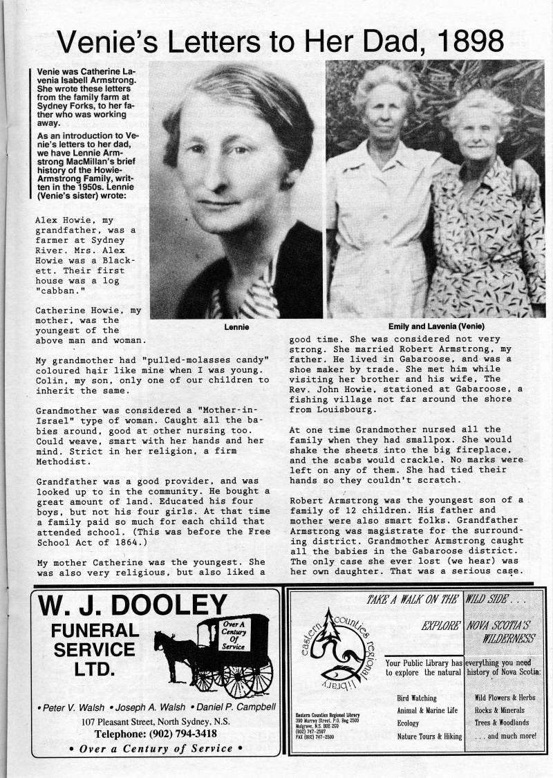 Published by Ronald Caplan on 1994/1/1 (561 reads)Venie's Letters to Her Dad, 1898 Venie was Catherine La- venia Isabell Armstrong. She wrote these letters from the family farm at Sydney Forks, to her fa? ther who was working away. As an introduction to Ve? nie's letters to her dad, we have Lennie Arm? strong MacMillan's brief history of the Howie- Armstrong Family, writ? ten in the 1950s. Lennie (Venie's sister) wrote: Alex Howie, my grandfather, was a farmer at Sydney- River. Mrs. Alex Howie was a Black- ett. Their first house was a log "cabban." Catherine Howie, my mother, was the youngest of the above man and woman. My grandmother had "pulled-molasses candy" coloured hair like mine when I was young. Colin, my son, only one of our children to inherit the same. Grandmother was considered a "Mother-in- Israel" type of woman. Caught all the ba? bies around, good at other nursing too. Could weave, smart with her hands and her mind. Strict in her religion, a firm Methodist. Grandfather was a good provider, and was looked up to in the community. He bought a great amount of land. Educated his four boys, but not his four girls. At that time a family paid so much for each child that attended school. (This was before the Free School Act of 1864.) My mother Catherine was the youngest. She was also very religious, but also liked a Emily and Lavenia (Venie) good time. She was considered not very strong. She married Robert Armstrong, my father. He lived in Gabaroose, and was a shoe maker by trade. She met him while visiting her brother and his wife. The Rev. John Howie, stationed at Gabaroose, a fishing village not far around the shore from Louisbourg. At one time Grandmother nursed all the family when they had smallpox. She would shake the sheets into the big fireplace, and the scabs would crackle. No marks were left on any of them. She had tied their hands so they couldn't scratch. Robert Armstrong was the youngest son of a family of 12 children. His father and mother were also smart folks. Grandfather Armstrong was magistrate for the surround? ing district. Grandmother Armstrong caught all the babies in the Gabaroose district. The only case she ever lost (we hear) was her own daughter. That was a serious case. W, J. DOOLEY FUNERAL SERVICE LTD. • Peter V. Walsh • Joseph A. Walsh * Daniel P. Campbell 107 Pleasant Street, North Sydney, N.S. Telephone: (902) 794-3418 • Over a Century of Service • TAMA WALK ON THE EXPLORE 'Bjq Esslem Counties Regional library 390 Murray Street. P.O. Bag 2500 Mulgrave, N.S. BOE 2G0 (902) 747-2597 FAX (902) 747-2500 Your Public Library has] c'f to explore the natura Bird Watching Animal & Marine Life Ecology Nature Tours & Hiking WILD SIDE. . . NOVASCOTM'S WMEimSS I everything you need history of Nova Scotia: Wild Flowers k Herbs Rocks & Minerals Trees k Woodlands . . . and much more!