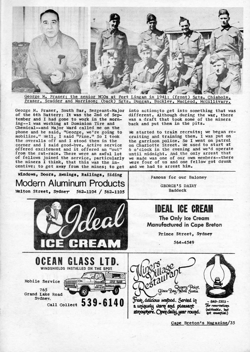 m'j George M. Fraser; the senior NCOs at Fort Lingan in 1941; (front) Sgts. Chisholm. Fraser. Scudder and Morrison; (back) Sgts. Duggan. Buckley. MacLeod. McGillivary. George M. Fraser, South Bar, Sergeant-Major of the 6th Battery: It was the 2nd of Sep? tember and I had gone to work in the morn? ing • I was working at Dominion Tire and Chemical • and Major Ward called me on the phone and he said, "George, we're going to mobilize." iVell, I said "Fine." So I took the overalls off and I stood thera in the corner and I said good-bye. Active service offered exciteraent and it offered an "out" from the rat-race. There were an awful lot of fellows joined the service, particularly the miners I think, that this was the in? centive: to get away frora the raines; to get into action;to get into something that was different. Although during the war, there was a draft that took some of the miners back and put them in the pits. 'Ate started to train recruits; we began re? cruiting and training them. I was put on the garrison police. So I went on patrol on Charlotte Street. We used to start at 6 o'clock in the evening and we'd operate until midnight. And the only arrest that we made was one of our own members • there were four of us and one fellow got drunk and we had to arrest him. Windows, Doors' Avmings, Railings, Siding Modern Aluminum Products '.'felton Street, Sydney* Faraous for our Baloney GEORGE'S DAIRY Baddeck IDEAL ICE CREAM The Only ice Cream Manufactured in Cape Breton Prince Street, Sydney 564-4549 OCEAN GLASS LTD. WINDSHIELDS INSTALLED ON THE SPOT Mobile Service 765 Grand Lake Road Sydnev, Call Collect 539-6140 Jre&i;' ddicious scafbod. S'f'' 'l %r resenlatioQs (?dtKsat)U, but itjOt osseijtuil) Cape Breton's Magazine/35
