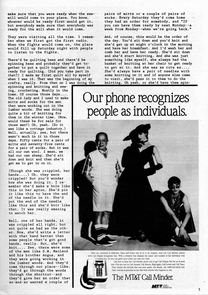 Published by Ronald Caplan on 1994/8/1 (239 reads)make sure that you were ready when the saw? mill would come to your place. You know, whoever would be ready first would get it, but everybody made sure that everybody was ready for the mill when it would come. They were visiting all the time. I remem? ber when we first got the first radio. When the fights would come on, the place would fill up Saturday night with people to listen to the fights. There'd be quilting bees and there'd be spinning bees and probably they'd get to? gether to put a quilt together and have it ready for quilting. (Did you take part in that?) I made my first quilt all by myself when I was 16. That was the beginning of my crafts, really. From then on I was doing the spinning and knitting and sew- ing, crocheting. Mostly in the home. Of course those days.... The old lady and I used to make mitts and socks for the men that were working out in the lumber woods. She was doing quite a bit of knitting for them in the winter time. (Now, would these be for sale for those men?) Oh, yeah. (So it was like a cottage industry.) Well, actually, yes, but there wasn't much in it in those days. Fifty cents for a pair of mitts and seventy-five cents for a pair of socks. But it was all our own wool. I mean, we had our own sheep. She'd sit down and knit and then she'd get me to get in on it. (Though she was crippled, her hands....) Oh, they were crippled! But you'd wonder how she was doing it, I re? member she'd make a hole like this in her apron. She'd pin it like this to have the end of the needle in it. She'd put the end of the needle like this and she'd knit like that. It was really amazing to watch her. Well, one of her hands, it was crippled all right, but not quite as bad as the oth? er. Now, she'd write a letter with that hand better than some people that's got good hands, really. But, she'd knit.... See, there were some of the men like D.W. MacLeod and his brother Angus, and they were going working in the lumber woods. And they'd come through our place--like, they'd go through the woods through the shortcut--and they'd give her an order'that so-and-so wanted a couple of pairs of mitts or a couple of pairs of socks. Every Saturday they'd come home they had an order for somebody, and "If you can have them ready by next Monday--a week from Monday--when we're going back." And, of course, this would be the order of the day. You'd sit down and you'd knit and she'd get up at eight o'clock in the morning and have her breakfast. And I'd wash her and comb her and have her ready. She'd sit down and she'd start knitting. And she was just something like myself, she always had the basket of knitting at her chair to get ready to get at it. And she was as cute as.... She'd always have a pair of needles with some knitting on it and if anyone else came to visit, she'd pass it to them to do the knitting. Oh yeah, or she'd have them spin- Our phone recognizes people as individuals. After all, everyone is different. Each and every one of us is an original. And our Call Minder phone with Call Display recognizes that. With a window that displays the name' and number of the individual who is calling you. So you can greet your caller any way you wish. I ~ Call now to lease the Call Minder phone and to get Call Display free for an 8-week ?? S trial- Plus you can try Call Answer, Call Return, Ring Again, Call Screen and Call Trace. ~ 5 services that suit your needs. For details, call 1-800-565-0622 (toll- JJ free). And be as personal as you like with anyone who happens to call. iJ TheMT&TCaUMinder.; AWTs