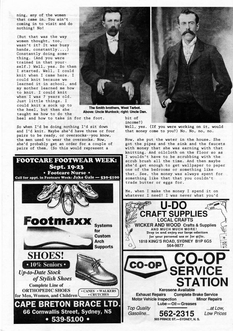 Published by Ronald Caplan on 1994/8/1 (228 reads)ning, any of the women that came in. You ain't coming in to visit and do nothing! No! (But that was the way women thought, too, wasn't it? It was busy hands, constantly...,) Constantly doing some? thing, (And you were trained in that your? self,) Well, yes. So then I started. Well, I could knit when I came here. I could knit because we learned it in school, and my mother learned me how to knit. I could knit when I was 7 years old. Just little things, I could knit a sock up to the heel, but then she taught me how to do the heel and how to take in for the foot The Smith brothers, Above: Uncle Murdock; So when I'd be doing nothing I'd sit down and I'd knit. Maybe she'd have three or four pairs to be ready, or oversocks--you know, the men used to wear the oversocks. Now, she'd probably get an order for a couple of pairs of them. (So this would represent a FOOTCARE FOOTWEAR WEEK: Sept. 19-23 • Footcare Nurse • Call ??or appt. In Footcare Week: Jake Gale • 539*5100 West Tarbot. right: Uncle Dan. bit of income?) Well, yes. (If you were working on it, would Fbotmaxji Systems for Custom Arch Supports • 10% Seniors • Up'tO'Date Stock of Stylish Shoes Complete Line of ORTHOPEDIC SHOES for Men, Women, and Children CANES 'WALKERS • CRUTCHES that money come to you?) No. No, no, no. Now, she put the water in the house. She got the pipes and the sink and the faucets with money that she was earning with that knitting. And oilcloth on the floor so as I wouldn't have to be scrubbing with the scrub brush all the time. And then maybe she'd get enough to get wallpaper to paper one of the bedrooms or something like that. See, the money was always spent for . something like that that you couldn't trade butter or eggs for. Me, when I make the money I spend it on whatever I need! I was never what you'd U-DO CRAFT SUPPLIES LOCAL CRAFTS WICKER AND WOOD Crafts & Supplies AND MUCH MUCH MORE Drop in and enjoy our large selection jor your personal use or Jor gtjts. 1818 KING'S ROAD, SYDNEY B1P6G5 564-9877 CO-OP SERVICE STATION CAPE BRETON BRACE LTD. 66 Cornwallis Street, Sydney, NS • 539-5100 • Kerosene Available Exhaust Repairs Complete Brake Service Motor Vehicle Inspection Minor Repairs Lu be • Oi I • G reases Top Quality ...at Low, Gasoline... 562-2315 Low Prices 503 PRINCE ST. • SYDNEY, N. S.